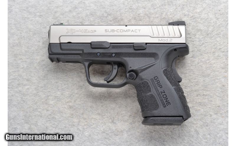 Description: This Springfield Armory Model XD-45 ACP Mod. 2 Sub-Compact is a semi-automatic .45 ACP Cal. pistol. It has a 3.5 inch barrel with a stainless steel slide. Grip Zone grips. In overall excellent condition it comes as is in its original case with Owners Manual, gun lock, one 9 round magazine and one 13 round magazine. SOLD Caliber Info: .45 ACP Chambers: 9 shot magazine. Metal Condition: Excellent. Bore Condition: Excellent. Barrels: 3.5 inches. Stainless steel slide. Stock: Textured grip black polymer. Bottom accessory rail. Weight: 27 oz. Sights: Green bar high visibility front. Two white dot notch rear. Item Location: Richfield, WI |
