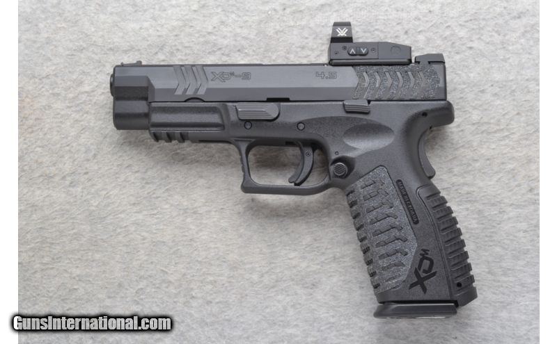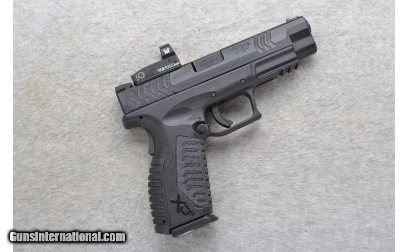 Description: This Springfield Armory Model XDm-9 is a semi-auto pistol in 9x19 Cal. It has a 4.5 inch barrel and textured grip black polymer grip that has Talon grip added. In addition to the blade front sight and rear notch sight a Vortex Venom 3 MOA red dot sight has been added. In overall very good condition it comes as is in its original case with Owners Manual, gun lock, two 19 round magazines, extra changeable back straps and sight mount bases. SOLD Caliber Info: 9x19 Cal. Chambers: 19 shot magazine. Metal Condition: Very Good. Bore Condition: Excellent. Barrels: 4.5 inches. Black slide. Stock: Textured grip black polymer grip with Talon grip added. Bottom accessory rail. Weight: 30 oz. Sights: Red bar high visibility front. Notch rear with two white dots. Vortex Venom 3 MOA sight. Item Location: Richfield, WI |