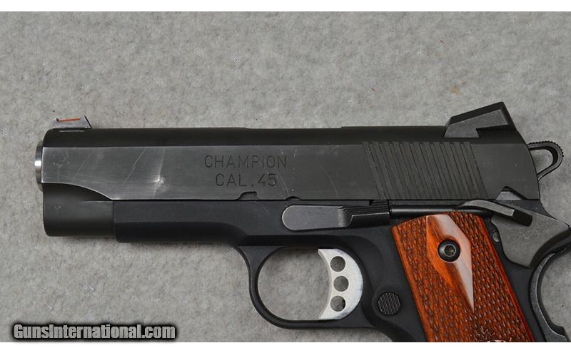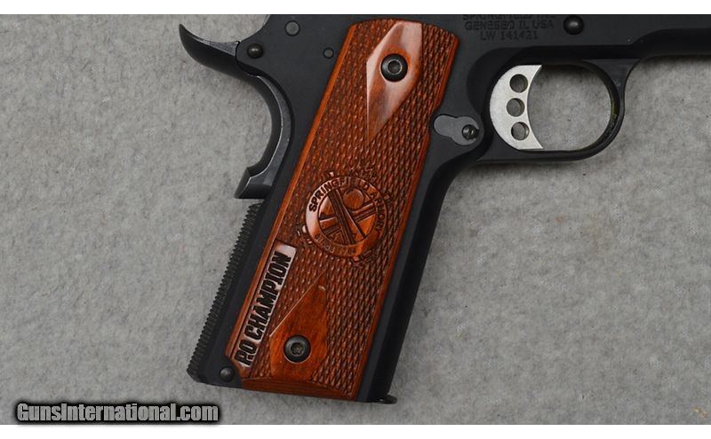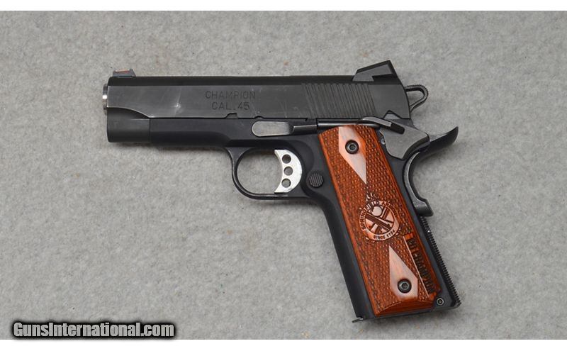 Description: Springfield Champion chambered in .45 Auto is in Good condition. It has a some wear on the slide and the inside of the trigger guard. It also features wooden Springfield Armory checkered grips with "RO CHAMPION" written on the bottom of each side of the grip. .45 Auto SOLD Metal Condition: Good condition with handling marks on the slide Wood Condition: Very good condition with some dings on the right grip Bore Condition: Clean and shiny Barrels: 4 Butt Pad: Wooden Springfield Armory checkered grips Weight: 1 Lb 14 Oz Item Location: Fort Worth, TX |