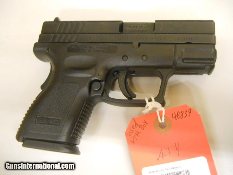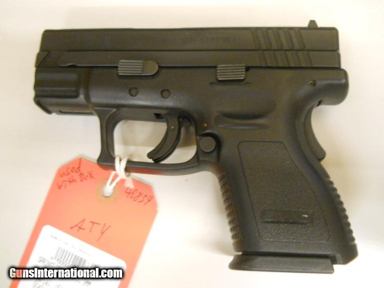 USED SPRINGFIELD XD9 SUB COMPACT SEMI AUTO PISTOL. 9MM CALIBER. 3 SIGHTS. 13RD MAGS.