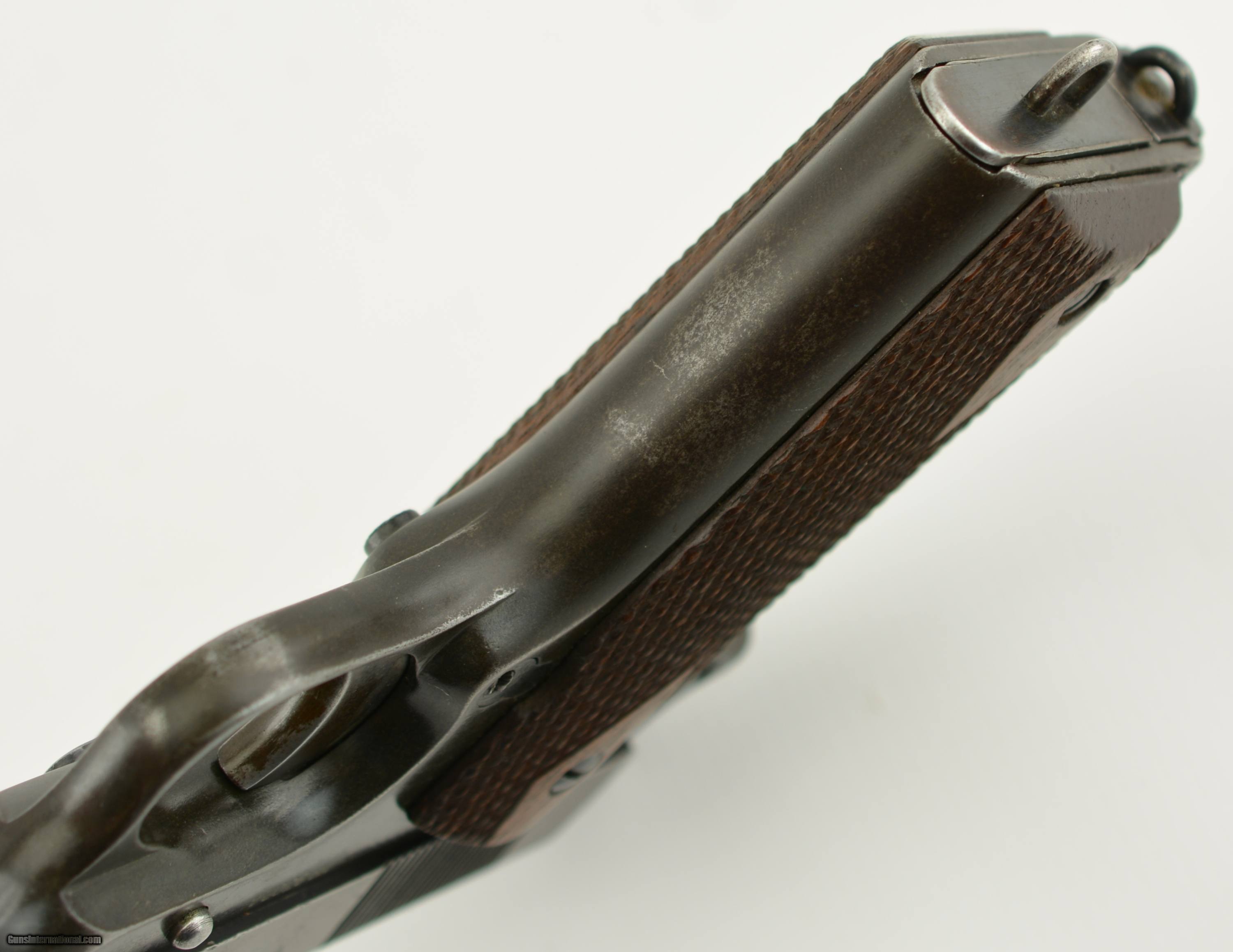 Description: Serial #83024, .45 ACP, 5" barrel with an excellent, bright bore. This is a 1915-made pistol that has an overall mottled gray patina on the slide, with some thin freckling and surface oxidation at front and rear. The frame retains about 80-85% of a nice, reblued finish, and also has silvering along the high edges. The pistol has a later, Colt marked barrel, and does not have any “S" marked parts. The checkered double-diamond walnut grips have 15 rows of checkering between the diamonds, and have some light wear around the edges, and mild flattening to the points. The two-tone, lanyard loop magazine is not Springfield-made. This is a great looking Springfield Armory Model 1911, and would make a shooter, or restoration project. FFL or C&R SOLD Curio/Relic: Yes Manufacturer: Spfld Model: 1911 Serial Number: 83024 Caliber Info: .45 Gauge Info: .45 |