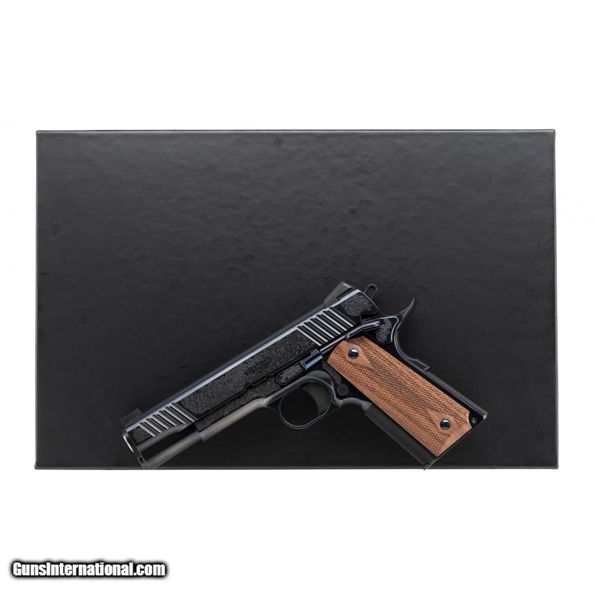 5"" Stainless steel match grade barrel. On top of the slide you will find high profile low-mount tactical sights. Comes in a beautiful blued finish with Deluxe Custom Engraving and Double Diamond rosewood grips. The medium solid match grade trigger and enhanced machined hammer combined gives you a crisp 4.5 trigger pull. NEW. UPC:854581007152