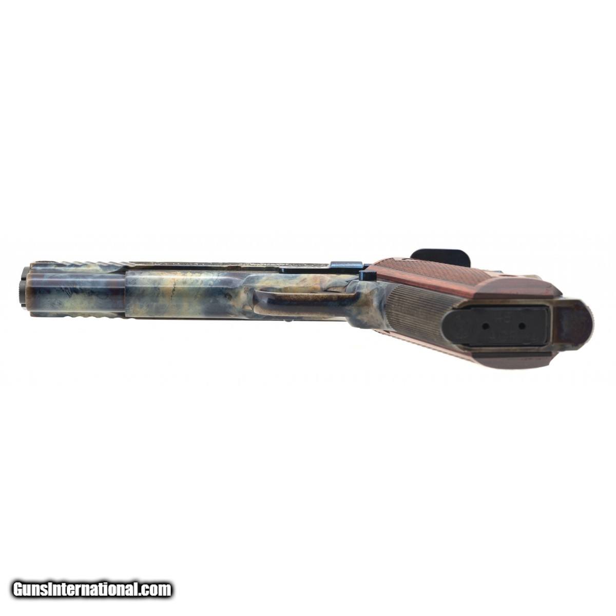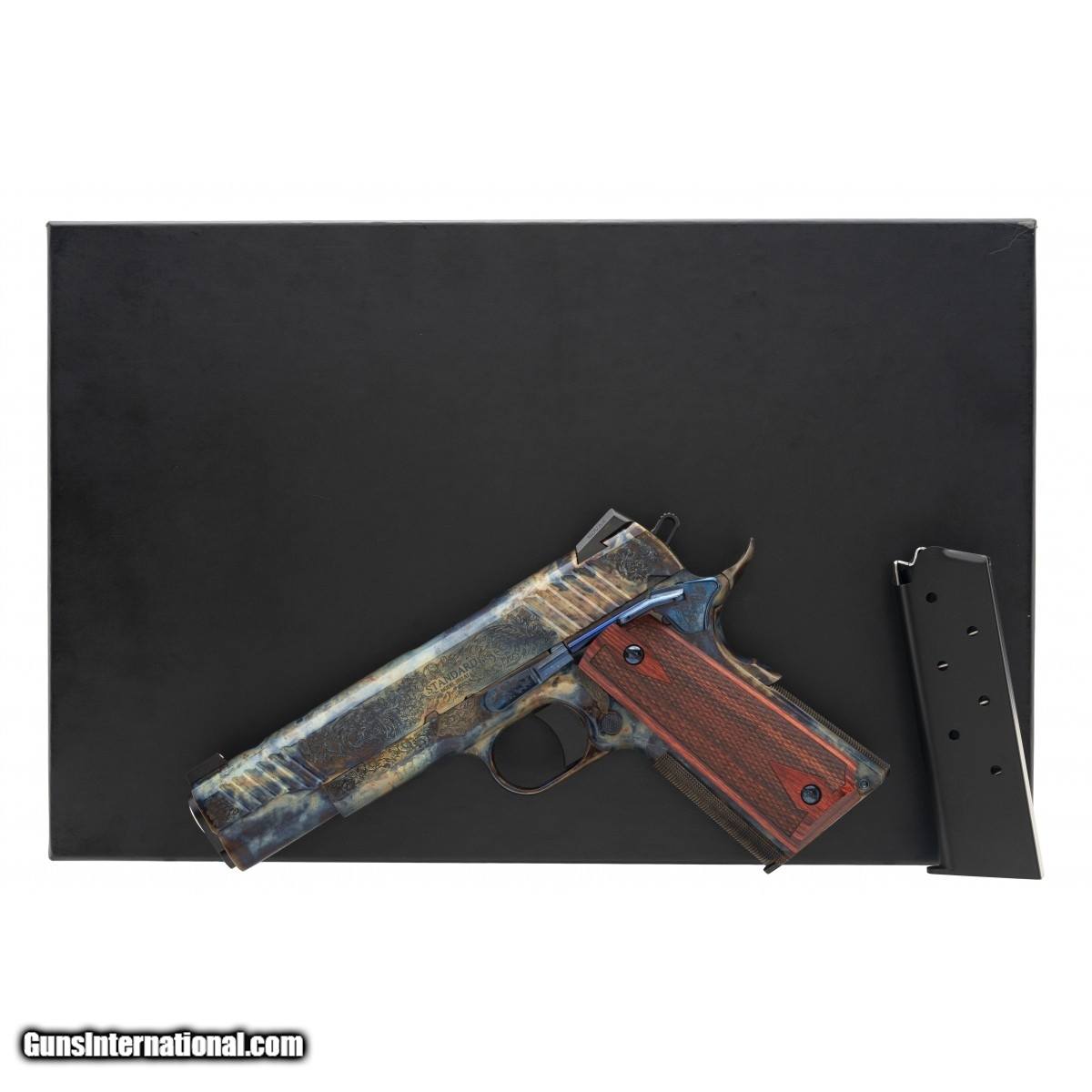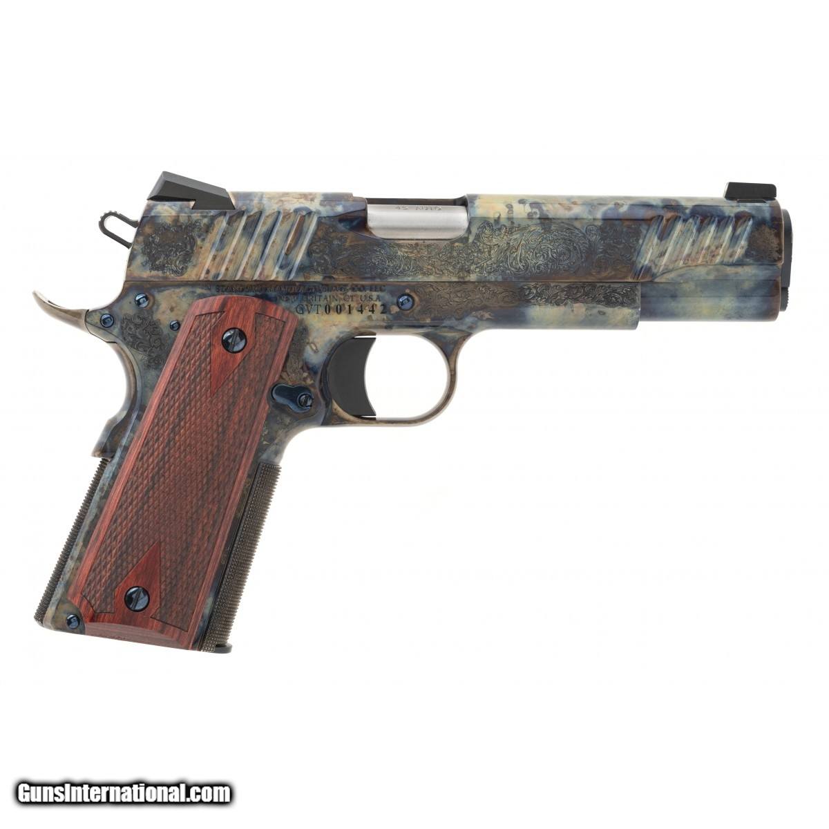 Description: " SN: GVT001442. Deluxe engraved 1911A1 pistol with case colored finish and fire blued small parts. Excellent condition with box. SOLD |