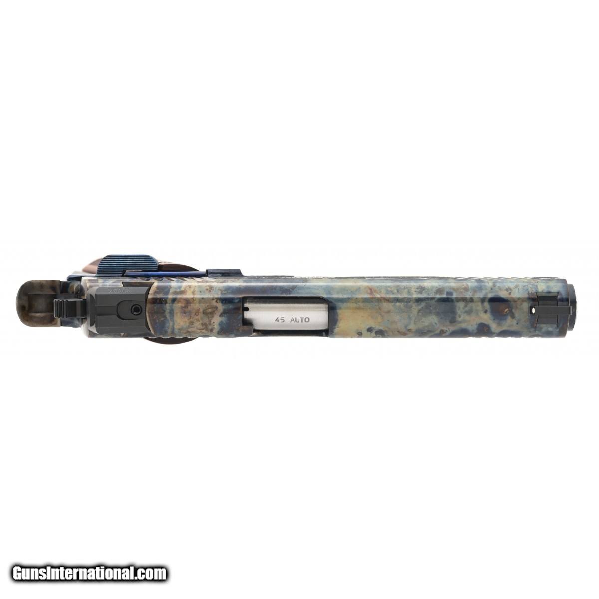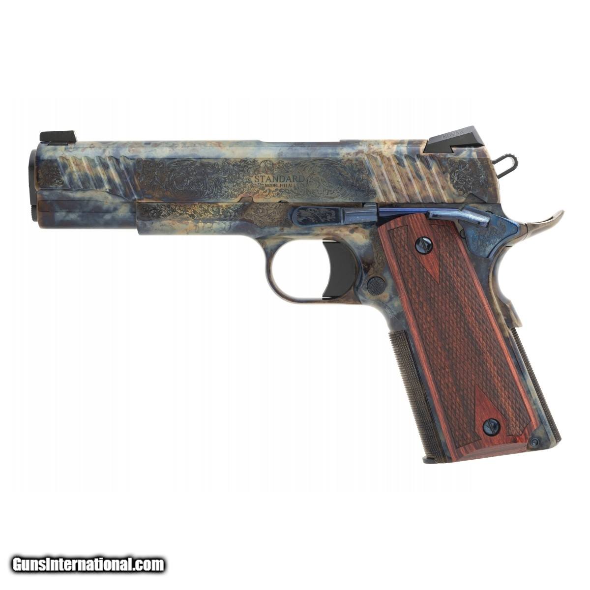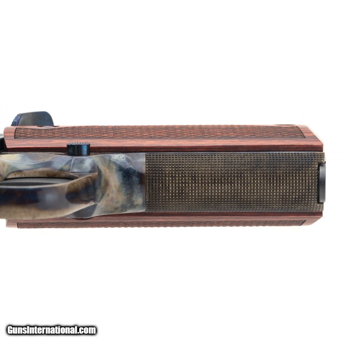 Description: " SN: GVT001442. Deluxe engraved 1911A1 pistol with case colored finish and fire blued small parts. Excellent condition with box. SOLD |
