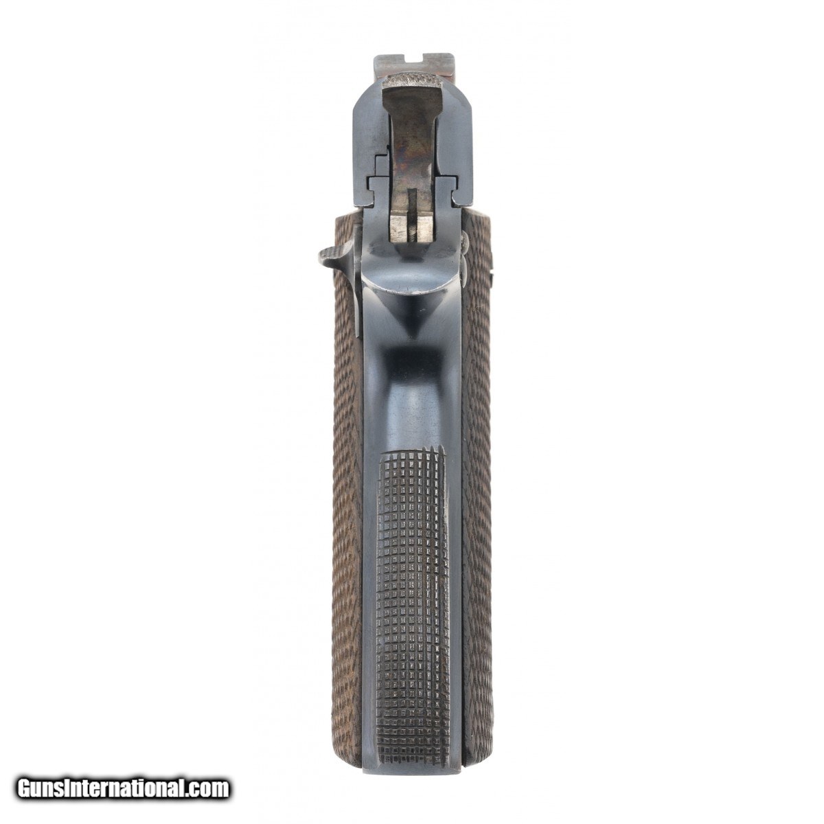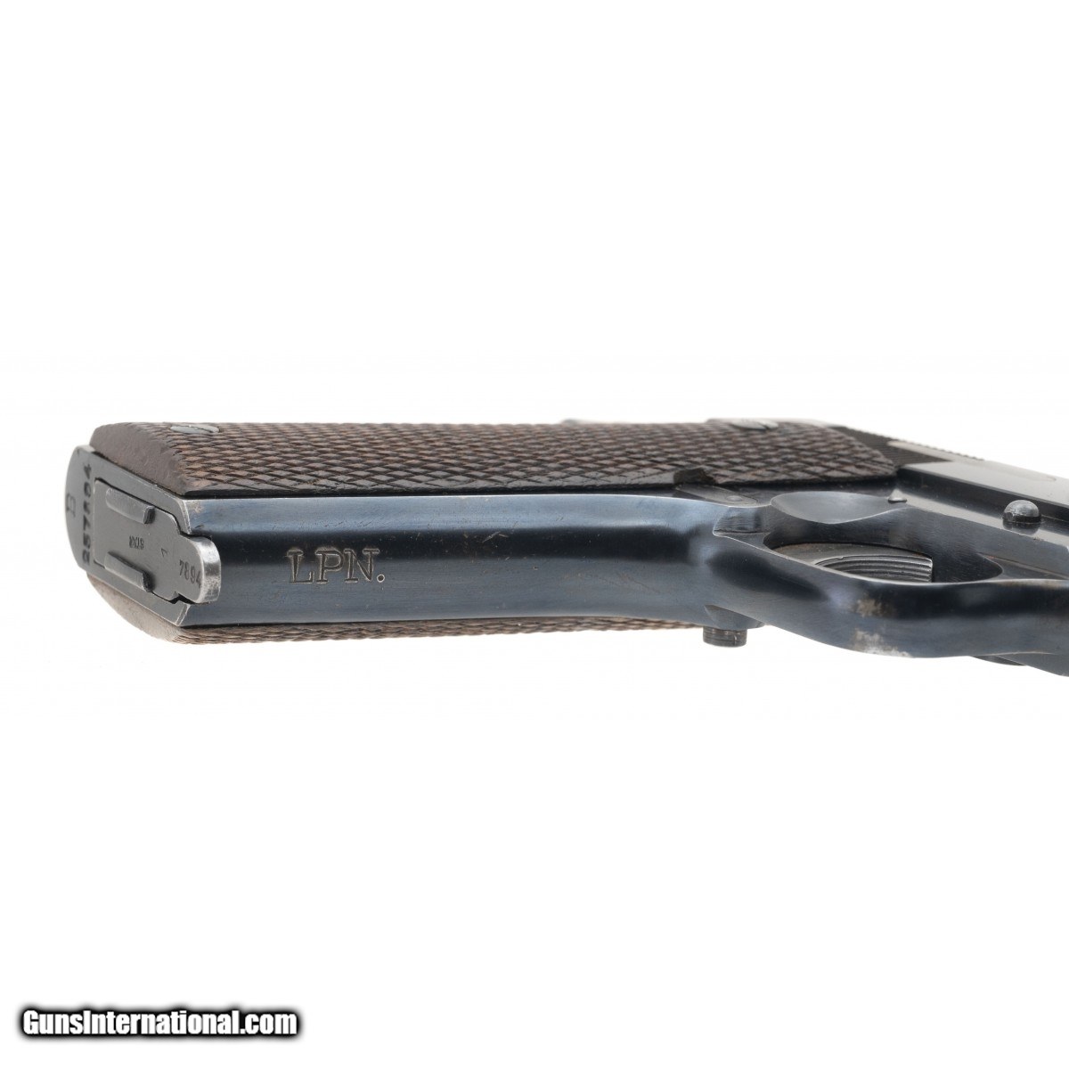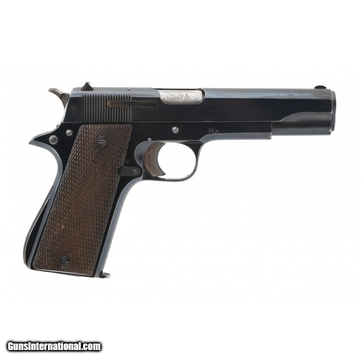Description: " SN: 257894. Made in 1944, 9mm, 5"" barrel. Bore is very good + & overall condition is good with service related wear. Military issue numbers matching example with original checkered wood grips & matching magazine. SOLD |