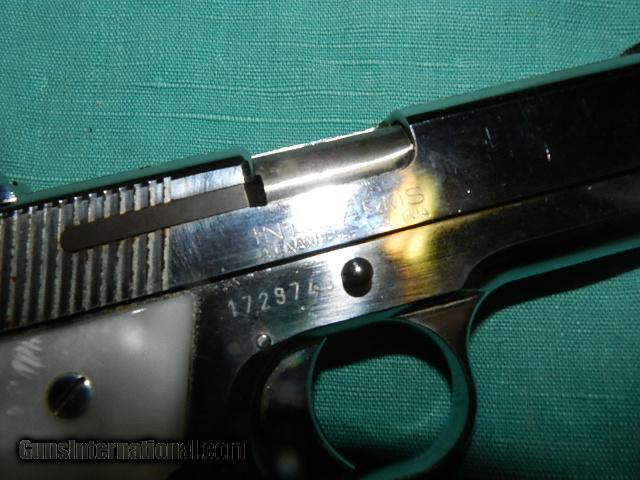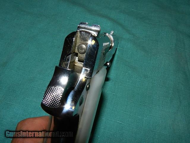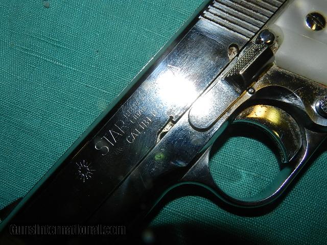 Description: This fine Star auto looks and takes down like a Colt 1911, but is a bit smaller in size , and would make a great carry gun for the potent 9mm round! This Spanish auto was sold through INTERAEMS Corp. in the 1960's through the 1970's, and the condition is excellent with all the finish except for a few small dings and shallow scratches from storage, and the slide serrations have some mild corrosion . Has one factory nickle mag. Finish remaining on this fine gun, is about 96%. The 3 3/4" bore is shiny and clean rifled. It has man made MOP grips in excellent condition. The Spaniards and Italians have made guns longer than anyone in the world, when they started making guns in the 1500's when most people were swinging from trees by their tail! Comes with one factory mag. It looks like this gun never left home!. We don’t have asite .I prefer money orders or a check. Item ships when funds come in. If you can only pay with a card let me know. I hope you like my wide selection of unusual guns, knives and gun parts. Shipping price determined by zip code. I try to keep the prices affordable, which means I make less money than most dealers. You won’t get altitude sickness with my prices! I consistently have the best selection of older guns If you BUY IT NOW you must still contact us for details buy it now doesn't end the sale, it just sends an email telling us you want to buy this gun. A phone call won’t secure a sale! Not home many times, the first buyer by email buys the gun !Thissite doesnot close down a sale when you do a BUY IT NOW like Ebay!I can get six buy it nows in an hour, first buyer to email gets the guns, others are in second place! Best to send another email . Sometimes not home to get calls. Some guns are required shipment to a gun dealer near you for a transfer to you when it arrives. With the widest selection of older guns at great prices, We don’t have a store, and sell on the internet only. SOLD |