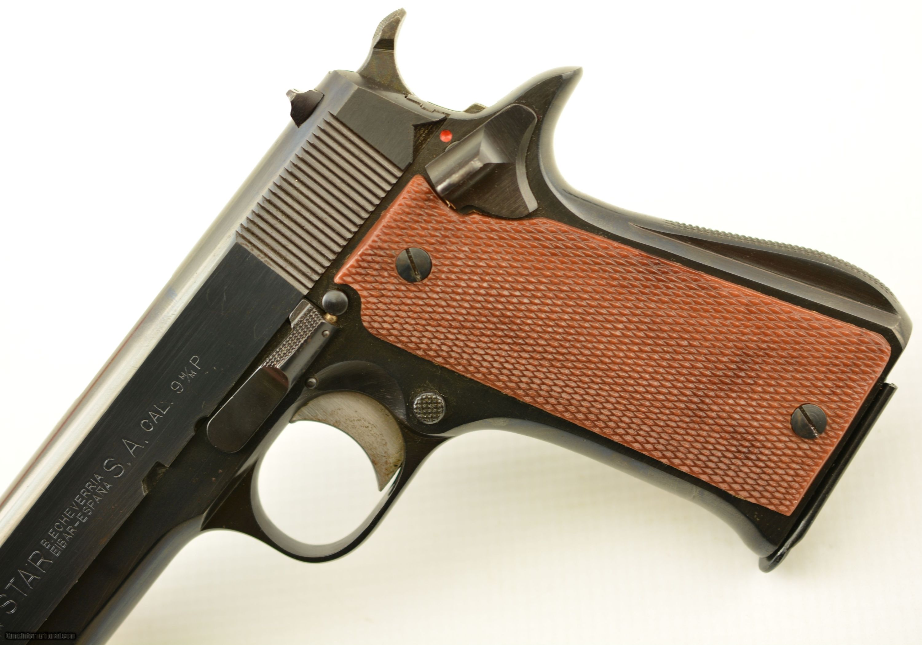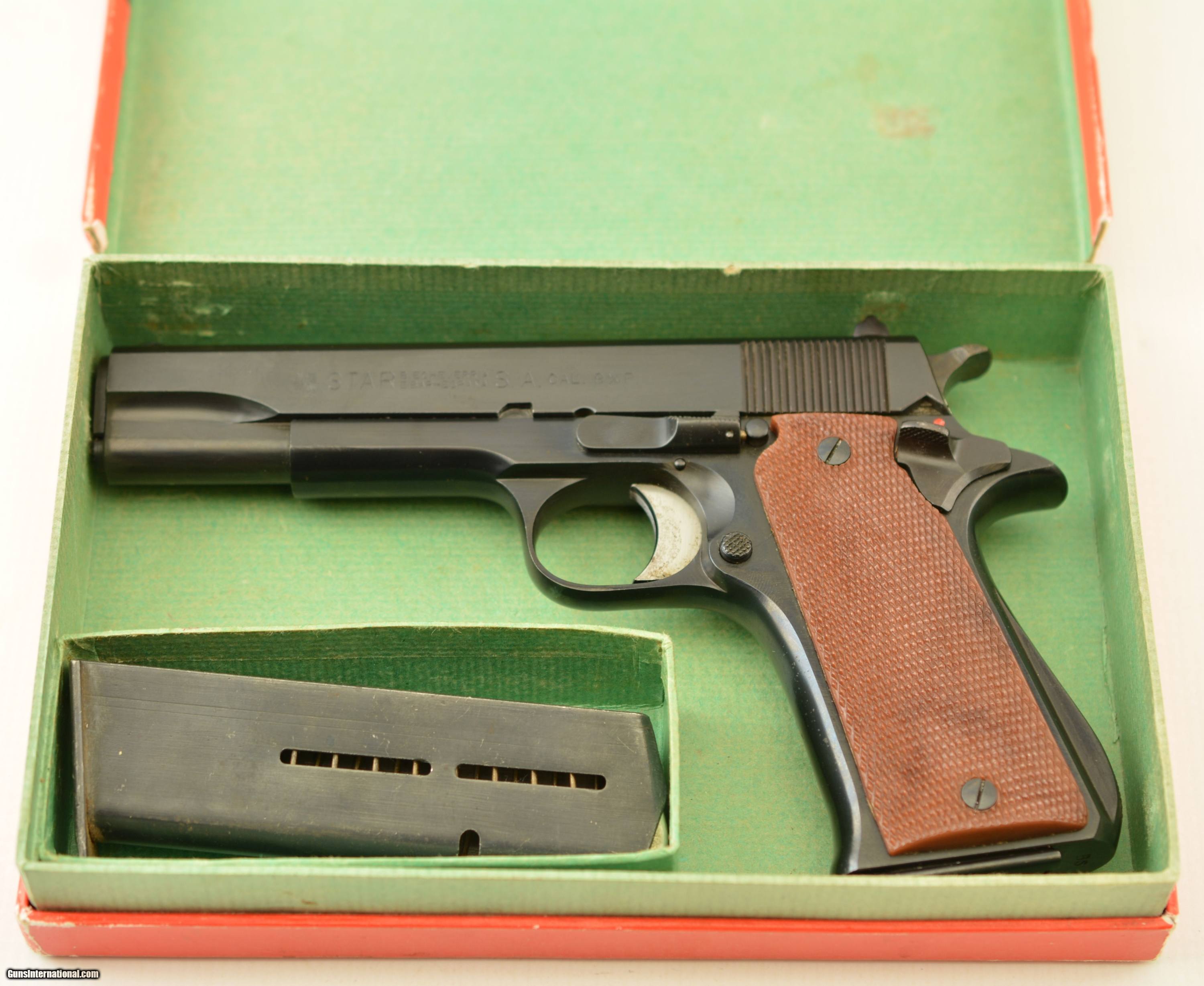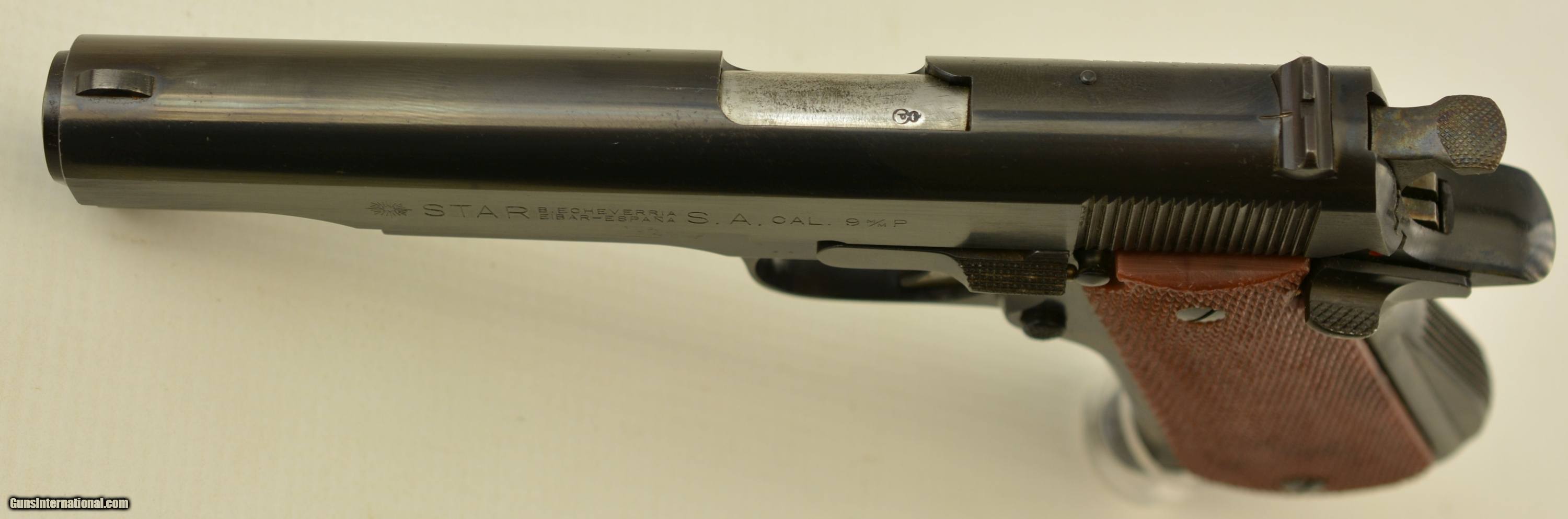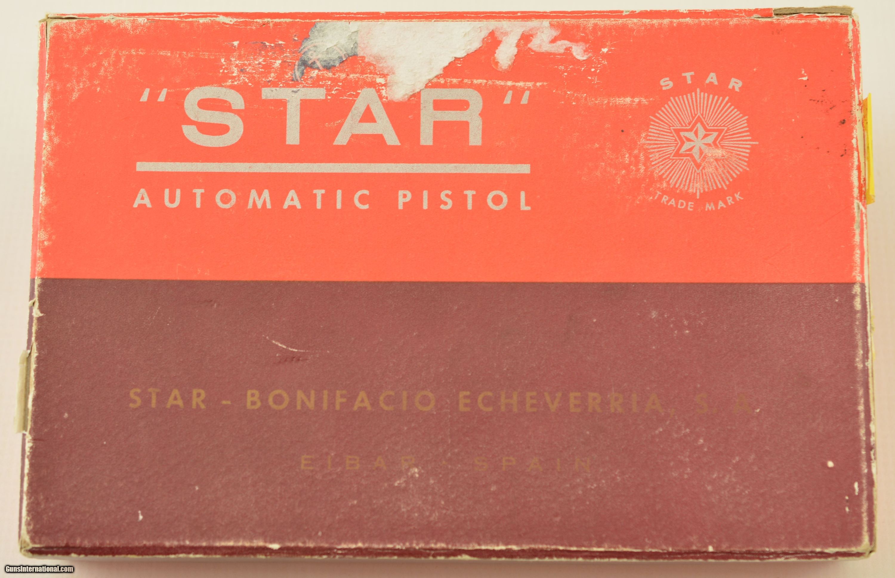 Description: Serial #1317888, 9mm Para., 5" barrel with an excellent, bright bore. This pistol is an early production example that has retained 92-95% of the original, high polish blue finish, but with some sparse surface freckling at the rear of the slide on the right side. Additionally, an importer mark has been added to the right side of the slide ahead of the ejection port. The hammer retains 60-70% of the original color case-hardening, with dark freckling present on the right side. The checkered plastic grips are in excellent, little-used condition. The pistol is housed in its original red, one-piece box with two original magazines. This is a nice early Model B Super and is in fine condition overall. FFL SOLD Manufacturer: Star Model: Super B Serial Number: 1317888 Caliber Info: 9mm Gauge Info: 9mm |