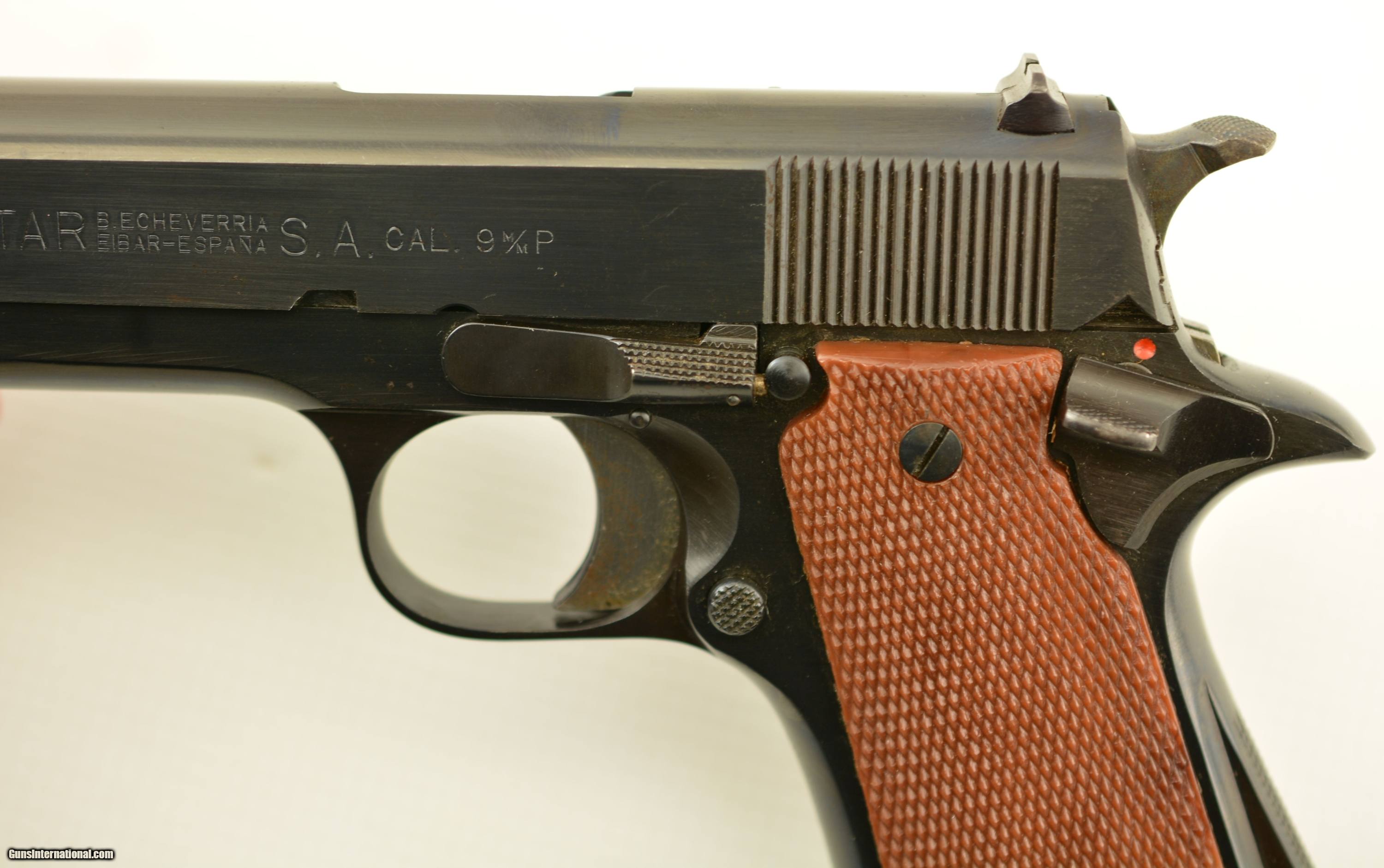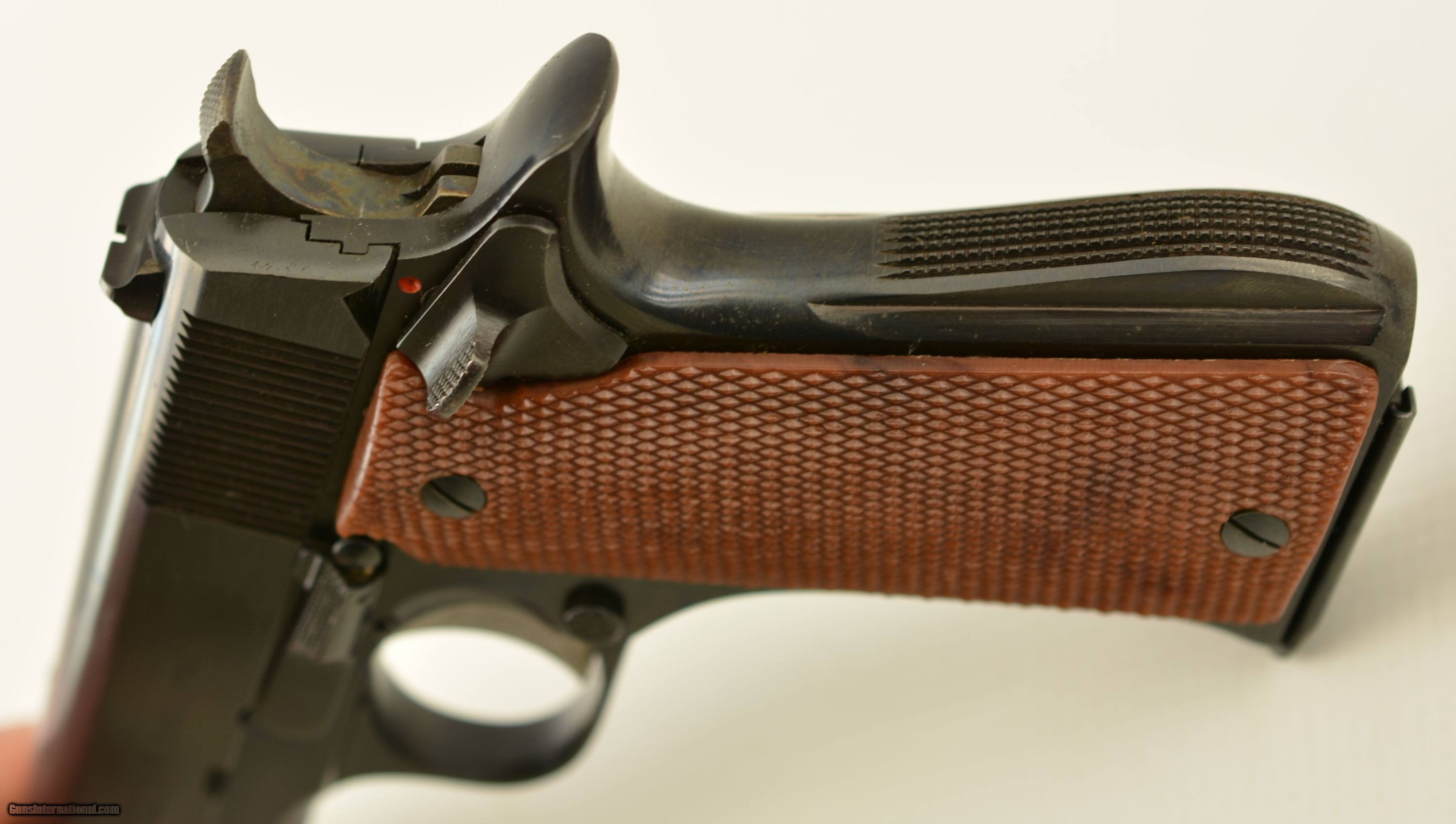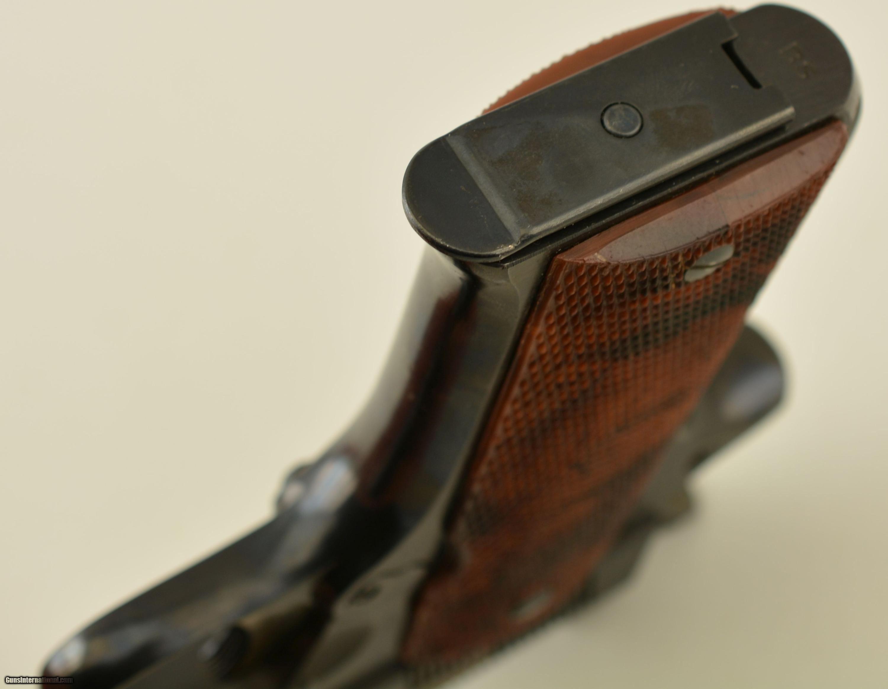 Description: Serial #1317888, 9mm Para., 5" barrel with an excellent, bright bore. This pistol is an early production example that has retained 92-95% of the original, high polish blue finish, but with some sparse surface freckling at the rear of the slide on the right side. Additionally, an importer mark has been added to the right side of the slide ahead of the ejection port. The hammer retains 60-70% of the original color case-hardening, with dark freckling present on the right side. The checkered plastic grips are in excellent, little-used condition. The pistol is housed in its original red, one-piece box with two original magazines. This is a nice early Model B Super and is in fine condition overall. FFL SOLD Manufacturer: Star Model: Super B Serial Number: 1317888 Caliber Info: 9mm Gauge Info: 9mm |