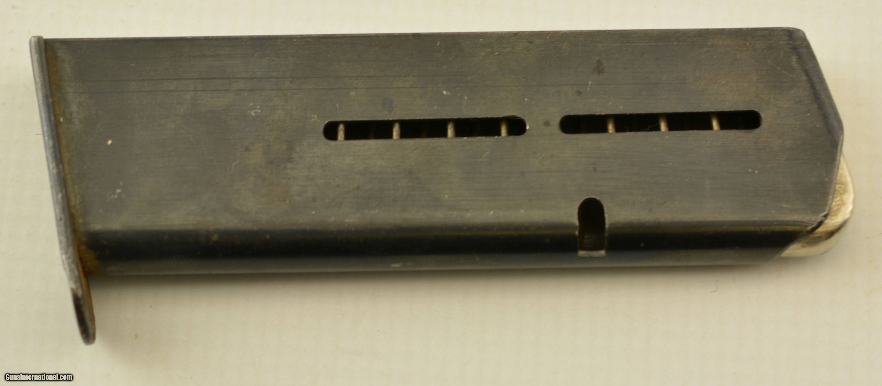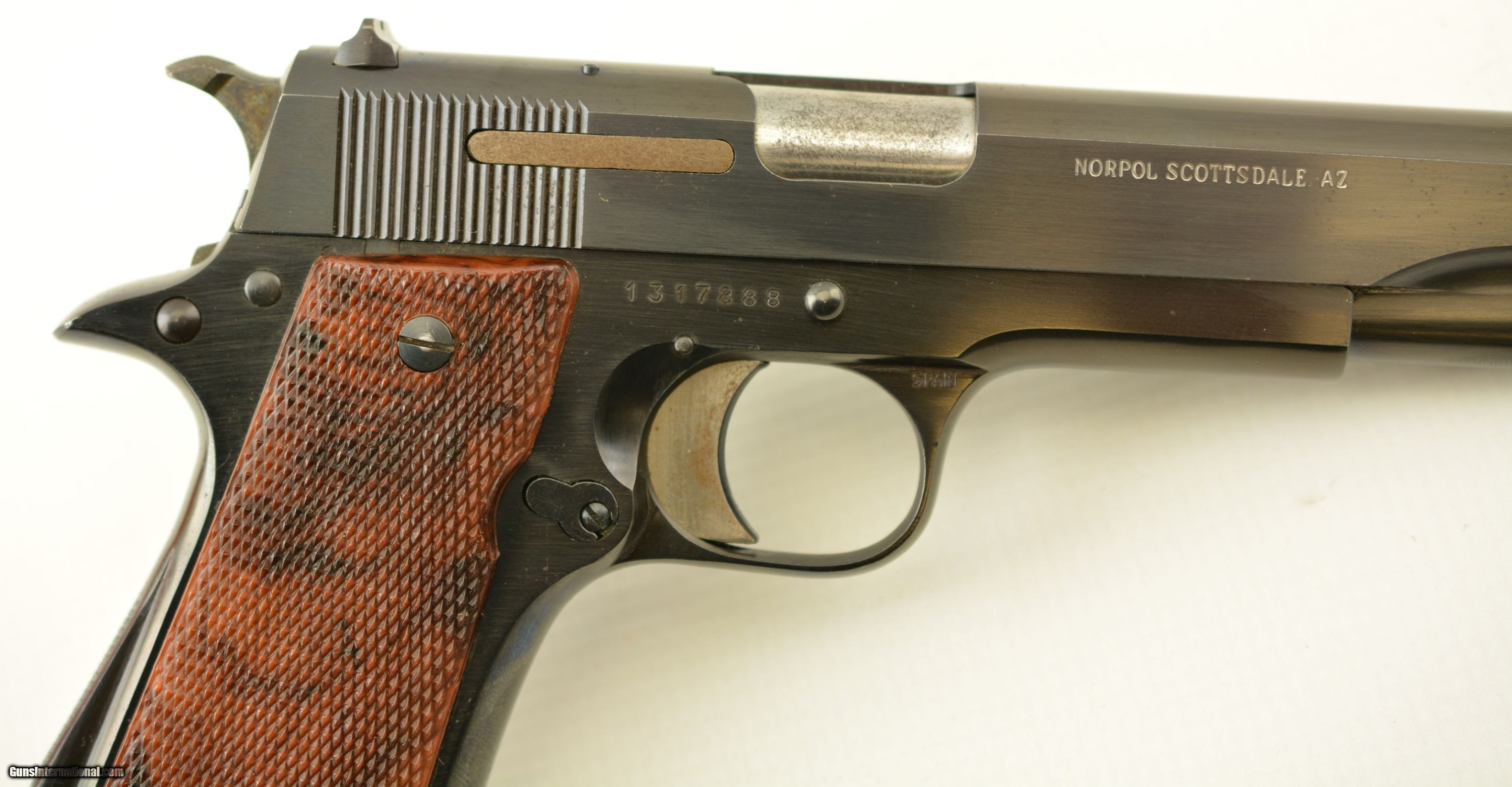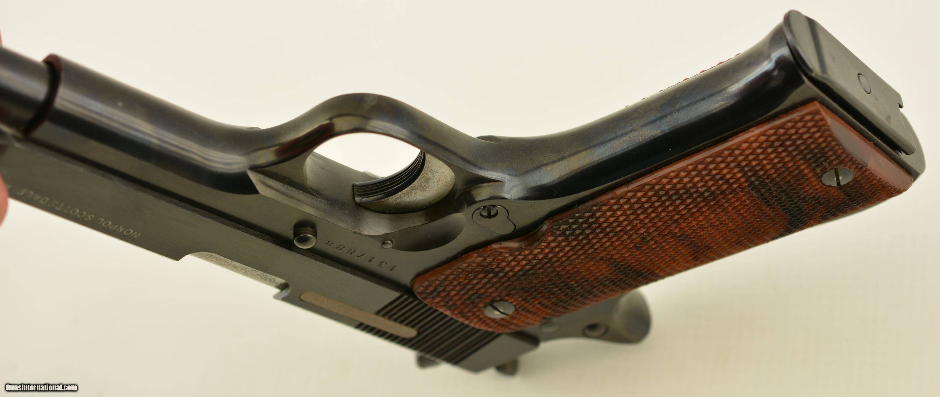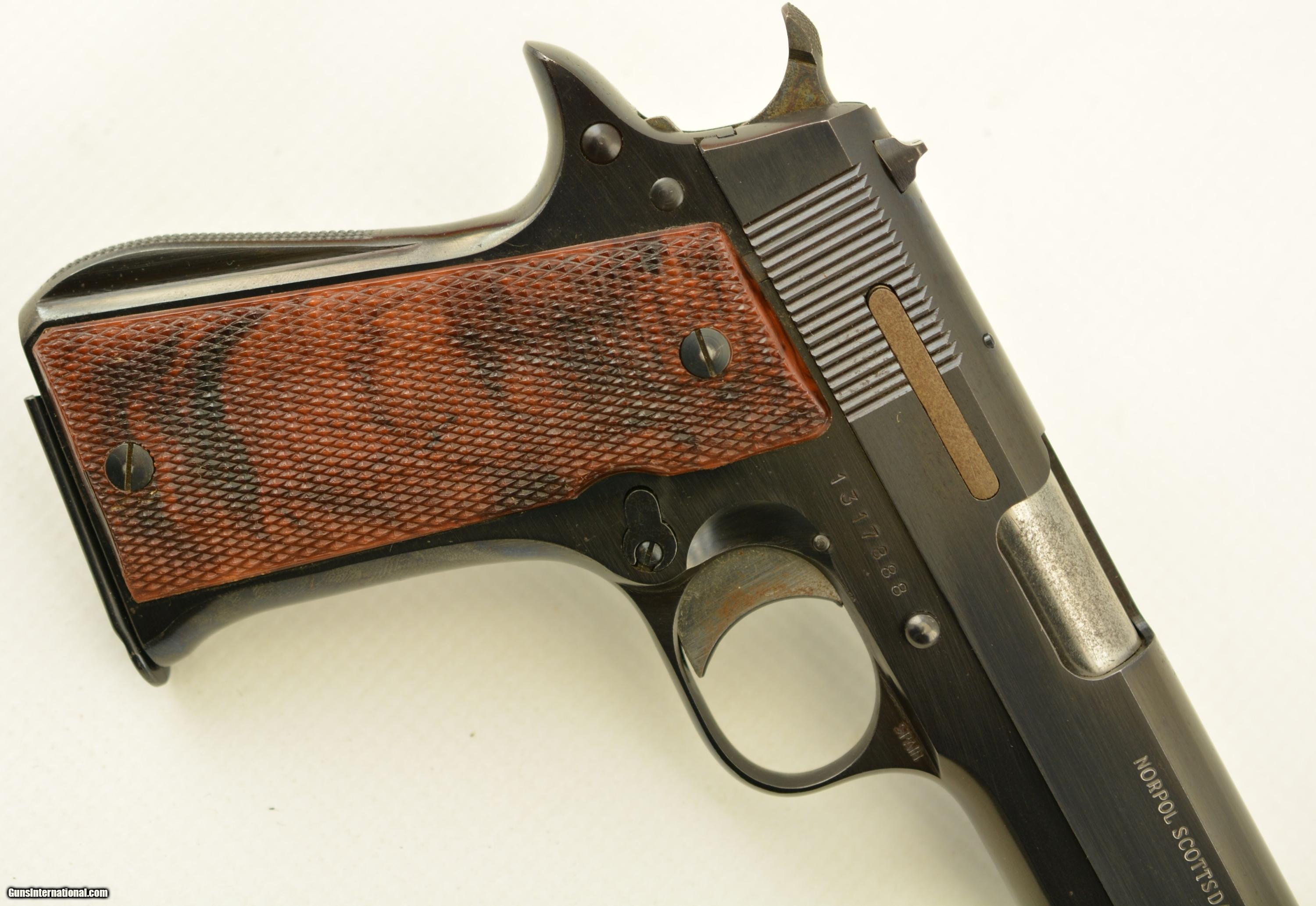 Description: Serial #1317888, 9mm Para., 5" barrel with an excellent, bright bore. This pistol is an early production example that has retained 92-95% of the original, high polish blue finish, but with some sparse surface freckling at the rear of the slide on the right side. Additionally, an importer mark has been added to the right side of the slide ahead of the ejection port. The hammer retains 60-70% of the original color case-hardening, with dark freckling present on the right side. The checkered plastic grips are in excellent, little-used condition. The pistol is housed in its original red, one-piece box with two original magazines. This is a nice early Model B Super and is in fine condition overall. FFL SOLD Manufacturer: Star Model: Super B Serial Number: 1317888 Caliber Info: 9mm Gauge Info: 9mm |