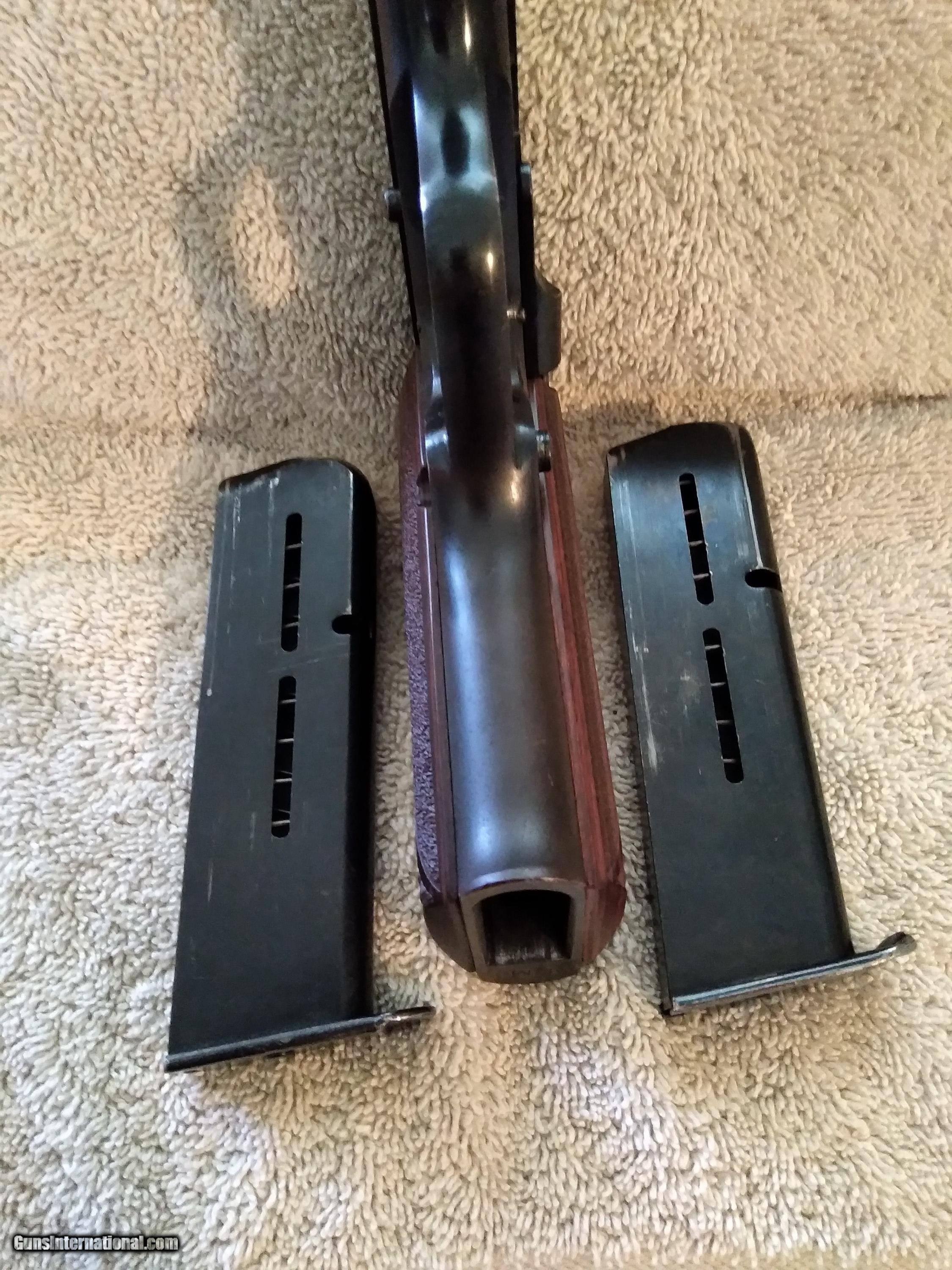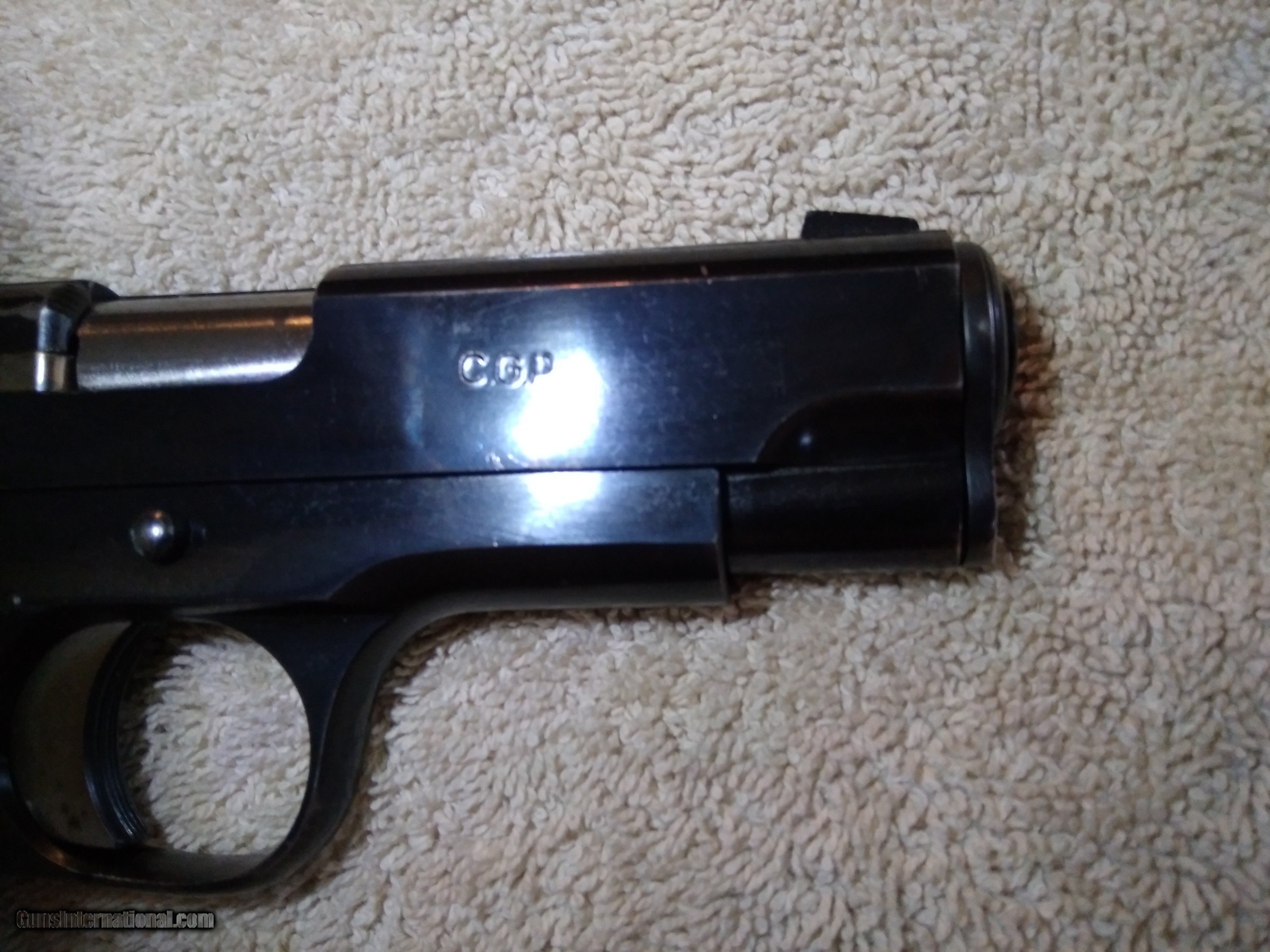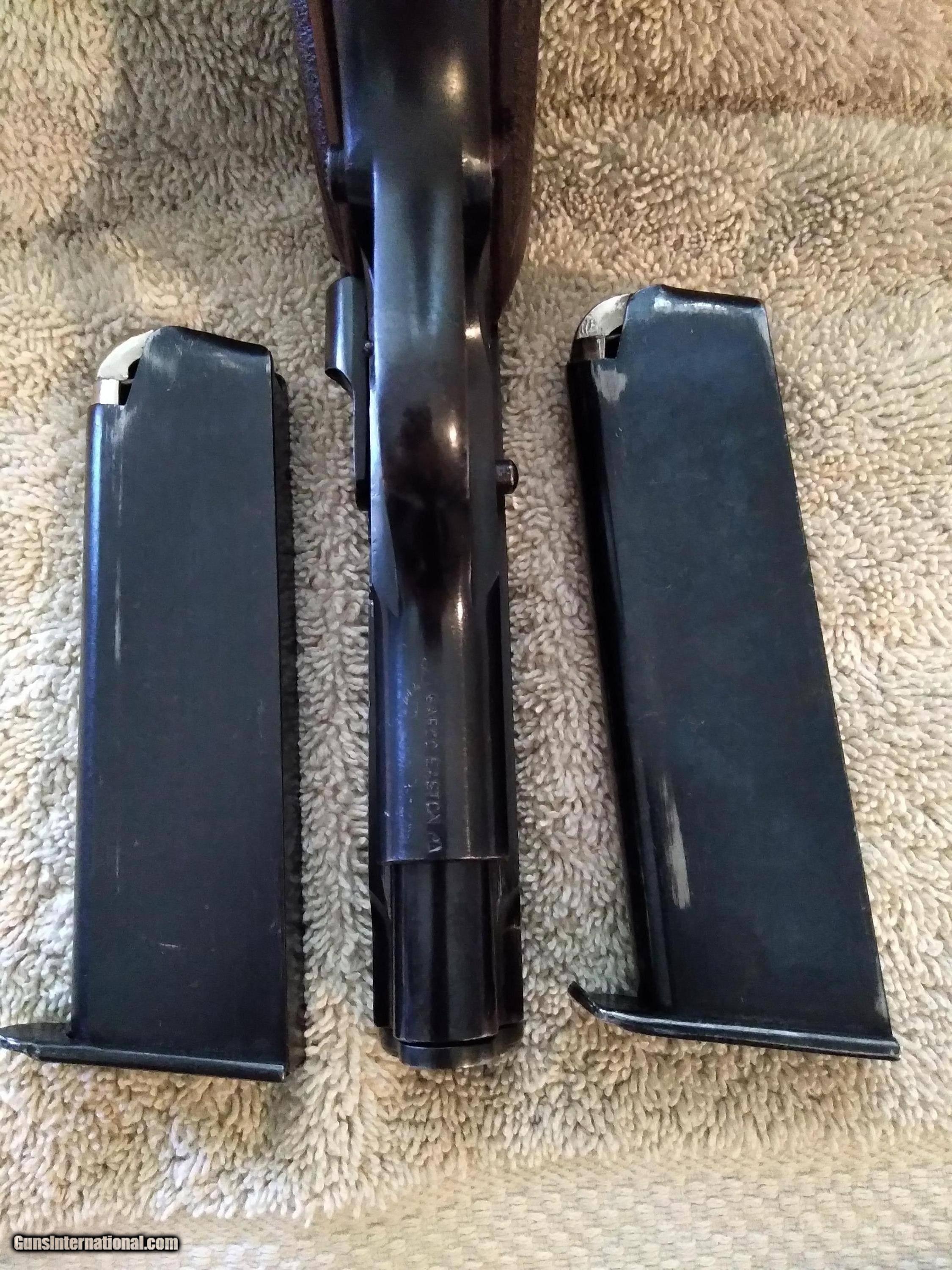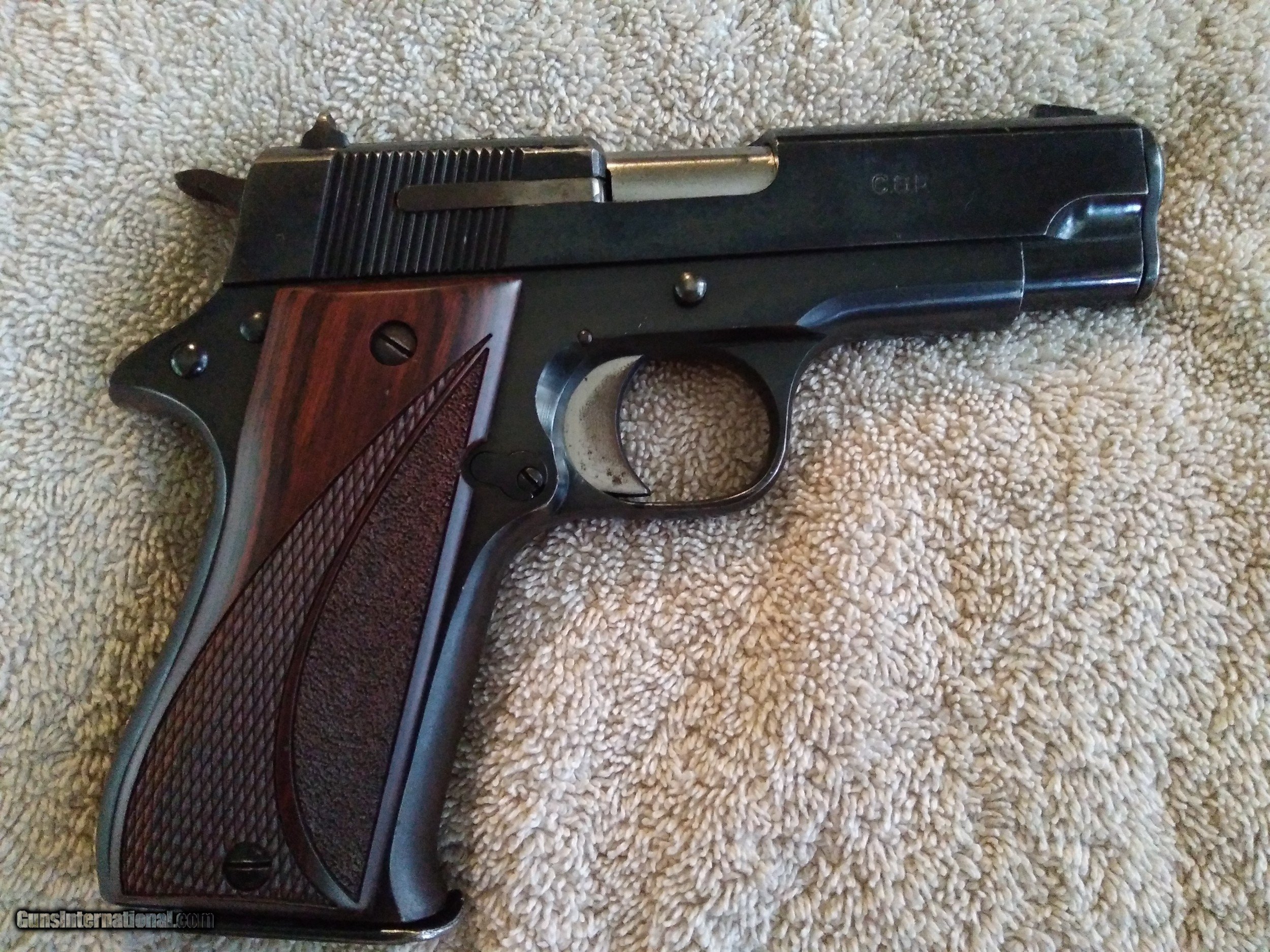 Description: SOLD STAR BM COMPACT SEMI-AUTOMATIC CALIBER 9mm HAMMER AND TRIGGER ARM CASE HARDENED SN # 1383041 ON LEFT FRAME BEHIND TRIGGER PROOF MARKS ON LEFT FRAME UNDER GRIP C.G.P. STANDS FOR: ( CUERPO GENERAL de POLICIA ) COCOBOLO WOOD GRIPS ORIGIONAL BLACK PLASTIC GRIPS INCLUDED BLUEING 96+ NO EDGE WEAR WORN BLUING ABOVE EXTRACTOR AND TOP OF LEFT SLIDE BELOW REAR SIGHT FRONT AND REAR GRIP STRAPS WORN BLUING WITH SLIGHT BROWN PATINA SARCO IMPORT MARK BOTTOM OF FRAME IN FRONT OF TRIGGER GUARD EXCELLENT BORE WITH STRONG RIFLING COMES WITH TWO MAGAZINES Shipping $20.00 USPS SOLD Curio/Relic: Yes Handgun Caliber: 9x19mm Parabellum (9mm Luger, 9x19mm NATO) Manufacturer: STAR Model: BM Serial Number: 1383041 Barrel Length: 3.77 in Bore: STRONG RIFLING Condition: Excellent Metal Condition: Excellent Wood Condition: Excellent Bore Condition: Excellent |
