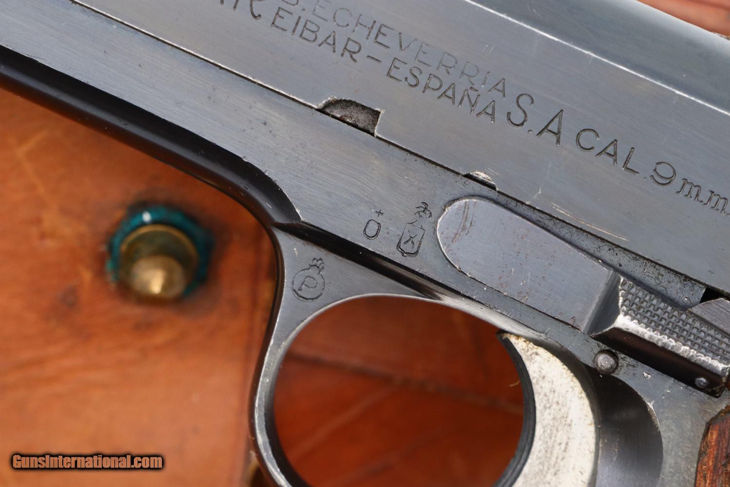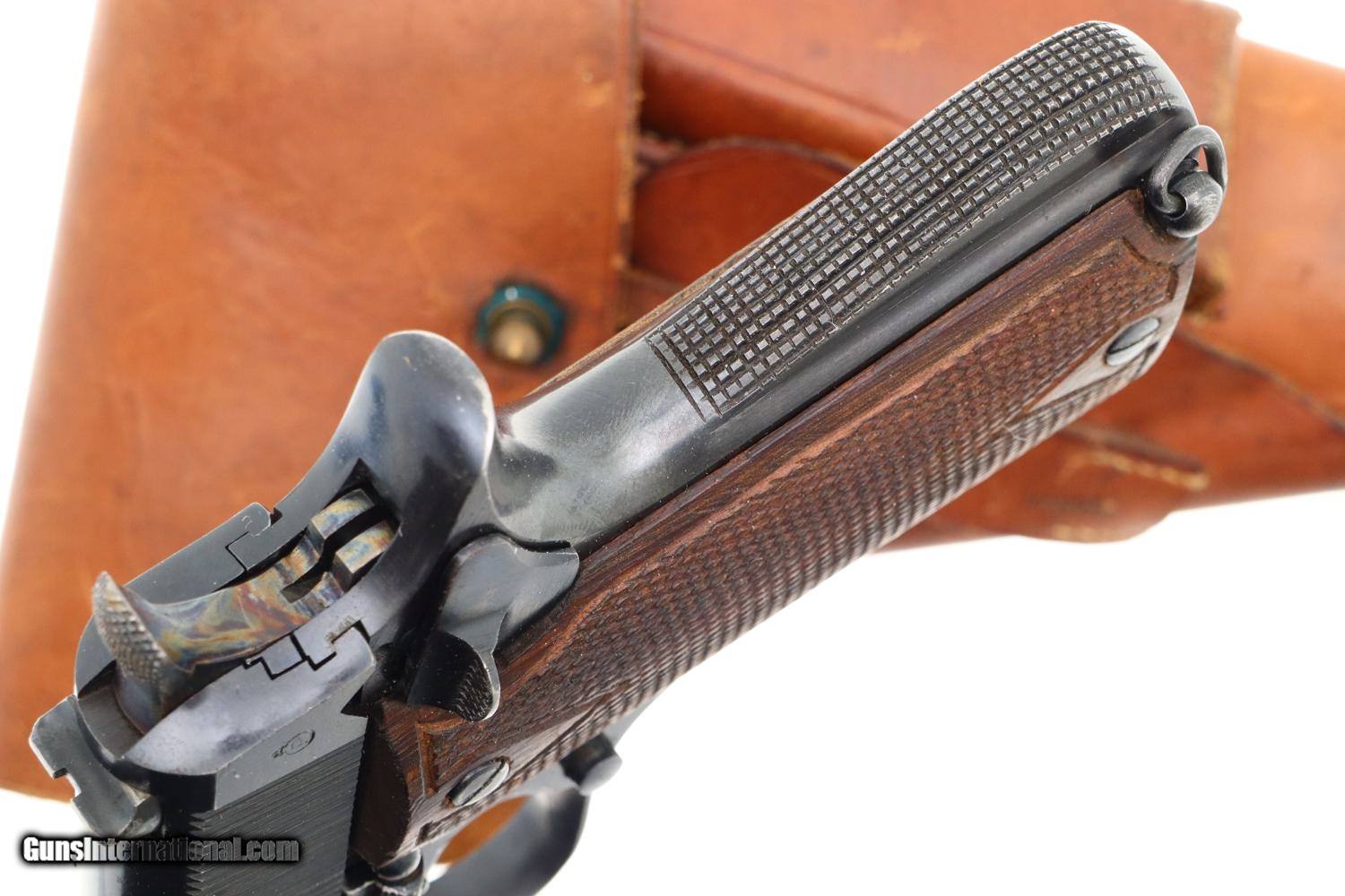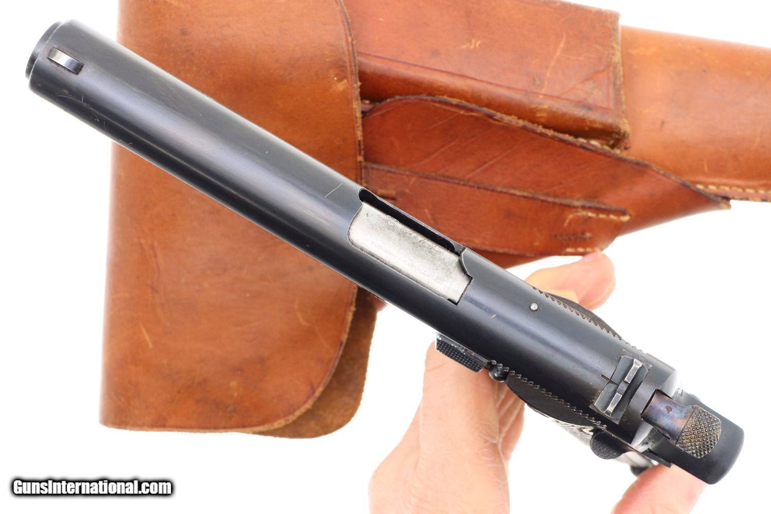 VG+ original salt blue with holster wear as imaged. Mild discoloration on sides of trigger. Bright color case hardening on hammer. Comparable condition checkered grips and magazine. Bright bore with sharp rifling. Perfect manual mechanics. VG holster with scuffing and staining as imaged. Intact stitching showing no repair. A very attractive, no excuses, Start Model B with holster as used by the German Military in 1944.
