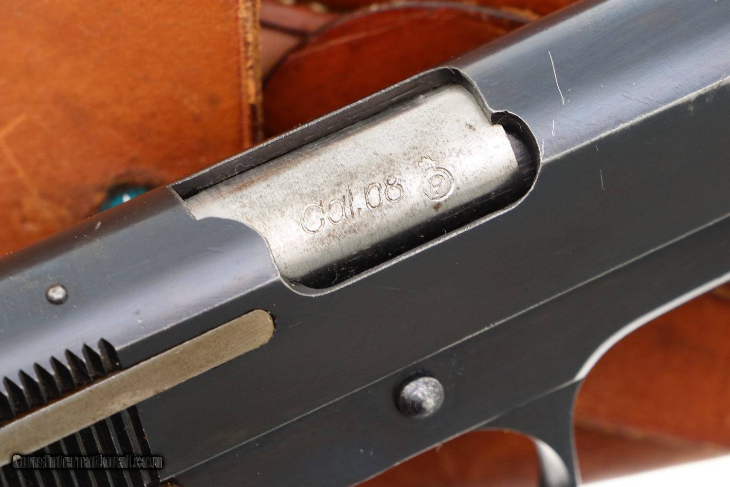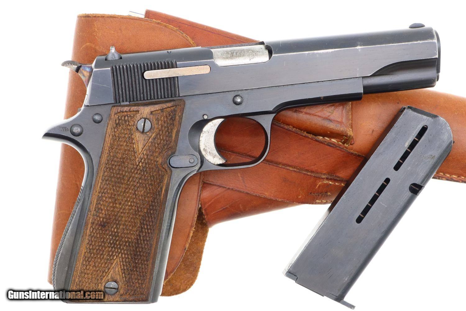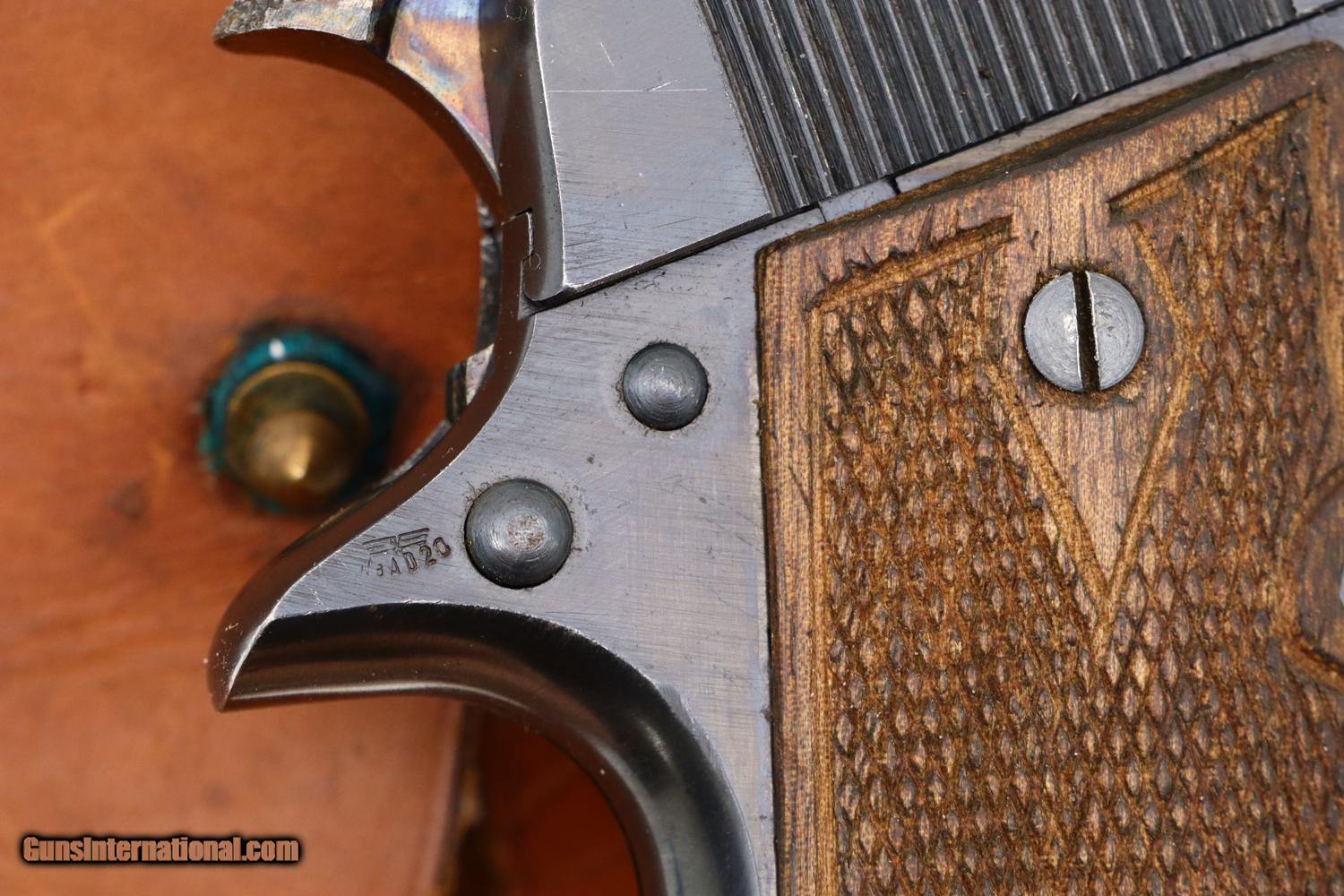 VG+ original salt blue with holster wear as imaged. Mild discoloration on sides of trigger. Bright color case hardening on hammer. Comparable condition checkered grips and magazine. Bright bore with sharp rifling. Perfect manual mechanics. VG holster with scuffing and staining as imaged. Intact stitching showing no repair. A very attractive, no excuses, Start Model B with holster as used by the German Military in 1944.