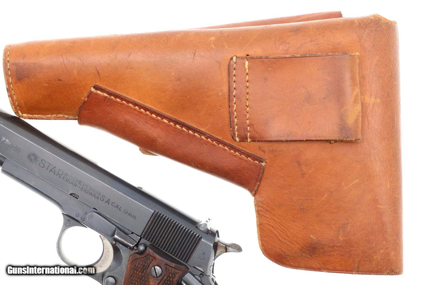 Original Star Model B, one of 8000 pistols delivered to the German Military in June 1944, marked with the WaAD20 on right tang, with the correct Star magazine and holster. SN: 249268. Cal: 9mmP. Standard configuration Star Model B. Left side of slide with the usual two line address denoting Star’s location and caliber. Left side of frame with proofing triad including the letter “O” reflecting proofing in 1944. Encircled pistol proof repeated at the rear of the left slide and on exposed chamber that is otherwise marked Cal .08. No import markings. Checkered walnut grips with large diamonds around screws. Magazine with two indicator slots on the right side and a “STAR” marked floorplate secured with two folds. Complete with a unmarked tan holster whose strap is secured with a brass stud, exactly as shown in the reference book Star Firearms on page 342.