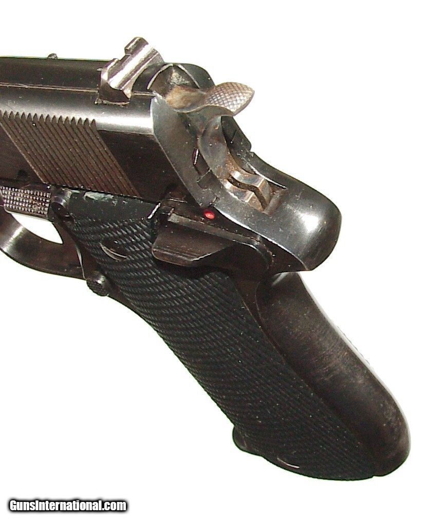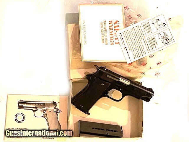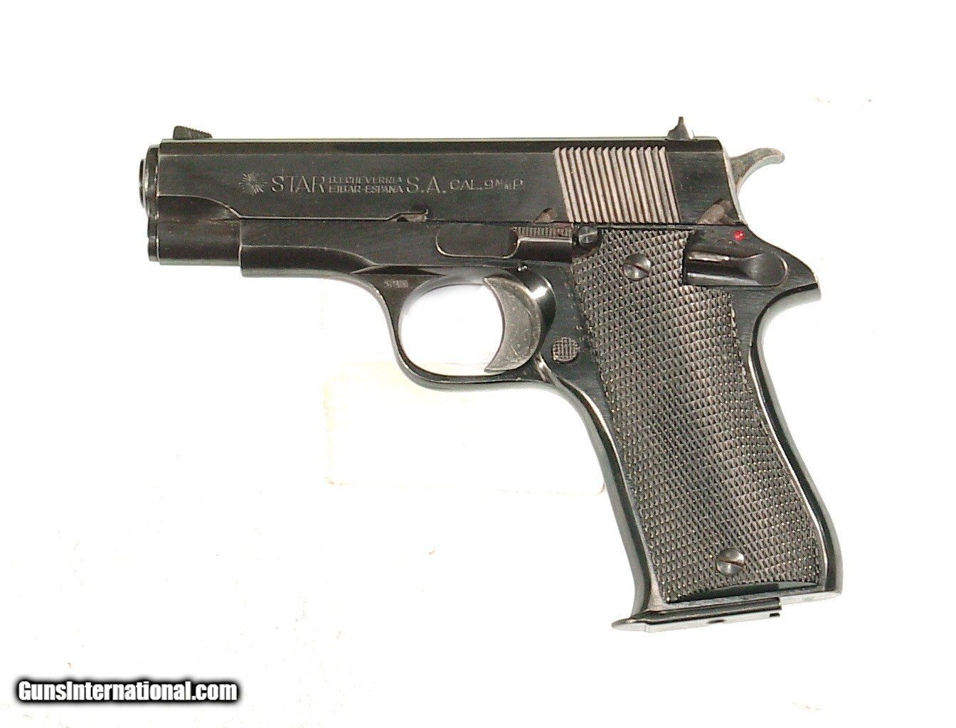 Description: 9mm luger caliber, 4" barrel, finished blue with casehardened hammer and checkered black plastic grips. Appears to be unused retaining all of the blue and mint grips. In it's original box with and extra magazine, instruction book, warranty card and Star factory plastic wrapper. Price: $695.00 Contact Seller |