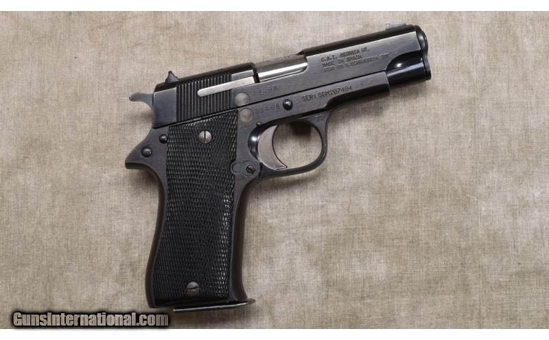 Description: From Spain comes what looks like a 1911 but isn't. There are some mechanical differences internally, and externally it doesn't have a back strap safety. The pistol feels a bit thinner than the 1911, probably because it is chambered in 9MM, but also because the grips are more rounded. Nice, smooth little gun. 9mm Luger SOLD Chambers: 8+1 capacity Metal Condition: Very good.There is a bit of wear on the high points and along the sharp edges. Wood Condition: Very good. Some handling marks along the bottom edge of the grips. Bore Condition: Shiny and bright with good rifling. Barrels: 4 inches Triggers: Factory single action trigger. Butt Pad: Checkered black plastic Weight: 34 ounces Sights: "Post and notch, white paint added for visibility. Item Location: Rogers |