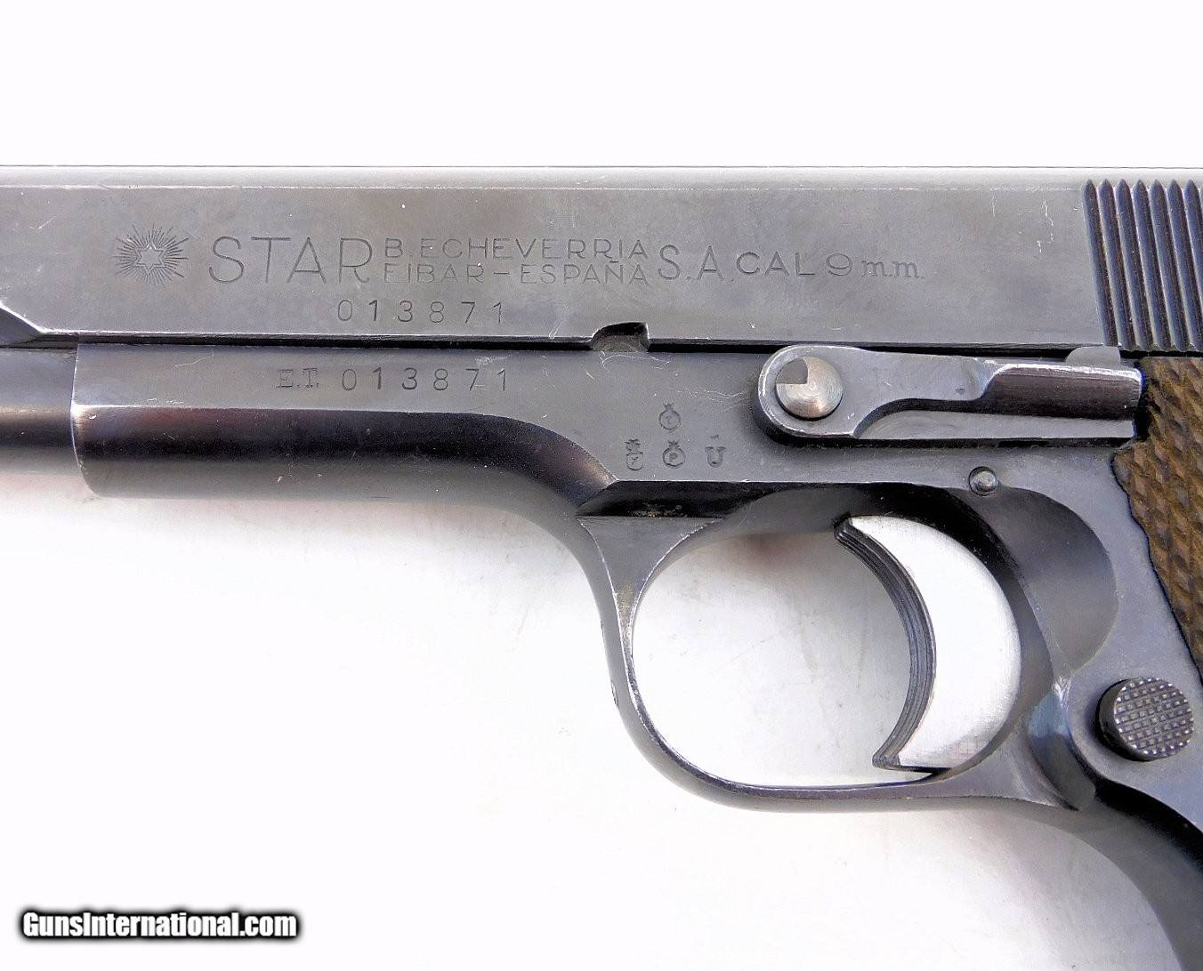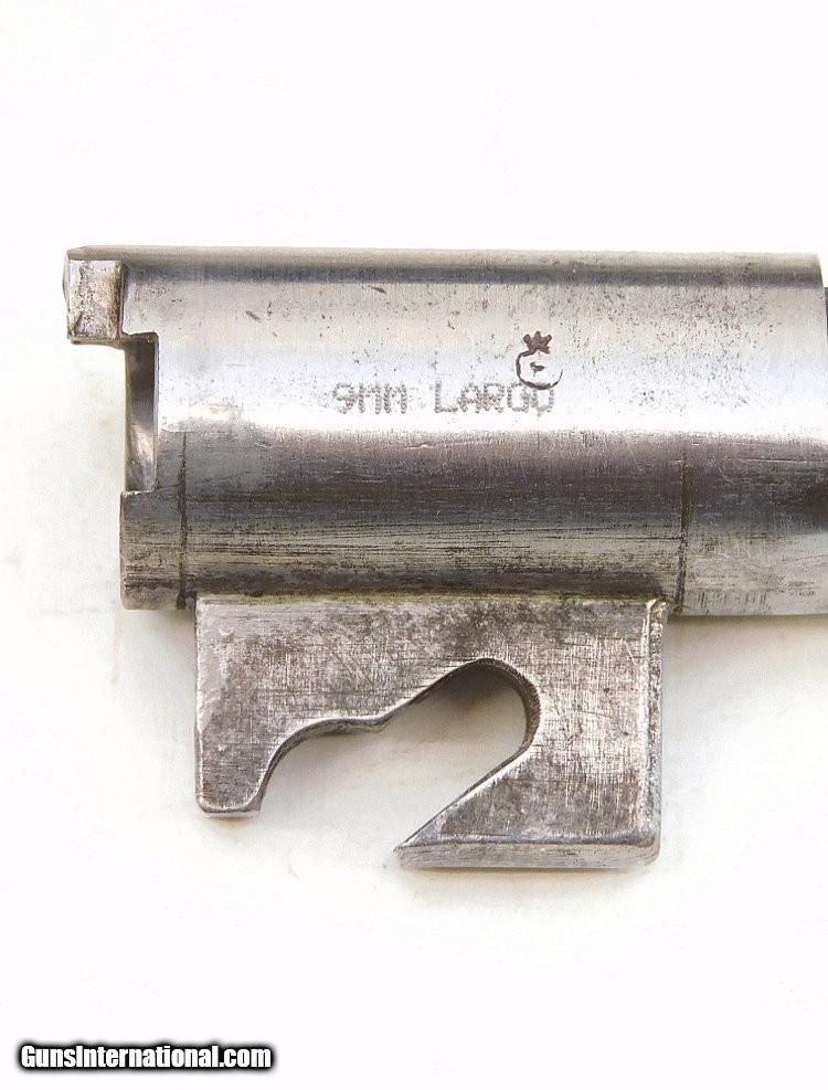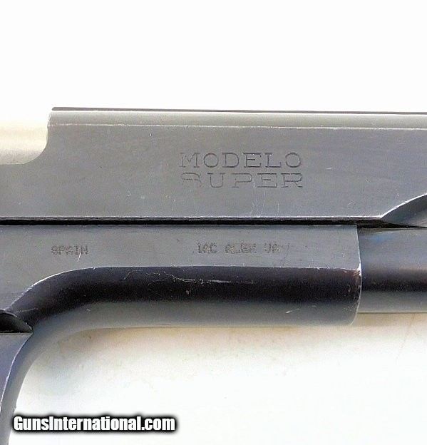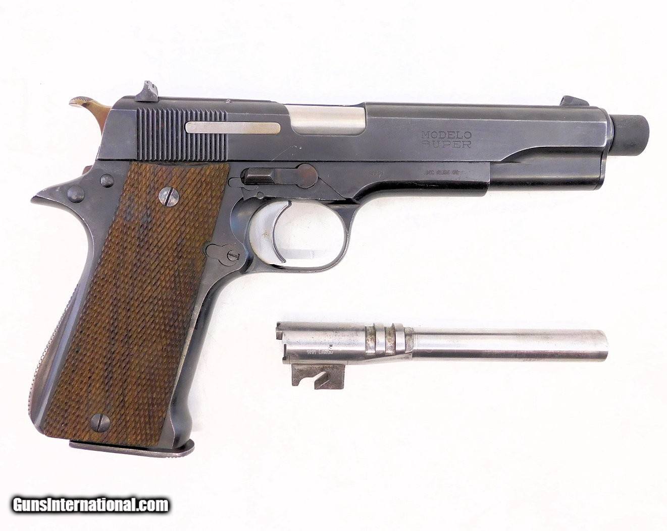 Description: Star Modelo Super pistol includes 2 barrels, a 5" 9MM Largo bbl with a shiny clean bore, and a 5 1/2" threaded 9MM Luger bbl with a shiny clean bore. The pistol has very minor scratches, checkered wood grips, and comes with the original box and manual. From 1946 onward, Star produced a Super version of the model A pistol. Besides the improvements from the model 1940, this as usual consisted of a number of upgrades to the weapon. Mostly the swinging link was replaced with a Sig 210 (or modern Star) style closed cam path integral to the barrel. Related to this, a full-length guide rod with captive spring, and a quick takedown lever were added as well. All of these models have a magazine safety, but one different from the previous S variants, and the extractor is modified to double as a loaded-chamber indicator. Additionally, the sights are improved in shape to make them easier to see, and minor changes were made to the trigger system. These were also apparently exported for extensive foreign military use. Add 3% for Credit Card Shipping $35.00 in the 48 contiguous United States SOLD |