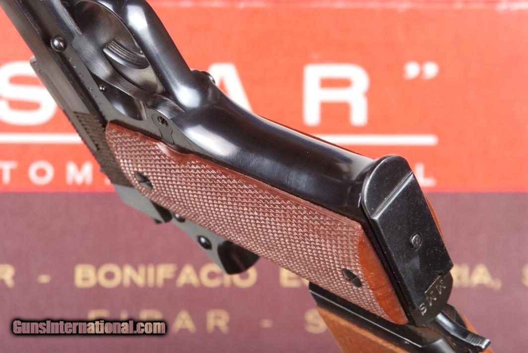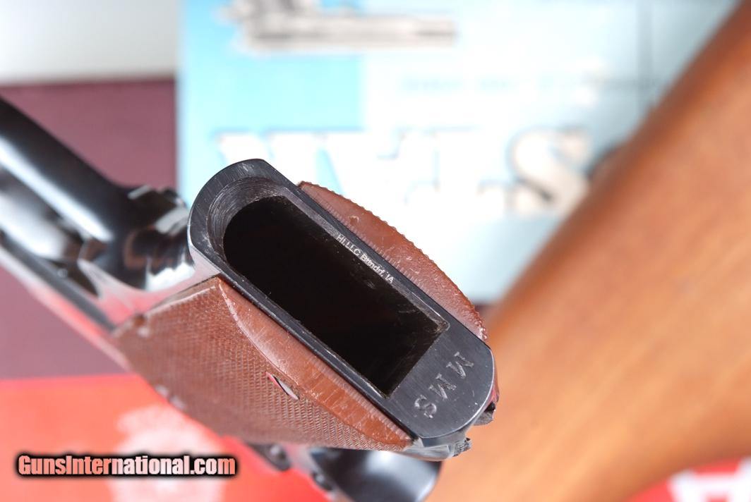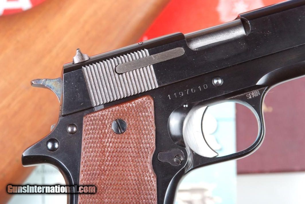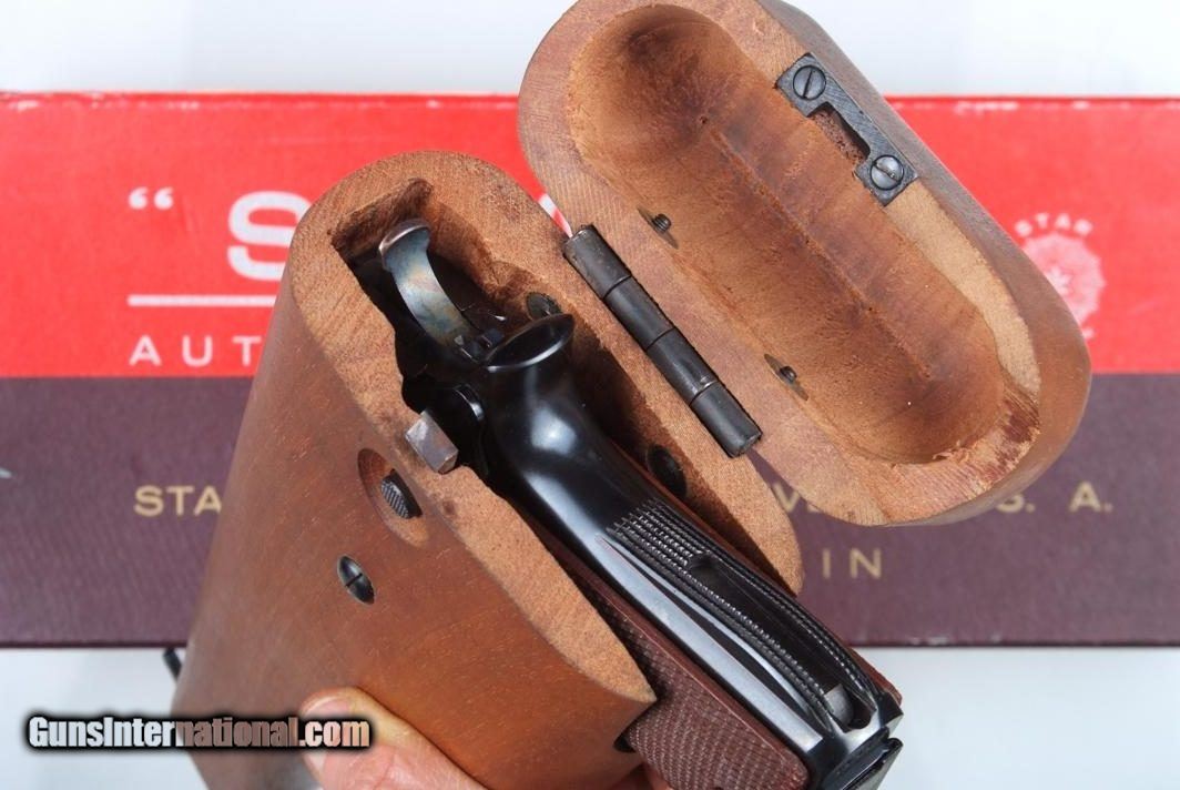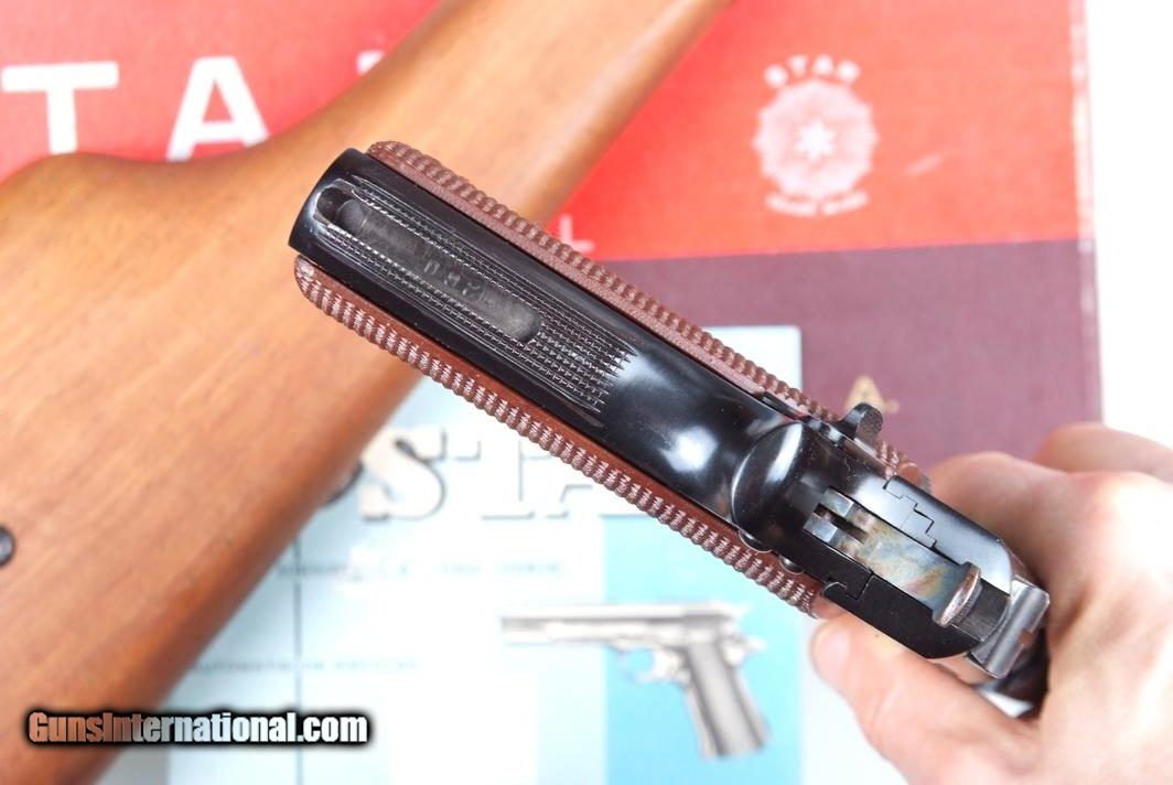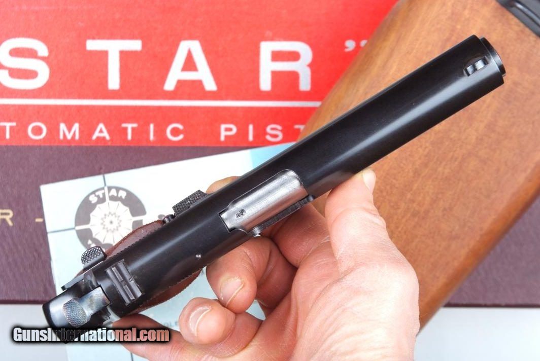 Description: Standard configuration Star MMS, 1 of 1174 pistols made between 1971-1985, this example completed in 1972. This single action locked breech pistol has a fixed front sight and drift adjustable rear sight. Usual address on left side of slide reflecting manufacturer, location in Spain, and caliber. Triad of Eibar proofs on left side of frame, under grip, with the automatic pistol proof repeated on left slide, behind serrations, and exposed chamber hood. Stock slot marked with assembly number "260". Major components salt blued; case hardened hammer; strawed extractor, trigger with sides polished bright. Checkered brown plastic grips. Unmarked magazine with two indicator slots on right side and detachable floorplate, indicator slot at rear. Complete with correct shoulder stock. Lug numbered "8", with same digits repeated on mating surface of lid and body, secured with original slotted screw. Excellent lockup to pistol with minimal wobble; pistol fits snugly inside stock, lid closing securely. Correct blue-white instruction booklet. Original red/goldenrod box with external scuffs and paper loses as photographed. No extended magazines. Synopsis: Star, MMS, Matching Box, Booklet and shoulder stock, 1197610, I-825 Condition: Pistol is nearly new, just the finest sharp edge wear at muzzle and stock slot, from insertion into stock and attachment onto lug. Even the grip screws look untouched. Non matching stock nearly as good, wood without staining, only a few small handling marks, the lug with minor insertional wear. Excellent booklet and VG+ shipping box with a few separations and paper losses as carefully photographed. One of the scarcest and most sought after Star pistols, now reclassified as a C&R, especially nice when still with its original shipping box. ~~Insured shipping fee of $75; most packages shipped using FedEx 2nd Day.~~ SOLD Manufacturer: Star Serial Number: 1197610 Caliber Info: 7.63mm |