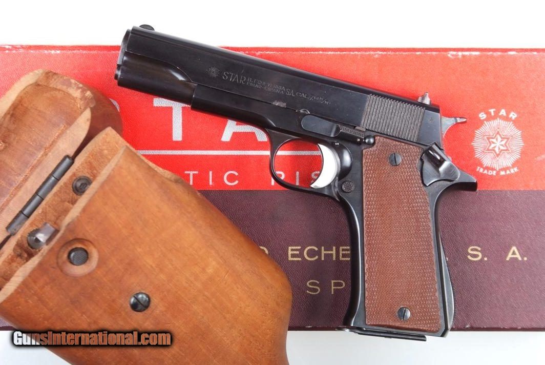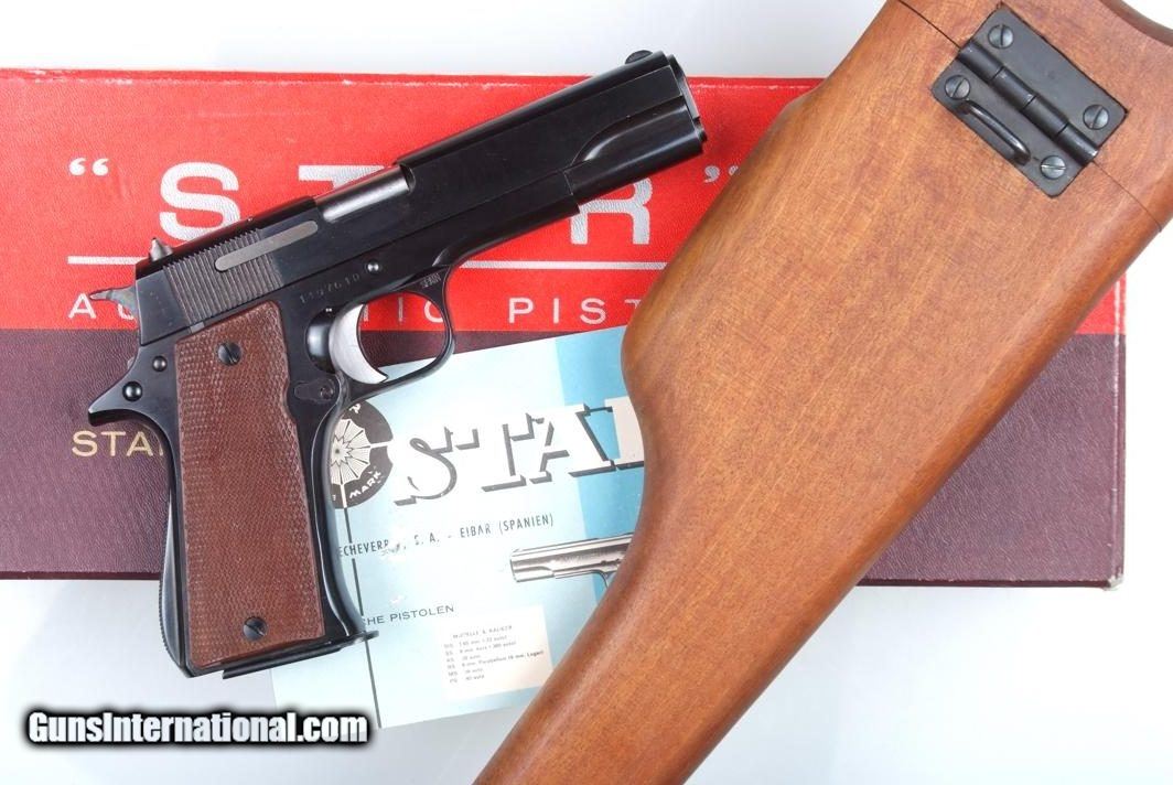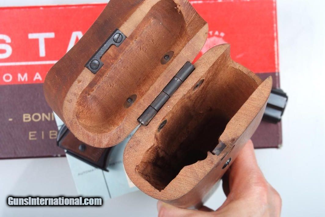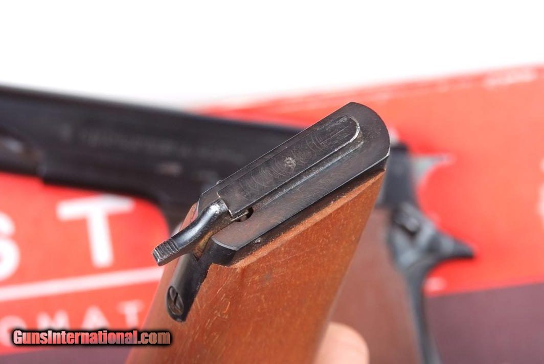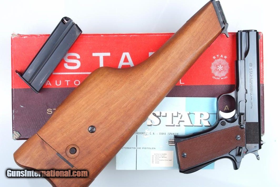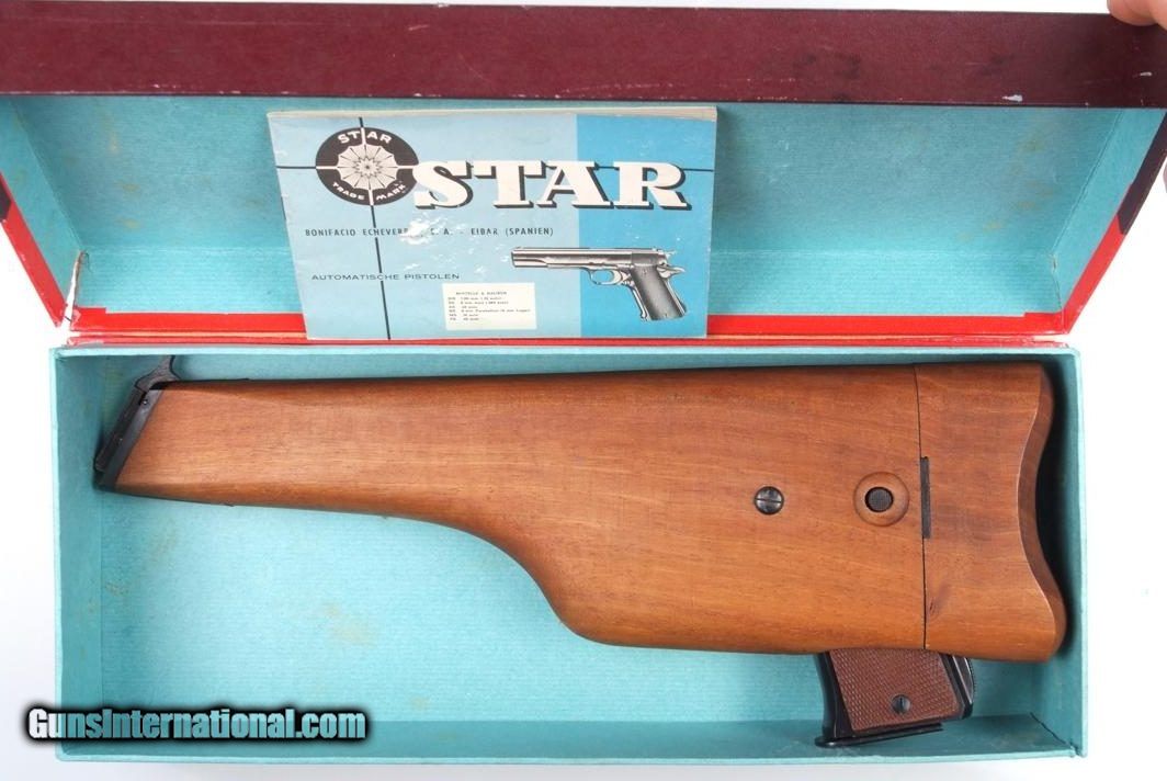 Description: Standard configuration Star MMS, 1 of 1174 pistols made between 1971-1985, this example completed in 1972. This single action locked breech pistol has a fixed front sight and drift adjustable rear sight. Usual address on left side of slide reflecting manufacturer, location in Spain, and caliber. Triad of Eibar proofs on left side of frame, under grip, with the automatic pistol proof repeated on left slide, behind serrations, and exposed chamber hood. Stock slot marked with assembly number "260". Major components salt blued; case hardened hammer; strawed extractor, trigger with sides polished bright. Checkered brown plastic grips. Unmarked magazine with two indicator slots on right side and detachable floorplate, indicator slot at rear. Complete with correct shoulder stock. Lug numbered "8", with same digits repeated on mating surface of lid and body, secured with original slotted screw. Excellent lockup to pistol with minimal wobble; pistol fits snugly inside stock, lid closing securely. Correct blue-white instruction booklet. Original red/goldenrod box with external scuffs and paper loses as photographed. No extended magazines. Synopsis: Star, MMS, Matching Box, Booklet and shoulder stock, 1197610, I-825 Condition: Pistol is nearly new, just the finest sharp edge wear at muzzle and stock slot, from insertion into stock and attachment onto lug. Even the grip screws look untouched. Non matching stock nearly as good, wood without staining, only a few small handling marks, the lug with minor insertional wear. Excellent booklet and VG+ shipping box with a few separations and paper losses as carefully photographed. One of the scarcest and most sought after Star pistols, now reclassified as a C&R, especially nice when still with its original shipping box. ~~Insured shipping fee of $75; most packages shipped using FedEx 2nd Day.~~ SOLD Manufacturer: Star Serial Number: 1197610 Caliber Info: 7.63mm |