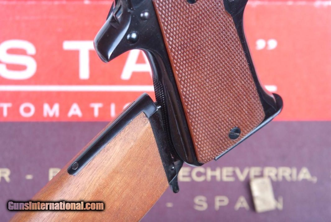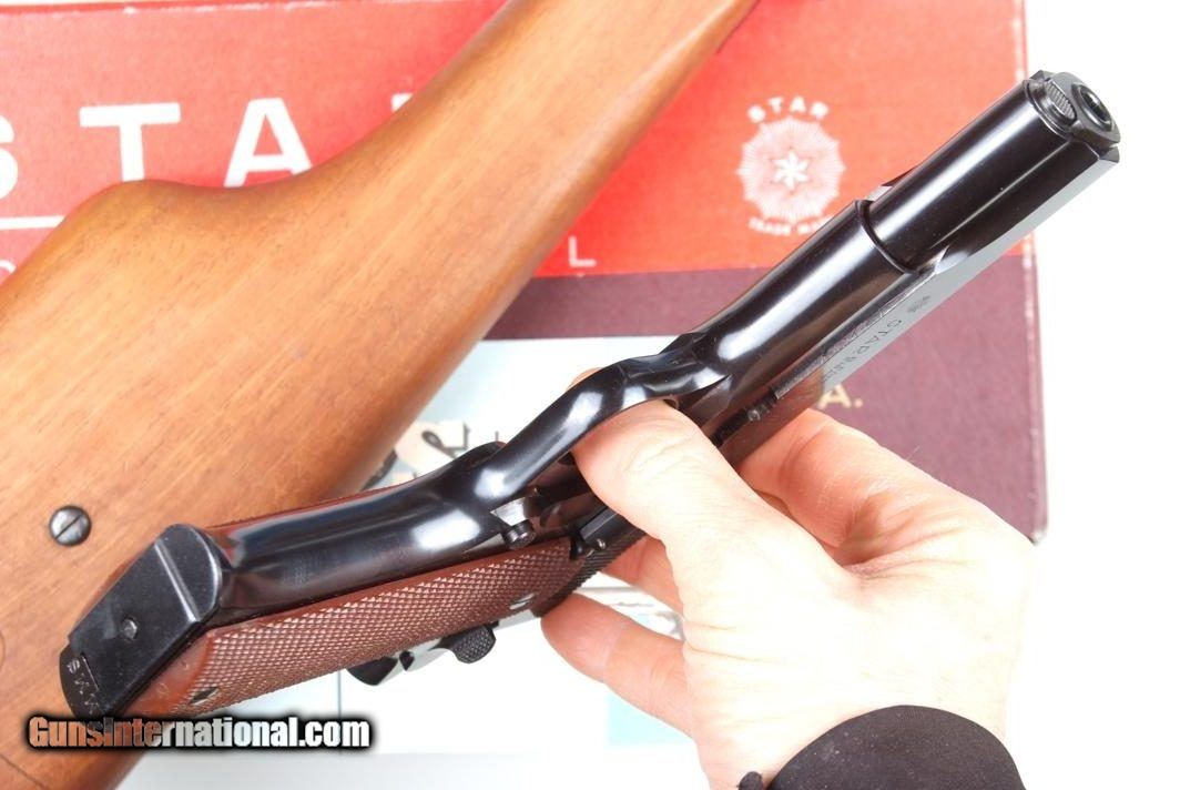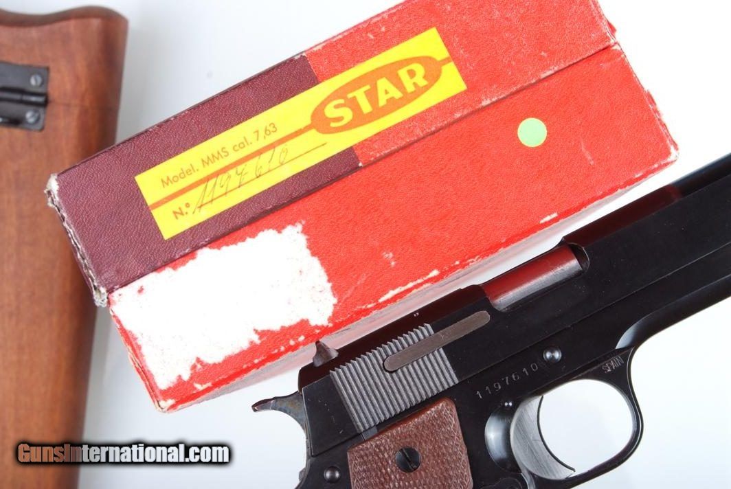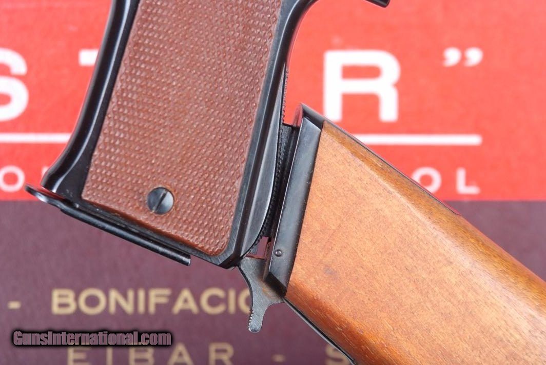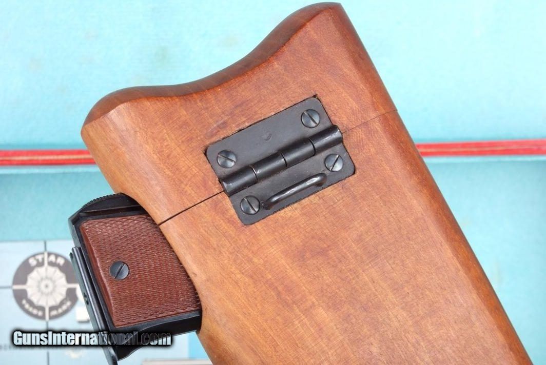 Description: Standard configuration Star MMS, 1 of 1174 pistols made between 1971-1985, this example completed in 1972. This single action locked breech pistol has a fixed front sight and drift adjustable rear sight. Usual address on left side of slide reflecting manufacturer, location in Spain, and caliber. Triad of Eibar proofs on left side of frame, under grip, with the automatic pistol proof repeated on left slide, behind serrations, and exposed chamber hood. Stock slot marked with assembly number "260". Major components salt blued; case hardened hammer; strawed extractor, trigger with sides polished bright. Checkered brown plastic grips. Unmarked magazine with two indicator slots on right side and detachable floorplate, indicator slot at rear. Complete with correct shoulder stock. Lug numbered "8", with same digits repeated on mating surface of lid and body, secured with original slotted screw. Excellent lockup to pistol with minimal wobble; pistol fits snugly inside stock, lid closing securely. Correct blue-white instruction booklet. Original red/goldenrod box with external scuffs and paper loses as photographed. No extended magazines. Synopsis: Star, MMS, Matching Box, Booklet and shoulder stock, 1197610, I-825 Condition: Pistol is nearly new, just the finest sharp edge wear at muzzle and stock slot, from insertion into stock and attachment onto lug. Even the grip screws look untouched. Non matching stock nearly as good, wood without staining, only a few small handling marks, the lug with minor insertional wear. Excellent booklet and VG+ shipping box with a few separations and paper losses as carefully photographed. One of the scarcest and most sought after Star pistols, now reclassified as a C&R, especially nice when still with its original shipping box. ~~Insured shipping fee of $75; most packages shipped using FedEx 2nd Day.~~ SOLD Manufacturer: Star Serial Number: 1197610 Caliber Info: 7.63mm |
