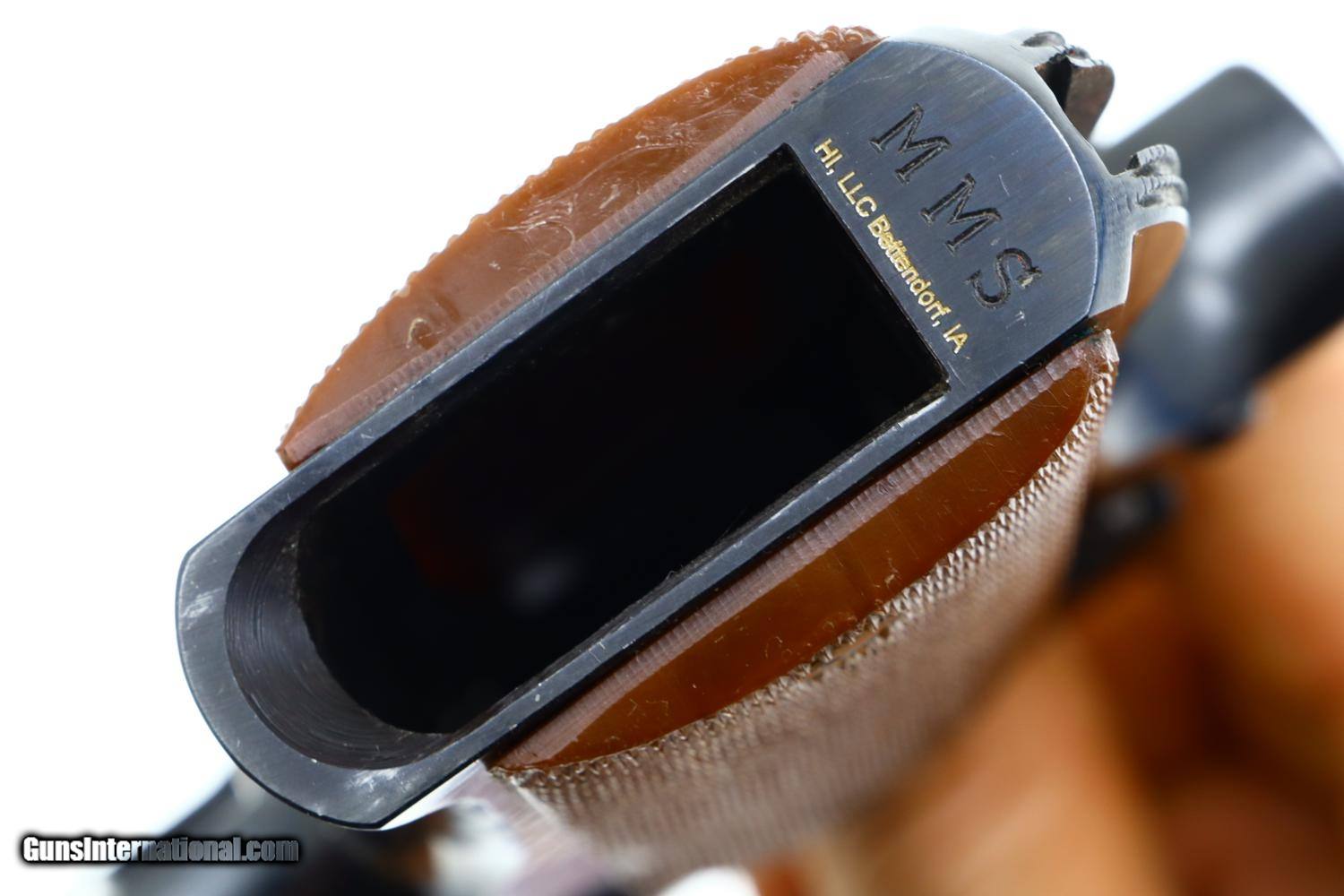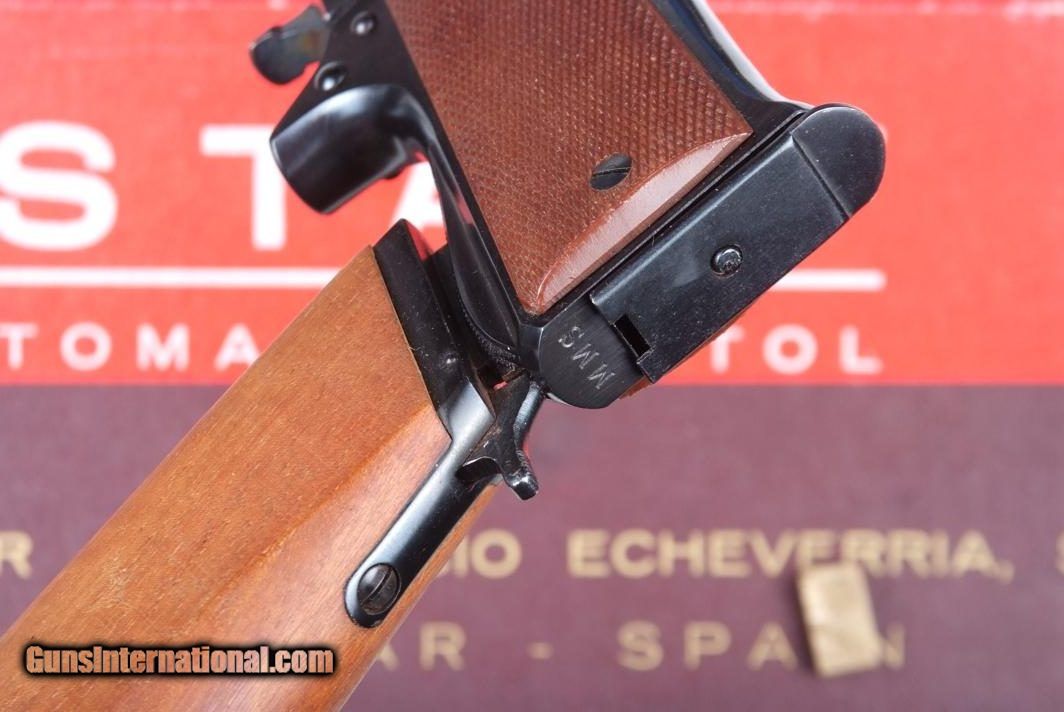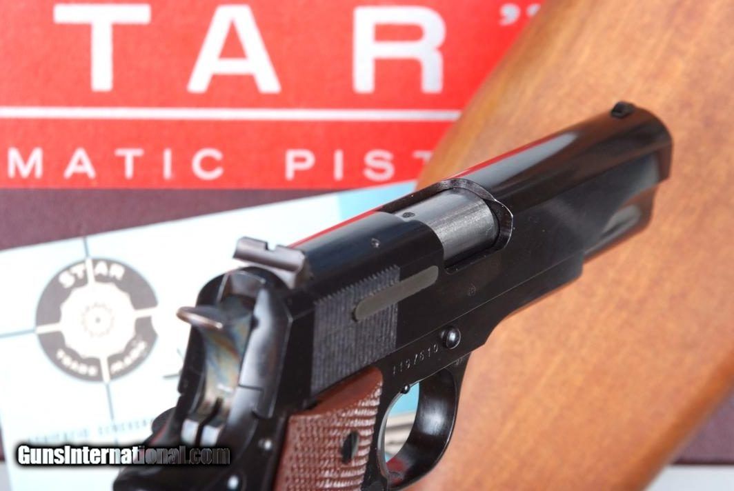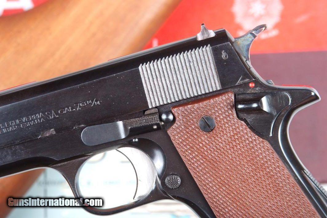 Description: Standard configuration Star MMS, 1 of 1174 pistols made between 1971-1985, this example completed in 1972. This single action locked breech pistol has a fixed front sight and drift adjustable rear sight. Usual address on left side of slide reflecting manufacturer, location in Spain, and caliber. Triad of Eibar proofs on left side of frame, under grip, with the automatic pistol proof repeated on left slide, behind serrations, and exposed chamber hood. Stock slot marked with assembly number "260". Major components salt blued; case hardened hammer; strawed extractor, trigger with sides polished bright. Checkered brown plastic grips. Unmarked magazine with two indicator slots on right side and detachable floorplate, indicator slot at rear. Complete with correct shoulder stock. Lug numbered "8", with same digits repeated on mating surface of lid and body, secured with original slotted screw. Excellent lockup to pistol with minimal wobble; pistol fits snugly inside stock, lid closing securely. Correct blue-white instruction booklet. Original red/goldenrod box with external scuffs and paper loses as photographed. No extended magazines. Synopsis: Star, MMS, Matching Box, Booklet and shoulder stock, 1197610, I-825 Condition: Pistol is nearly new, just the finest sharp edge wear at muzzle and stock slot, from insertion into stock and attachment onto lug. Even the grip screws look untouched. Non matching stock nearly as good, wood without staining, only a few small handling marks, the lug with minor insertional wear. Excellent booklet and VG+ shipping box with a few separations and paper losses as carefully photographed. One of the scarcest and most sought after Star pistols, now reclassified as a C&R, especially nice when still with its original shipping box. ~~Insured shipping fee of $75; most packages shipped using FedEx 2nd Day.~~ SOLD Manufacturer: Star Serial Number: 1197610 Caliber Info: 7.63mm |