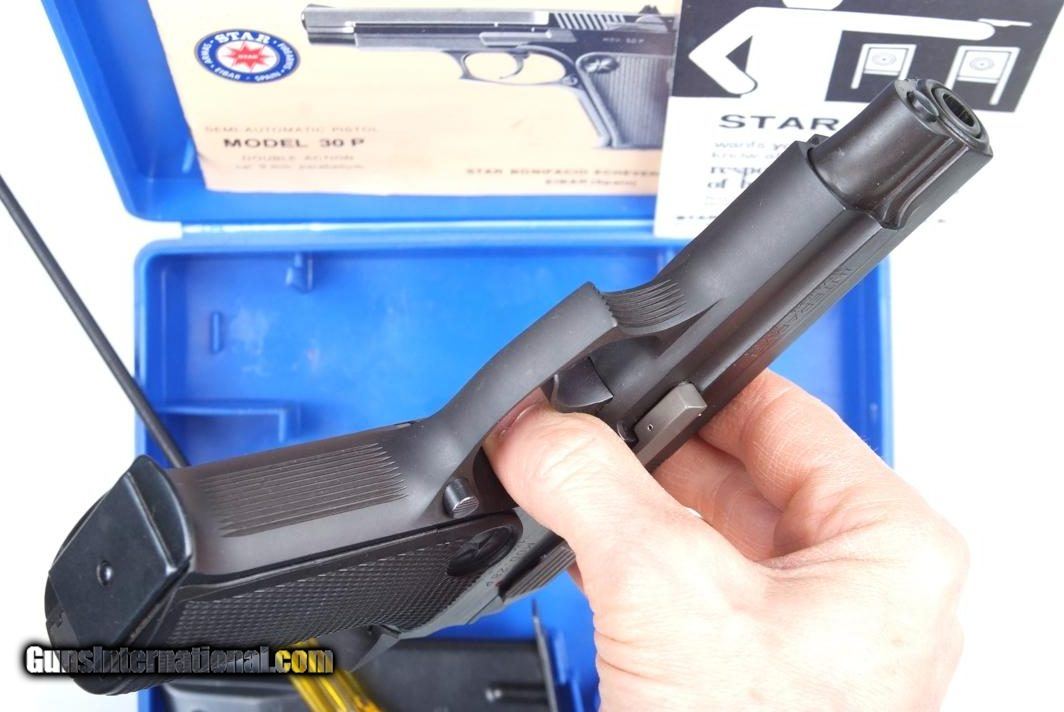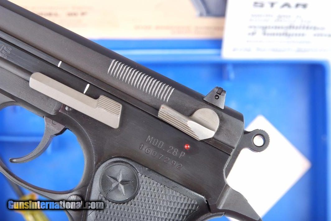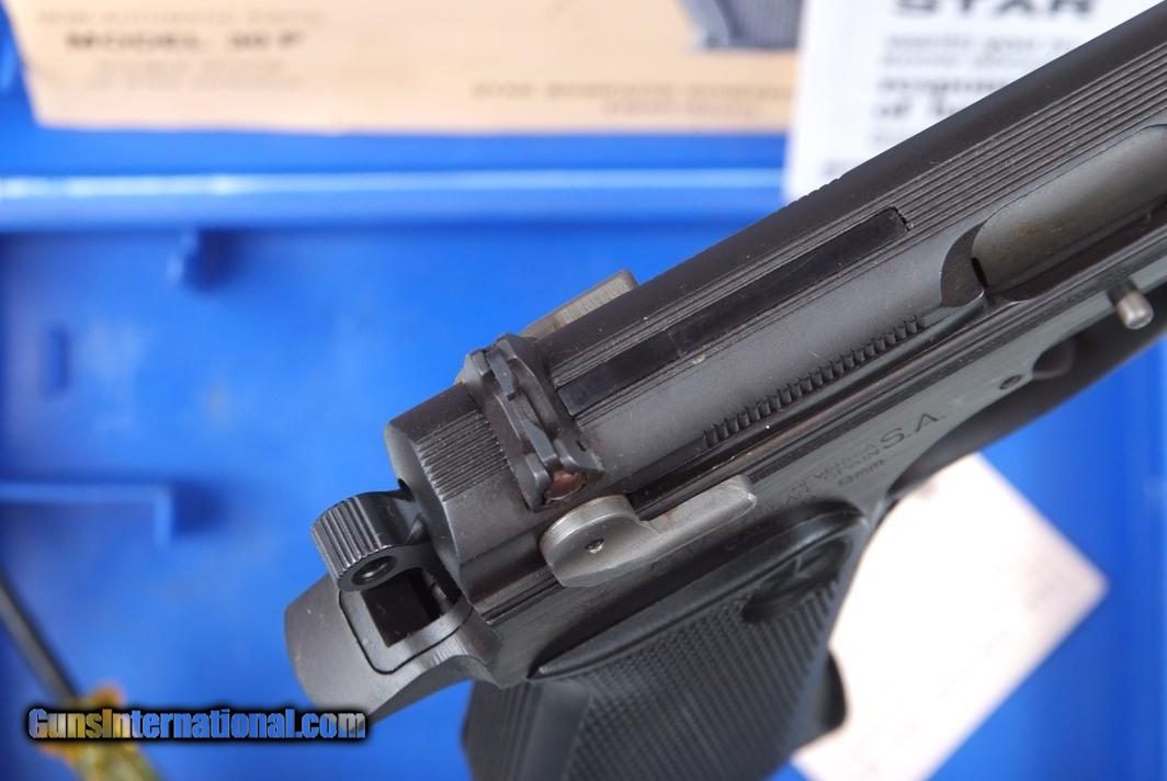 Description: Classic big frame SA/DA Star as developed for US Joint Services Small Arms Program in the late 1970s. Later selected and used with great success by Spain’s Guardia Civil, a smaller version by Spain’s Policia National. This is the full size gun as imported by Interarms, in its original and matching blue plastic box with instruction booklet, Interarms advisory, and cleaning rod. The pistol is of standard configuration with a fixed, serrated ramp front sight, loaded indicator, windage adjustable rear sight, and ambidextrous safety. Interarms marking, model, and serial number are on the left side of the frame. The late Star address is on right side of frame. Grooved forward trigger guard, frontstrap and backstrap. Separated black checkered plastic panels with 5-pointed Star logo. Original magazine, right side drilled with 3 indicator holes and removable floorplate. Factory literature, cleaning rod, and matching shipping box. Synopsis: Star, Model 28 DA, near NIB with accessories, 1607292, I-821 Condition: 99+% original finish. Mirror bore. Perfect manual mechanics. Comparable condition literature and cleaning rod. Box with surface scuffing. Excellent end label with clear markings. A classic big frame Star, predecessor to the more frequently encountered M30 and M31. DO NOT PURCHASE IF YOU LIVE IN A STATE WHERE HIGH CAPACITY MAGAZINES ARE RESTRICTED! ~~Insured shipping fee of $55; most packages shipped using FedEx 2nd Day.~~ SOLD Manufacturer: Star Serial Number: 1607292 Caliber Info: 9 Para |