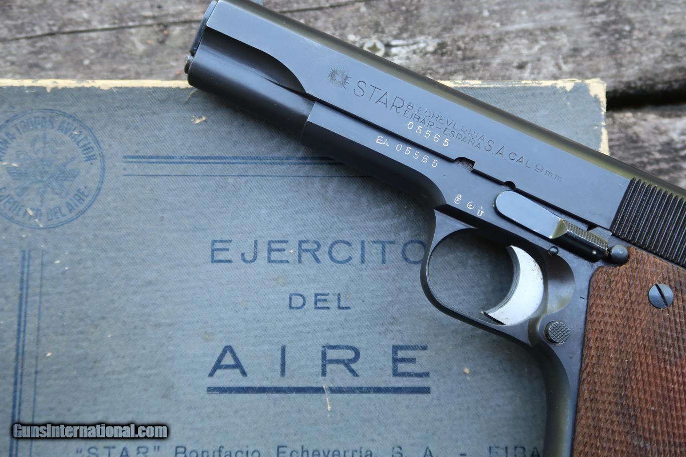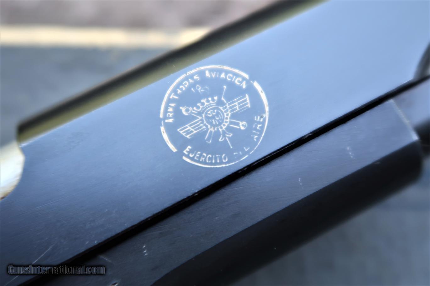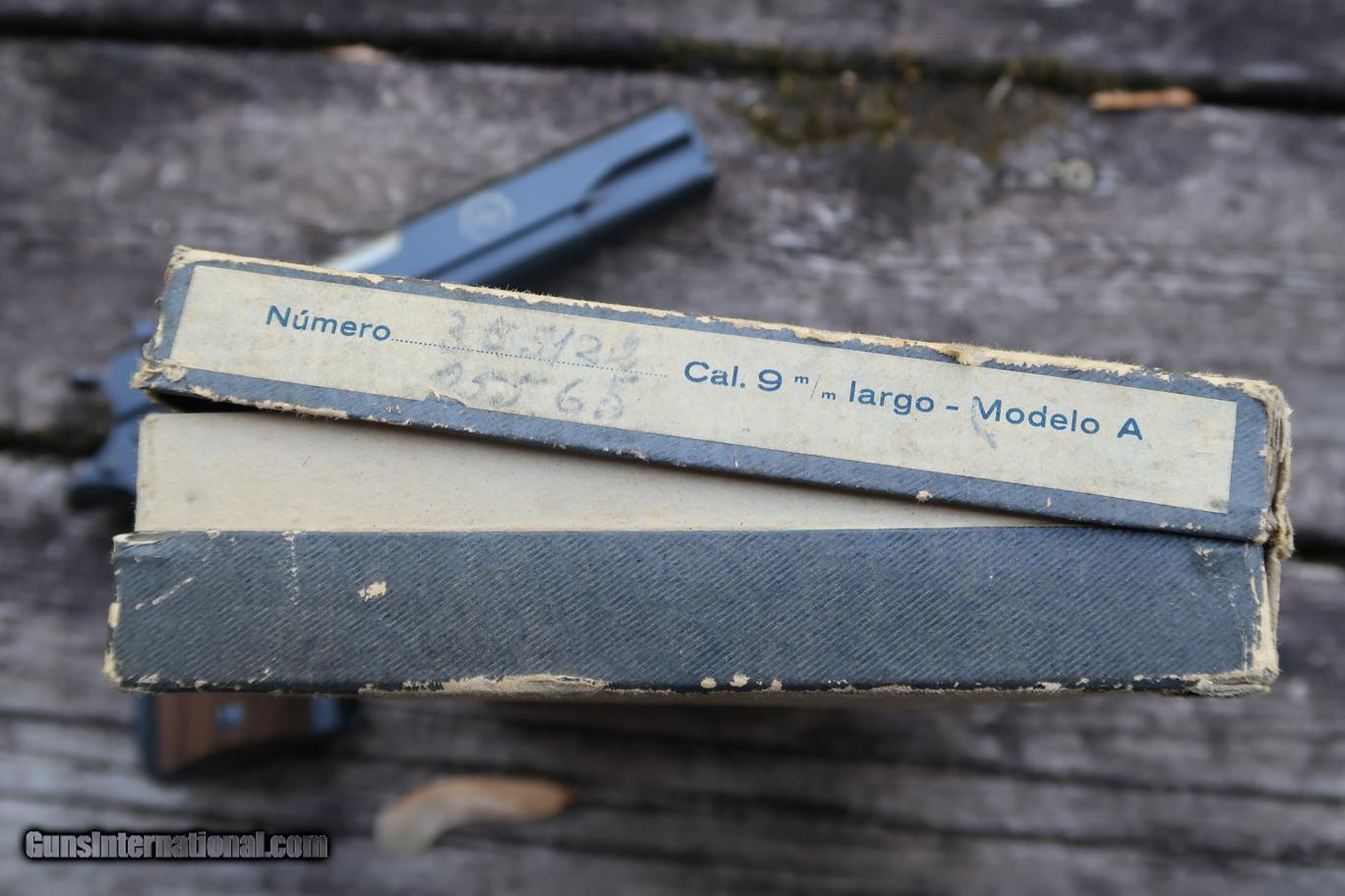 Description: Standard configuration Star Model A with fixed front sight and drift adjustable rear sight. Usual Star address on left side of slide, referencing company and caliber (9 mm = 9 mm Largo, not Parabellum). Right side of slide with Spanish Air Force logo matching slide, frame, and magazine. Eibar proofs reflect production in (U) 1950. Import markings as photographed. Model and serial number noted on the bottom of the frame. Major components are salt blued, color case hardened hammer, barrel hood and sides of trigger polished bright, strawed extractor. Walnut checkered grips. Complete with grey Air Force box with matching end label. No accessories. Very similar, slightly later production, than pistol pictured in 'Star Firearms' on page 367. Synopsis: Attractive Star Model A, Spanish Air Force issue, with matching magazine in correct box. Condition: Excellent as arguably redipped at factory when released as surplus. Blue a bit mottled and two dings under the blue at rear of slide adjacent to hammer cutout. No suggestion that the hammer, trigger, screws, or magazine were reworked. Near mirror bore. Perfect manual mechanics. Box with scuffs as photographed. ~~Insured shipping fee of $55; most packages shipped using FedEx 2nd Day.~~ SOLD Curio/Relic: Yes Manufacturer: Star Serial Number: 355122 Caliber Info: 9mm Largo |