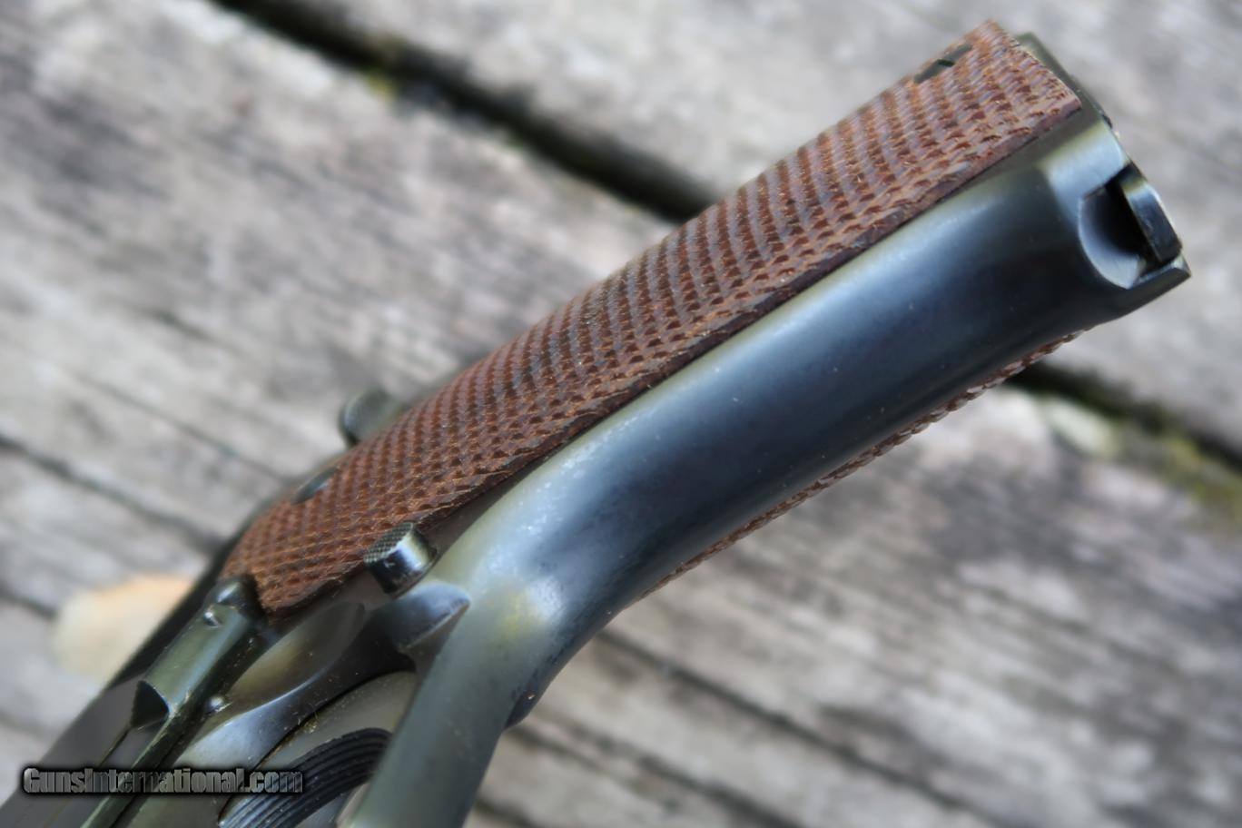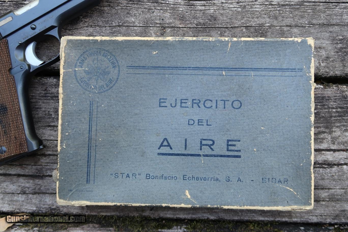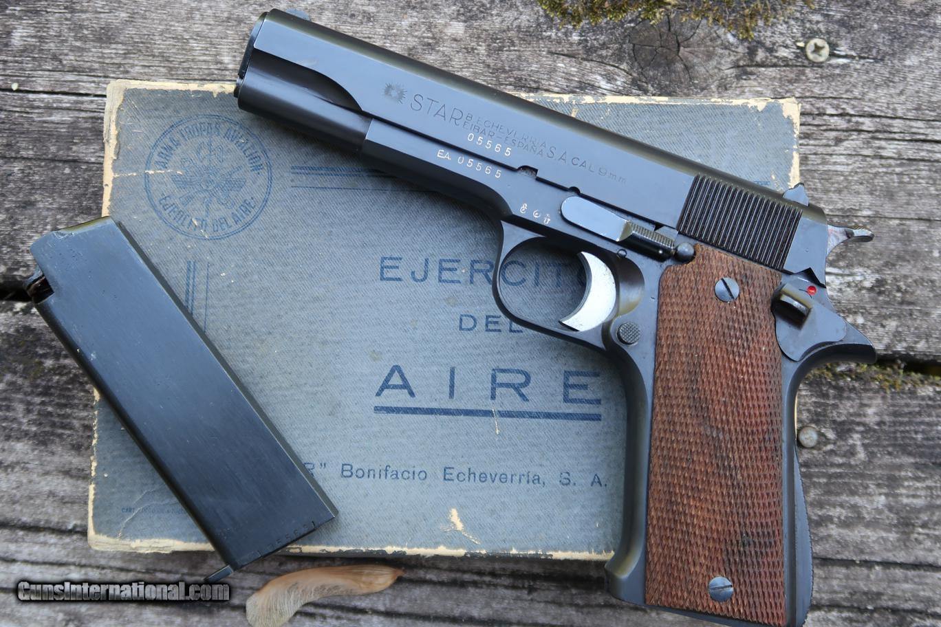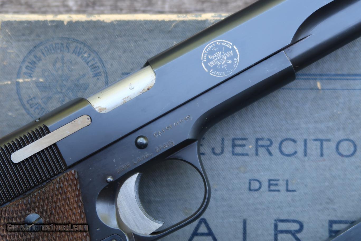 Description: Standard configuration Star Model A with fixed front sight and drift adjustable rear sight. Usual Star address on left side of slide, referencing company and caliber (9 mm = 9 mm Largo, not Parabellum). Right side of slide with Spanish Air Force logo matching slide, frame, and magazine. Eibar proofs reflect production in (U) 1950. Import markings as photographed. Model and serial number noted on the bottom of the frame. Major components are salt blued, color case hardened hammer, barrel hood and sides of trigger polished bright, strawed extractor. Walnut checkered grips. Complete with grey Air Force box with matching end label. No accessories. Very similar, slightly later production, than pistol pictured in 'Star Firearms' on page 367. Synopsis: Attractive Star Model A, Spanish Air Force issue, with matching magazine in correct box. Condition: Excellent as arguably redipped at factory when released as surplus. Blue a bit mottled and two dings under the blue at rear of slide adjacent to hammer cutout. No suggestion that the hammer, trigger, screws, or magazine were reworked. Near mirror bore. Perfect manual mechanics. Box with scuffs as photographed. ~~Insured shipping fee of $55; most packages shipped using FedEx 2nd Day.~~ SOLD Curio/Relic: Yes Manufacturer: Star Serial Number: 355122 Caliber Info: 9mm Largo |