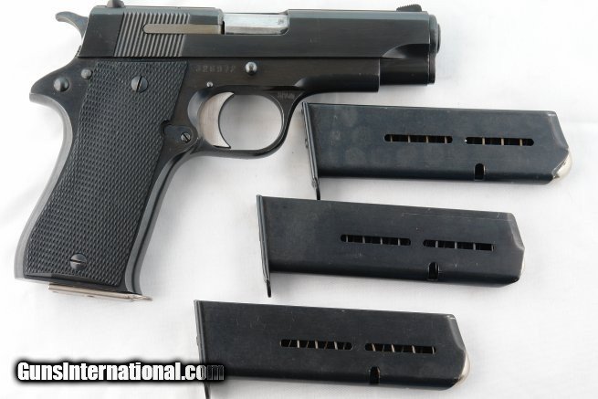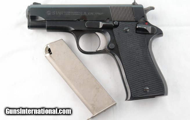Description: STAR MODEL BM OR MODEL B 9MM COMPACT SEMI-AUTO PISTOL WITH FOUR MAGS, CIRCA 1982. Like new condition and all matching with almost no signs of use and 100% of the original factory blue. Plastic factory grips. Case colored hammer. One stainless mag in gun and three aftermarket steel mags accompany. Appears unused and never carried. Prime example. SOLD |