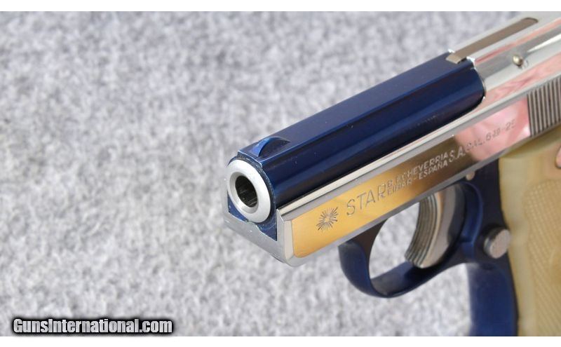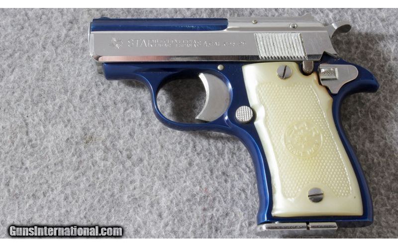 Description: The Star Model CU is a fine pocket pistol. This pistol is in the hard to find bright RAF blue finish. Manufactured in Spain 1958. .25 ACP SOLD Metal Condition: Excellent, with some scratches Bore Condition: Very good Barrels: 2 1/4 inch barrel Triggers: Single action trigger Weight: 12 oz. Sights: Fixed U notch rear sight with blade front Item Location: Lehi, UT |