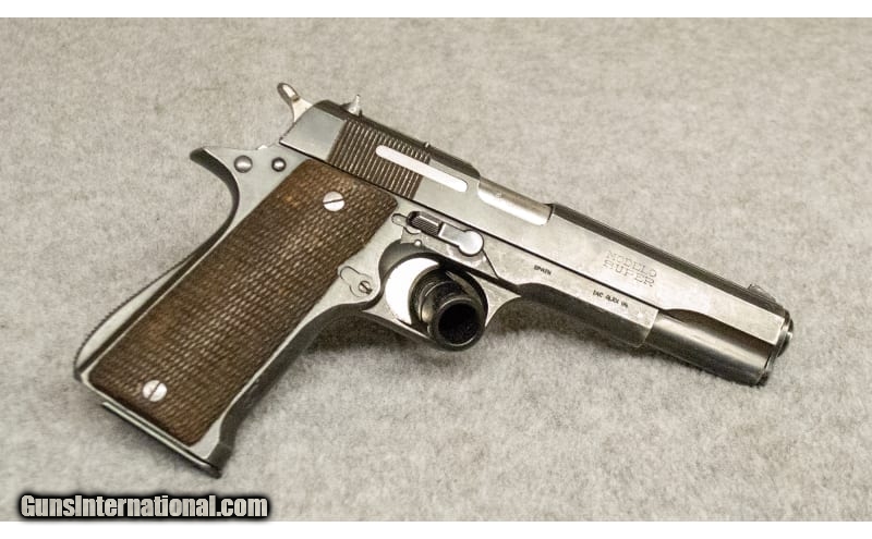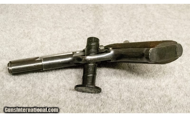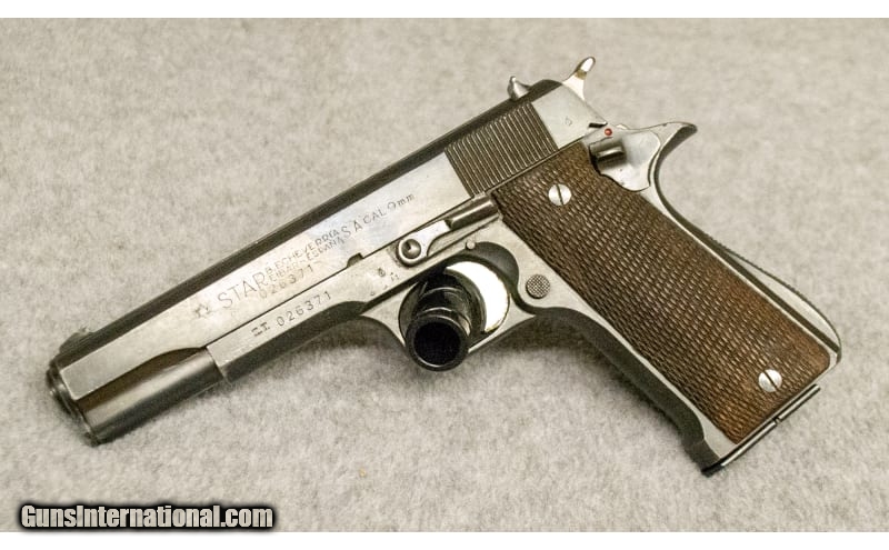 Description: Star Model Super A in 9mm Largo. Has loaded chamber indicator, mag. safety, and easier takedown feature. Mfg. 1946-89. The Super A was a Spanish Service pistol. Various scuff marks present on barrel, frame, and the trigger guard. Small amount of bluing loss due to holster wear. Checkered wood grips are in decent condition, with a small amount of wear towards the top and bottom of the panels. 9mm Largo SOLD Chambers: 9mm Largo Metal Condition: Good Wood Condition: Good Bore Condition: Very Good Barrels: 5 Sights: GI Sights Item Location: Greenville, SC |