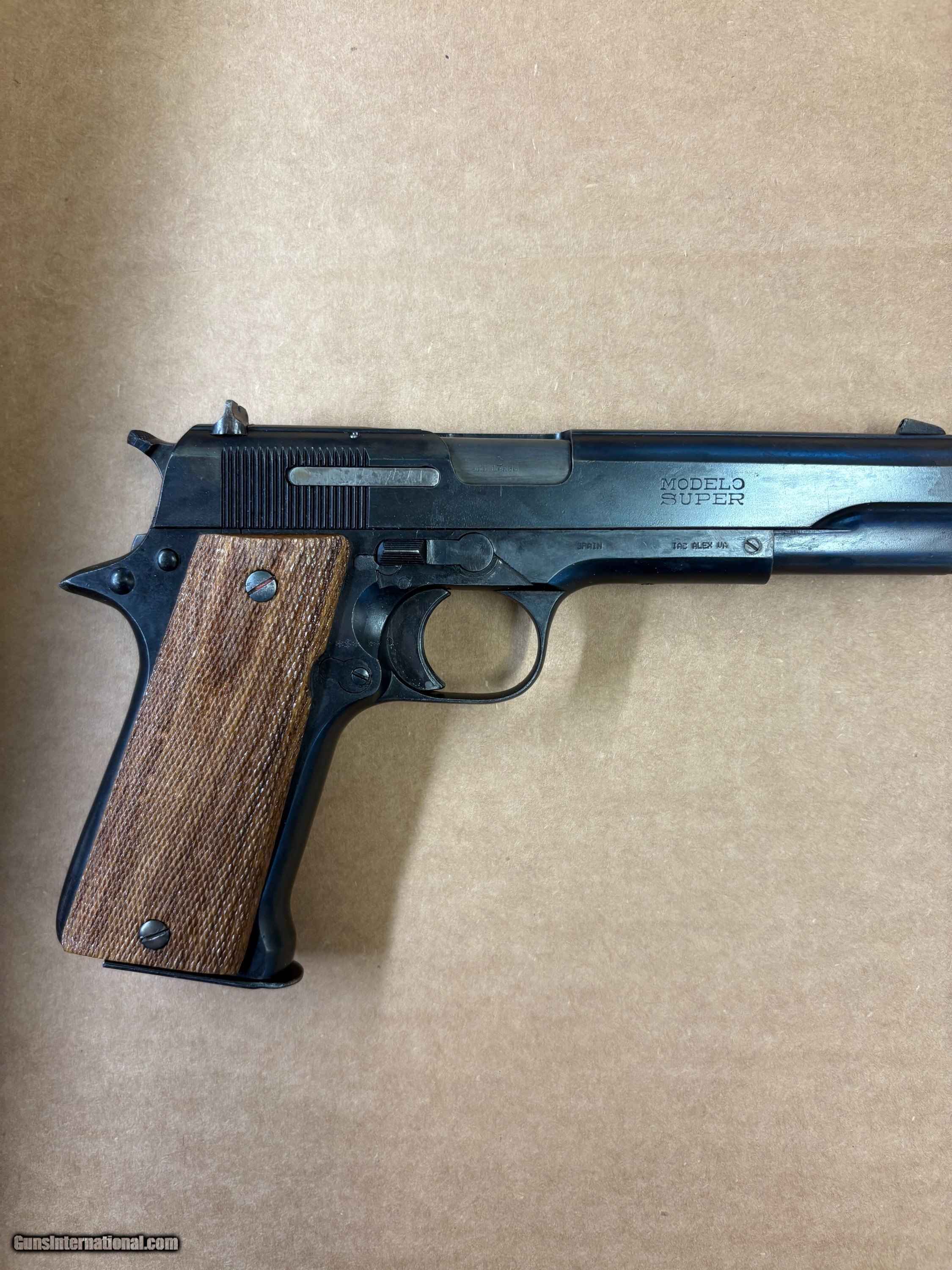 Description: Star Modelo Super 9mm Largo (9mm Bergmann pistol. Some pitting in barrel, but rifling is strong. Over all condition very good. Accurate shooter. Seven magazines total, very functional. Matching numbers on slide, frame and barrel. Handgun Caliber: 9mm Largo (9mm Bergmann-Bayard, 9x23mm Largo) Manufacturer: Star Model: Super Barrel Length: 5 Condition: very good Metal Condition: excellent Wood Condition: excellent Bore Condition: good Price: $500.00 Shipping: $30.00 Contact Seller |
