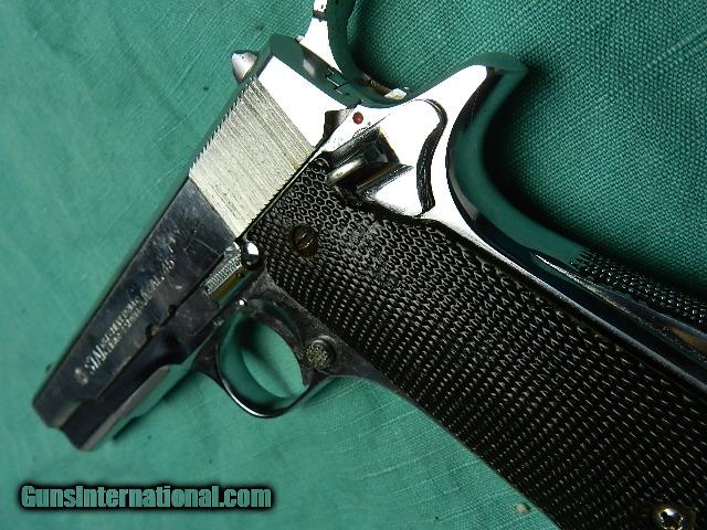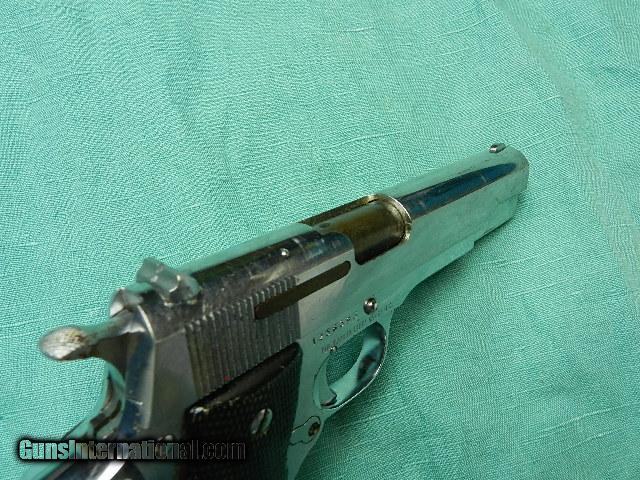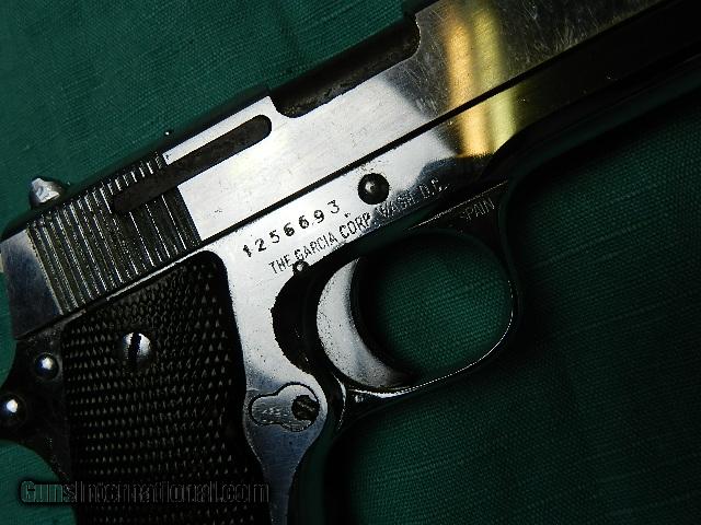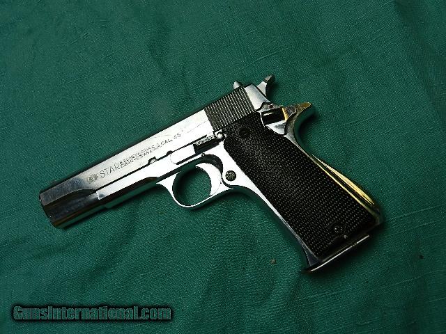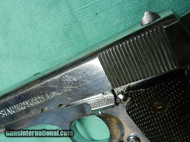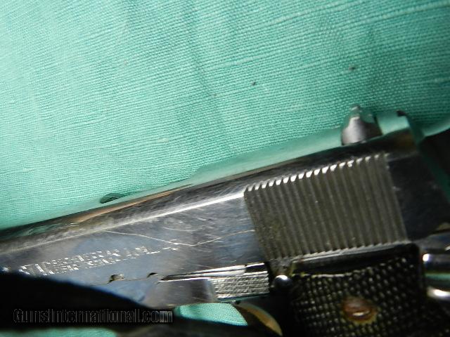 Description: A full size hammer forged Star, much like the Colt 1911A1 in style and take-down method, this older gun makes a rugged carry gun. The 5" long barrel has a clean, sharp rifled bore. The black rubber grips are very good condition, and the action is very tight, not a loose gun! Comes with one seven round mag. The exterior is high polished nickle and is in good condition with small surface abrasions from being in a drawer with a bunch of other guns. The is a longer shallow scratch on the left side of the slide. One small spot of corrosion are edge of right grip at top. I don't see these very often since their owners don't tun them loose! We don’t have asite .I prefer money orders or a check. Item ships when funds come in. If you can only pay with a card let me know. I’m sorry I don’t list my phone number, did that for 30 days, never again.. I can’t talk on the phone all day…who will ship the guns? I’m just one person, and it’s very bust here! I do a brisk volume! I hope you like my wide selection of unusual guns, knives and gun parts. Shipping price determined by zip code. I try to keep the prices affordable, which means I make less money than most dealers. You won’t get altitude sickness with my prices! I consistently have the best selection of older guns If you BUY IT NOW you must still contact us for details buy it now doesn't end the sale, it just sends an email telling us you want to buy this gun. A phone call won’t secure a sale! Not home many times, the first buyer by email buys the gun !Thissite doesnot close down a sale when you do a BUY IT NOW like Ebay!I can get six buy it nows in an hour, first buyer to email gets the guns, others are in second place! Best to send another email . Sometimes not home to get calls. Some guns are required shipment to a gun dealer near you for a transfer to you when it arrives. With the widest selection of older guns at great prices, We don’t have a store, and sell on the internet only. SOLD |