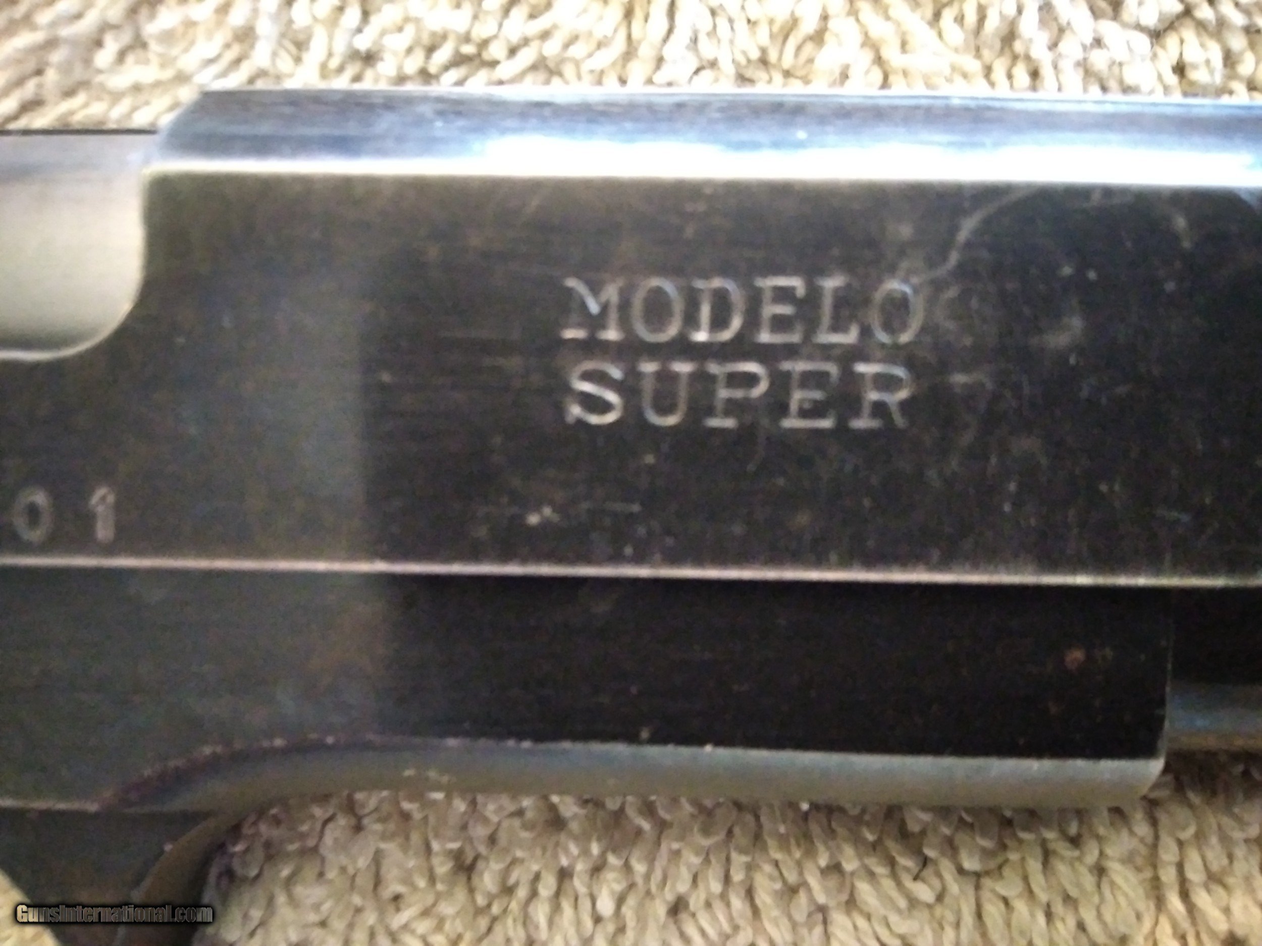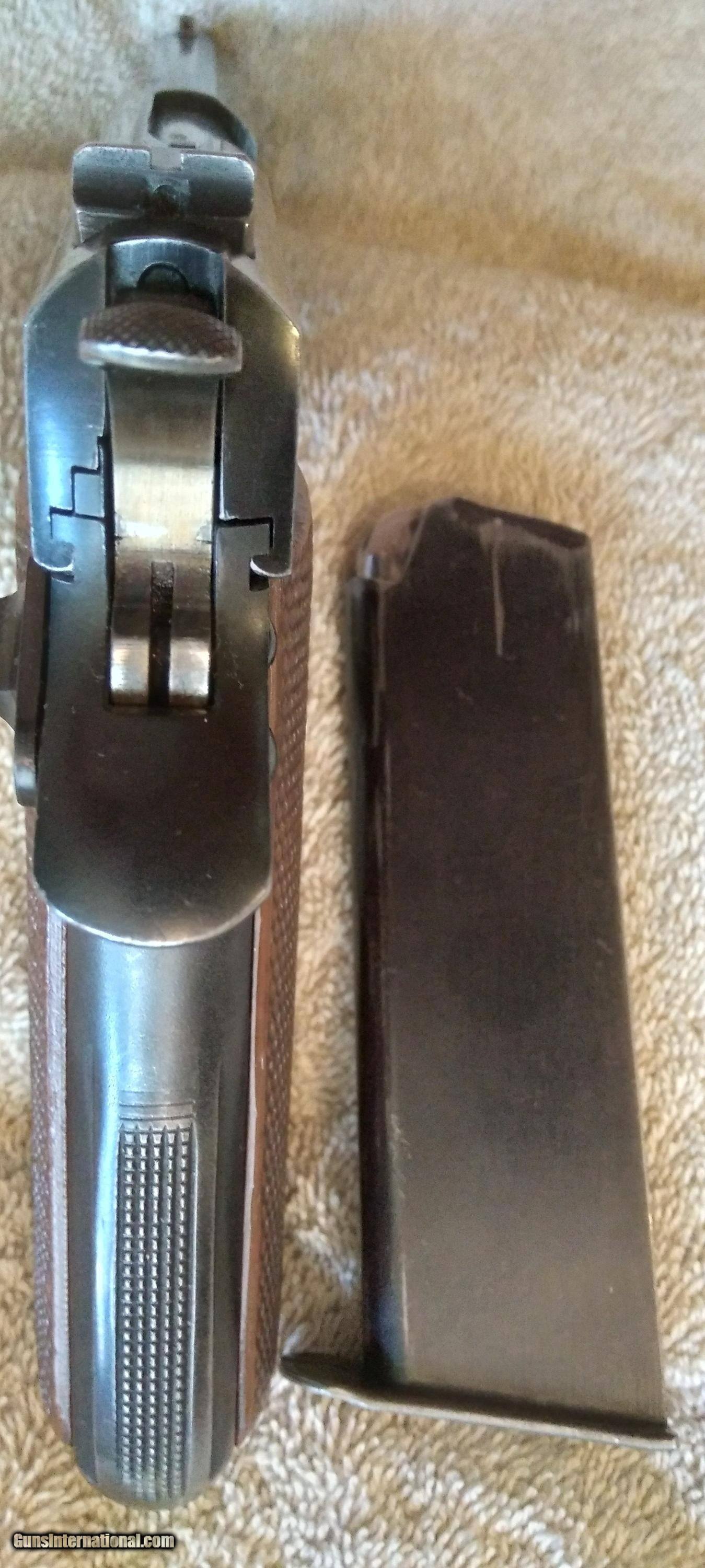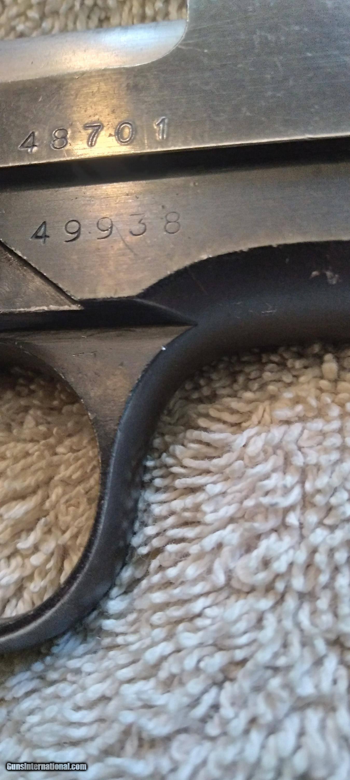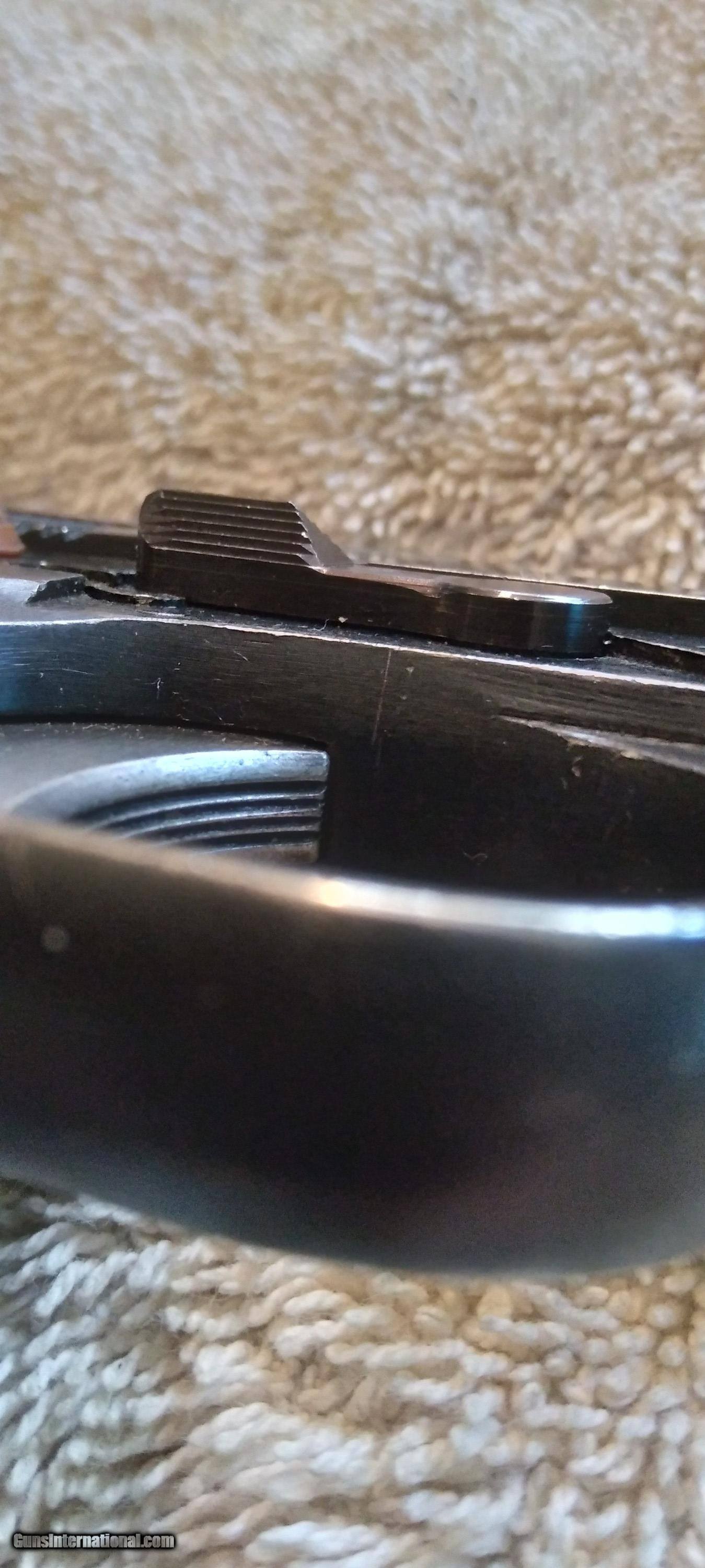 Description: STAR B ECHEVERRIA EIBER-ESPANA SUPER BS THIS IS A SECOND MODEL BS WITH MAGAZINE SAFETY (S) 1972 MANUFACTURE S/N 49938 NON MATCHING S/N ON 1972 MANUFACTURED SLIDE SINGLE ACTION AUTOMATIC CALIBER 9MM UNIQUE TAKE DOWN LEVER ON THE RIGHT SIDE OF THE FRAME WILL RELEASES SLIDE FROM FRAME WHEN PUSHED DOWN AND FORWARD TAKEDOWN LEVER IS A NEW EXTRA THICK HEAVY DUTY LEVER FIXED WHITE DOT SIGHTS WHITE IS MOSTLY GONE MAGAZINE SAFETY ONE MAGAZINE AND A SPARE WOLF EXTRA POWER RECOIL SPRING LOADED CHAMBER INDICATOR PROOF MARK ON BARREL CHAMBER IN FRONT OF LOADED CHAMBER INDICATOR PROOF MARK ON THE LEFT REAR OF SLIDE BLUING IS WORN AND THINNING ON SLIDE, FRAME AND THE FRONT AND REAR GRIP STRAPS LIGHT SCRATCHES ON SLIDE BORE IS EXCELLENT BRIGHT AND SHINY EXCELLENT RIFLING GRIPS ARE GOOD WITH SOME WEAR NO CHIPS OR CRACKS NO RUST NO IMPORT MARK MUST SHIP TO A FFL SOLD Curio/Relic: Yes Handgun Caliber: 9x19mm Parabellum (9mm Luger, 9x19mm NATO) Manufacturer: STAR Model: SUPER BS Serial Number: 49938 Barrel Length: 5 in Bore: BRIGHT AND SHINNY Condition: GOOD Metal Condition: GOOD Wood Condition: GOOD Bore Condition: Excellent Manufacture Date: 1972 |