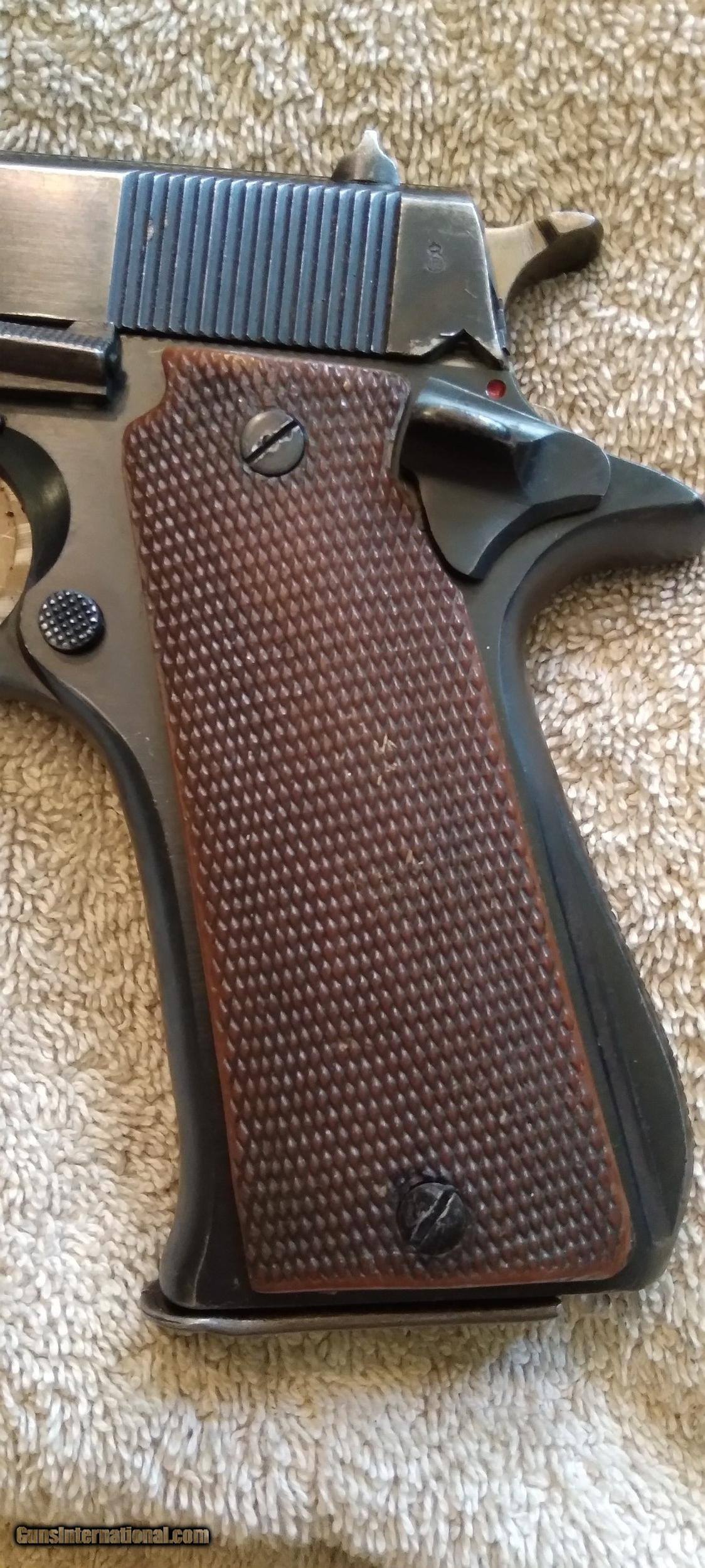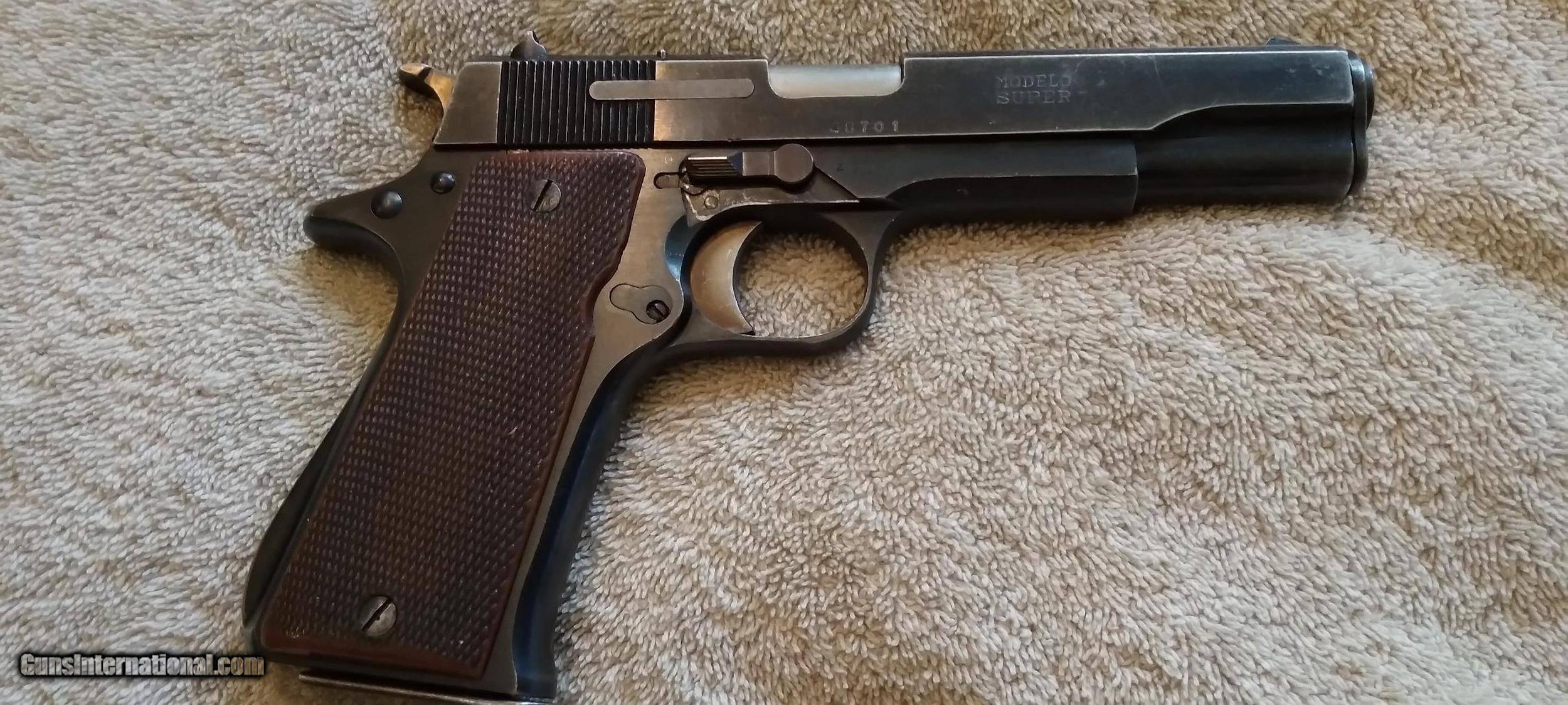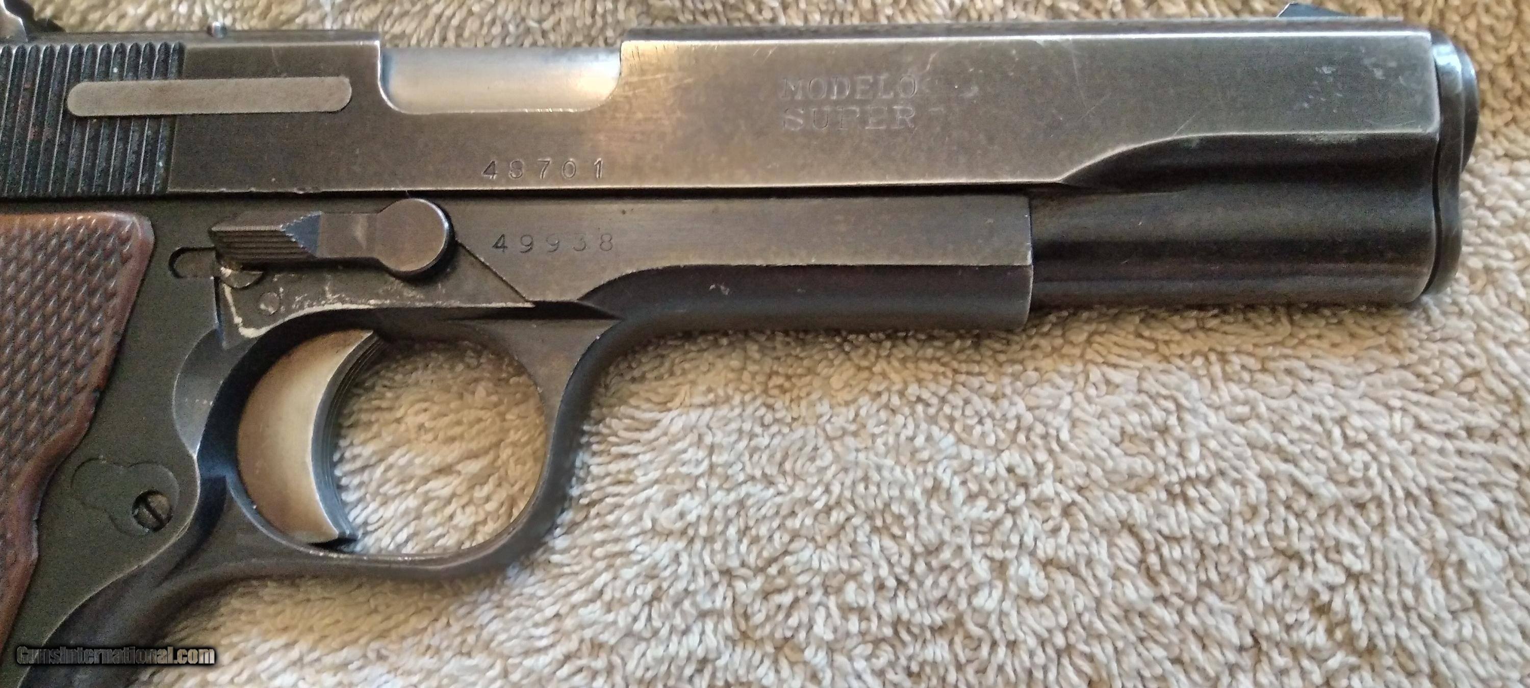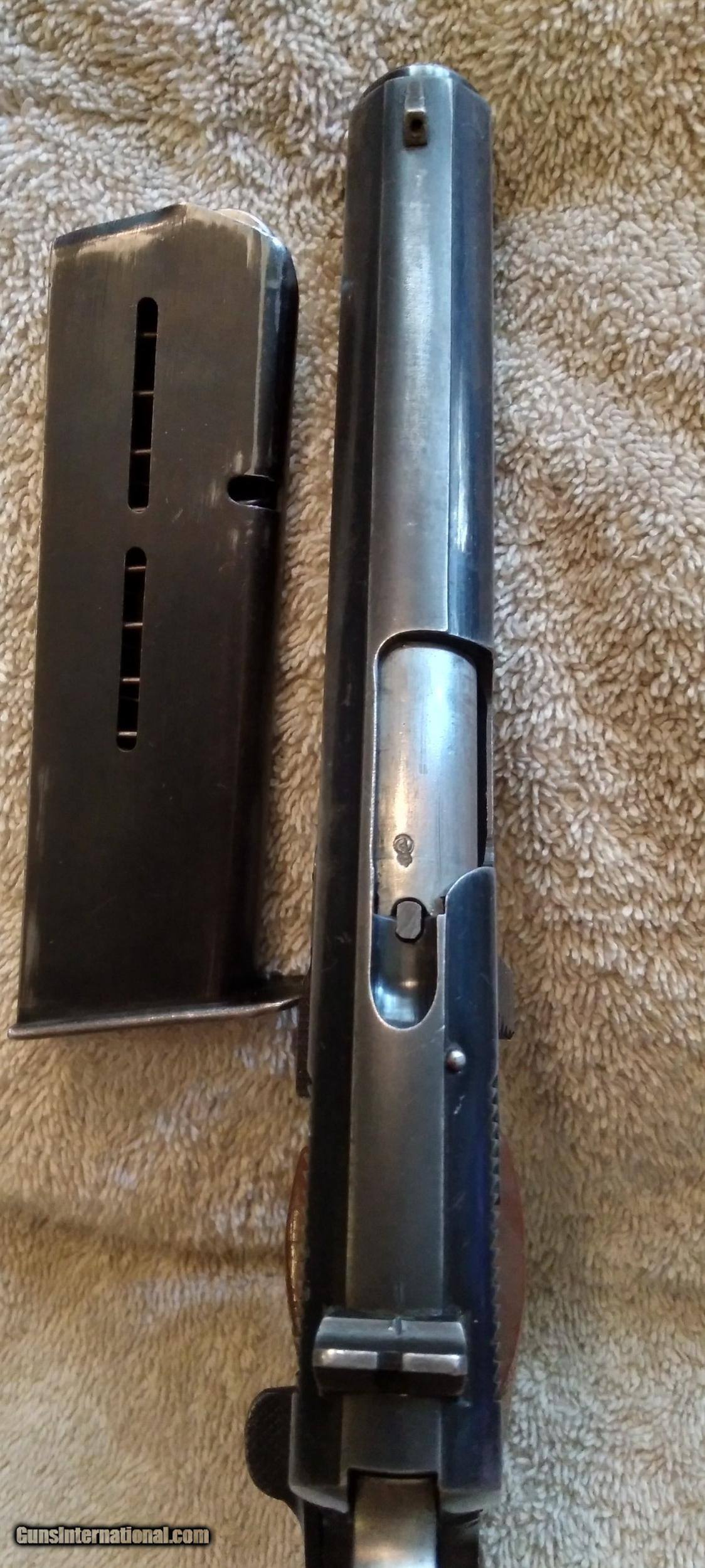 Description: STAR B ECHEVERRIA EIBER-ESPANA SUPER BS THIS IS A SECOND MODEL BS WITH MAGAZINE SAFETY (S) 1972 MANUFACTURE S/N 49938 NON MATCHING S/N ON 1972 MANUFACTURED SLIDE SINGLE ACTION AUTOMATIC CALIBER 9MM UNIQUE TAKE DOWN LEVER ON THE RIGHT SIDE OF THE FRAME WILL RELEASES SLIDE FROM FRAME WHEN PUSHED DOWN AND FORWARD TAKEDOWN LEVER IS A NEW EXTRA THICK HEAVY DUTY LEVER FIXED WHITE DOT SIGHTS WHITE IS MOSTLY GONE MAGAZINE SAFETY ONE MAGAZINE AND A SPARE WOLF EXTRA POWER RECOIL SPRING LOADED CHAMBER INDICATOR PROOF MARK ON BARREL CHAMBER IN FRONT OF LOADED CHAMBER INDICATOR PROOF MARK ON THE LEFT REAR OF SLIDE BLUING IS WORN AND THINNING ON SLIDE, FRAME AND THE FRONT AND REAR GRIP STRAPS LIGHT SCRATCHES ON SLIDE BORE IS EXCELLENT BRIGHT AND SHINY EXCELLENT RIFLING GRIPS ARE GOOD WITH SOME WEAR NO CHIPS OR CRACKS NO RUST NO IMPORT MARK MUST SHIP TO A FFL SOLD Curio/Relic: Yes Handgun Caliber: 9x19mm Parabellum (9mm Luger, 9x19mm NATO) Manufacturer: STAR Model: SUPER BS Serial Number: 49938 Barrel Length: 5 in Bore: BRIGHT AND SHINNY Condition: GOOD Metal Condition: GOOD Wood Condition: GOOD Bore Condition: Excellent Manufacture Date: 1972 |