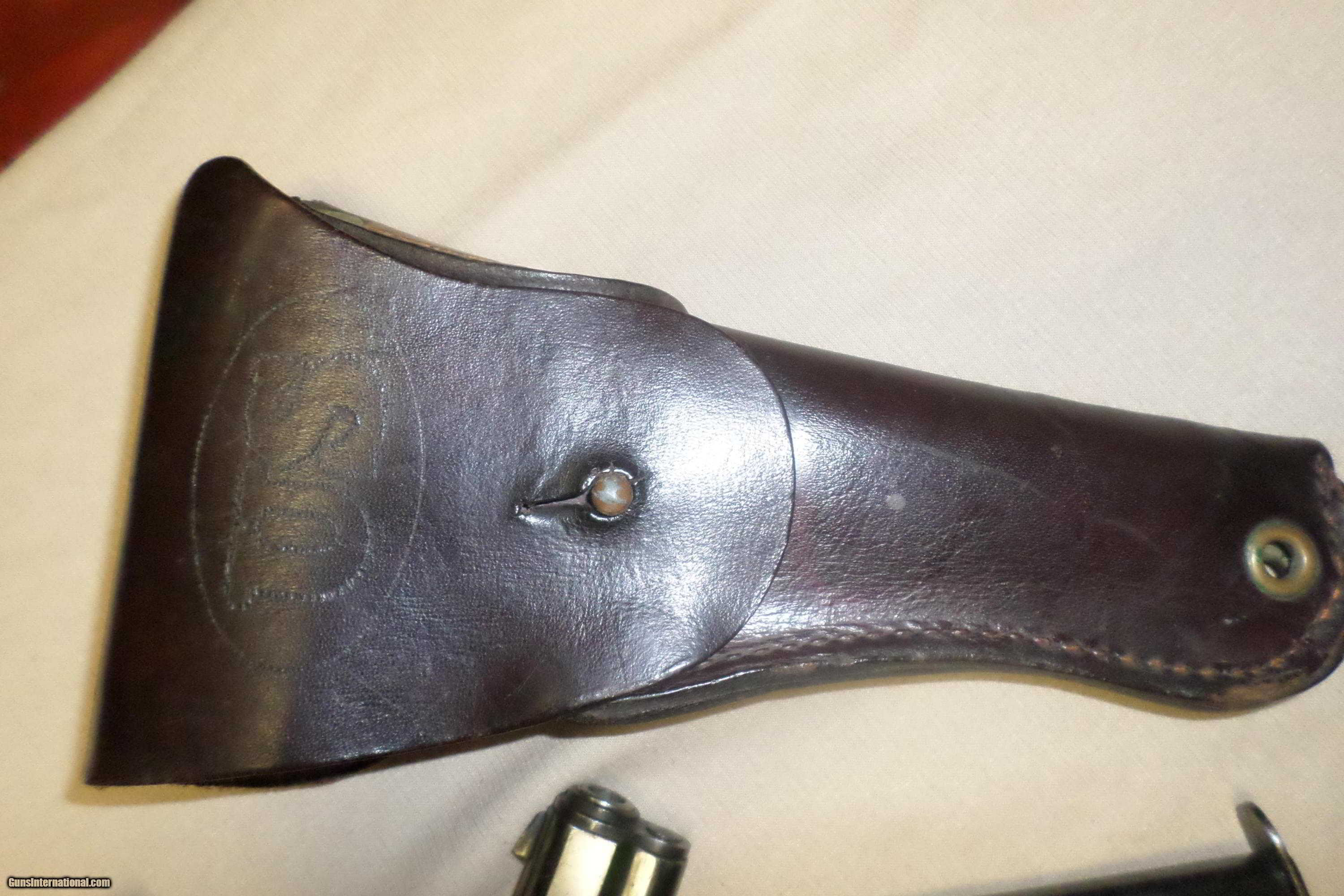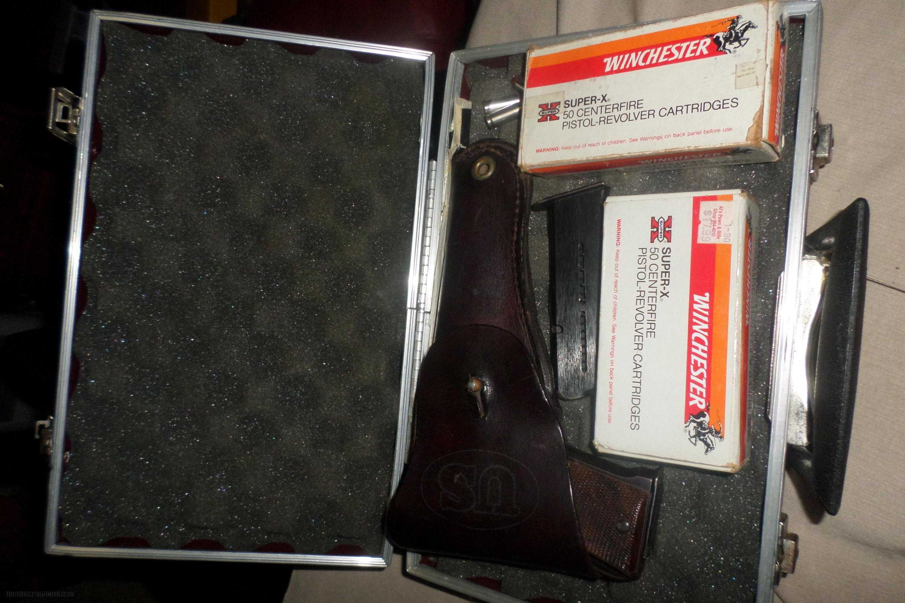 Description: wooden Grips issued to Spanish Civil Guard. Comes w/2 boxes of 38 Super ammo, U.S 1911 45 WWII leather holster, and lock-up case. SOLD |