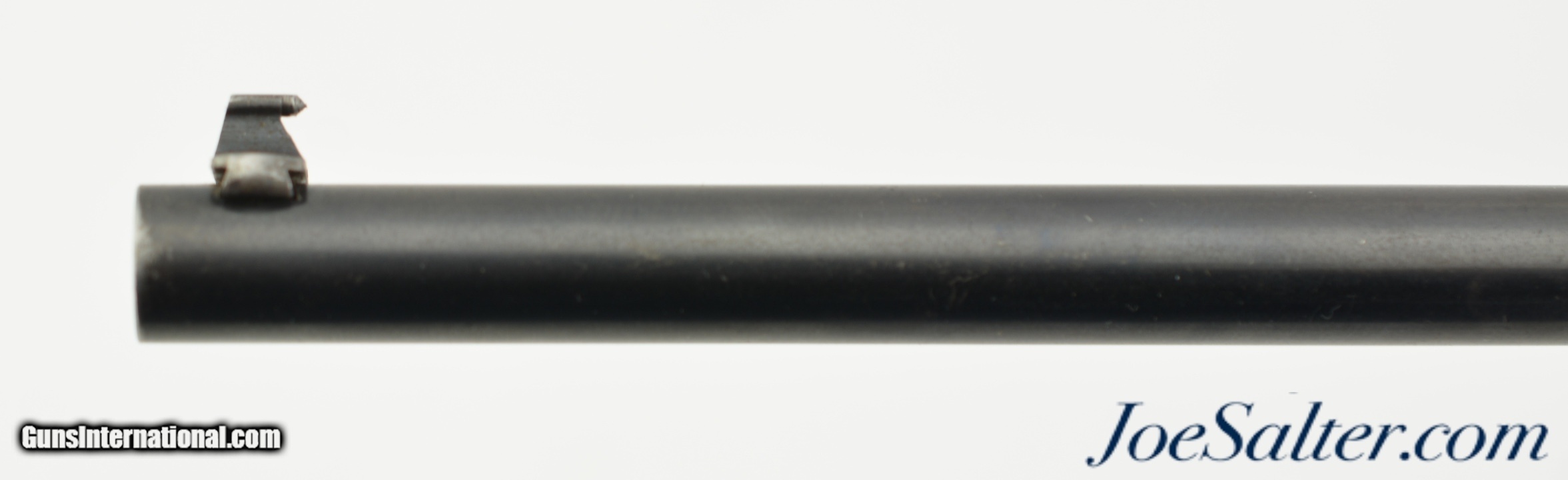 Description: Serial #95808, .22 Short, 6 inch barrel with a very fine, slightly rough bore with good rifling. This is the second issue, Diamond No. 43 tip-up pistol manufactured by J. Stevens A. & T. Co. from 1896-1916. This excellent example features a nickel plated frame and adjustable rear sporting sight. The barrel retains about 95-98% of the original blue finish with slight loss around the muzzle and very light use marks along the barrel. The nickel plating on the frame is likewise excellent with the only loss along the grip straps and the balance remaining very bright. The walnut grips are numbered to the gun and ?rate excellent. The lock up is tight with only very slight vertical movement and the hammer holds at half and full cock with a crisp trigger pull. An excellent example of a classic early target pistol not often found in such high condition. FFL or C&R SOLD Curio/Relic: Yes |