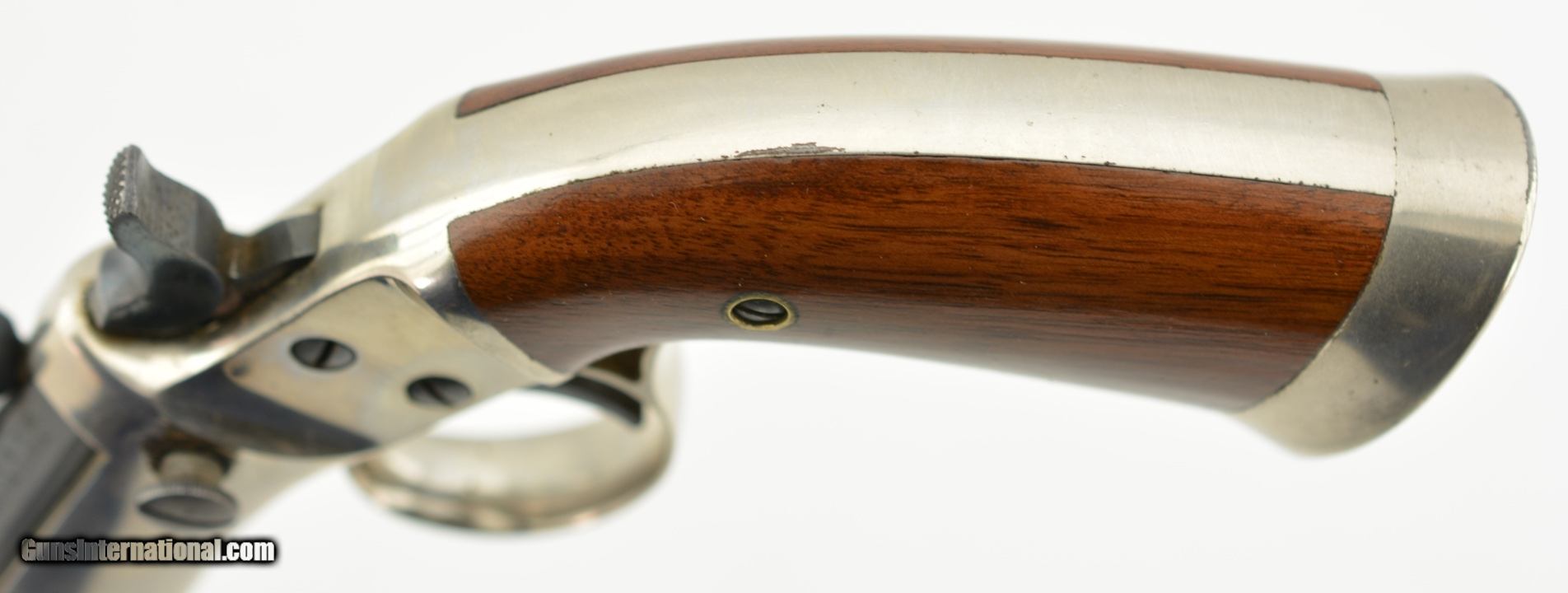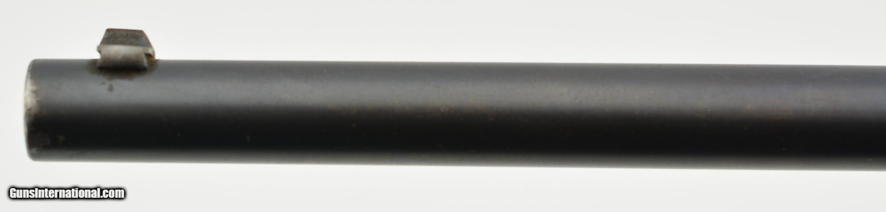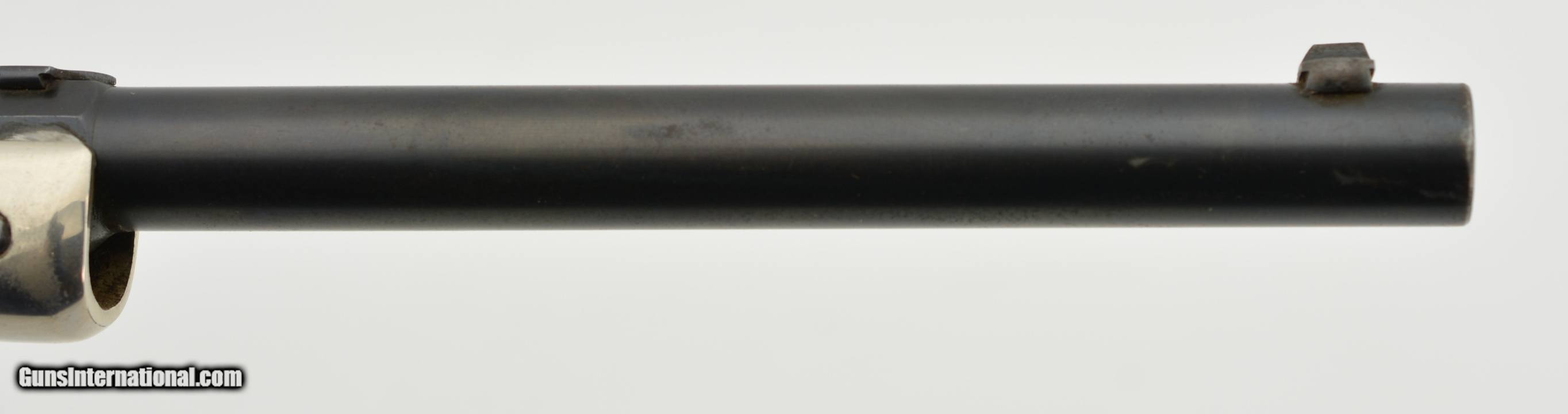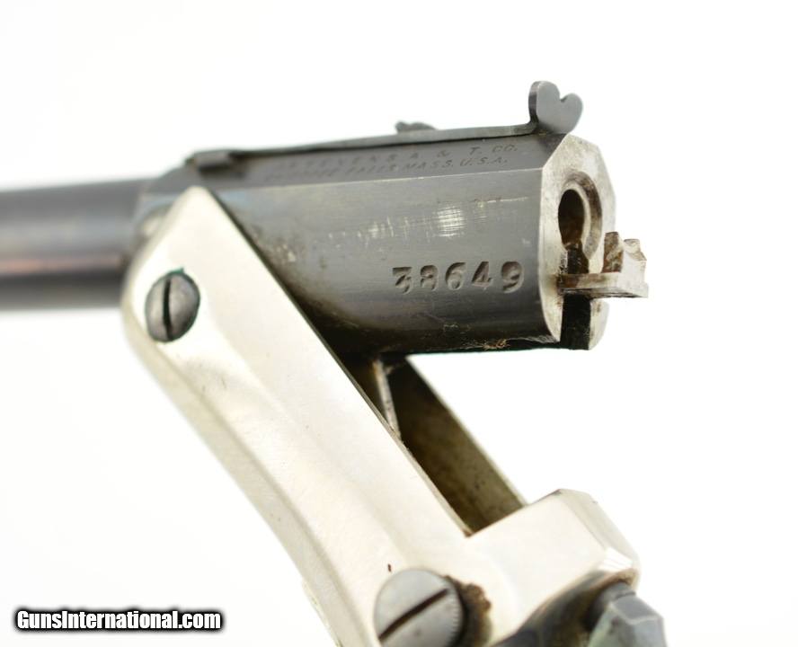 Description: Serial #38649, .22 LR, 8 inch barrel with a very good bore a few spots of pitting along bottom about half way to the muzzle and overall strong rifling. This is the No. 35 Offhand Target Pistol manufactured from 1907-1916 by J. Stevens A. & T. Company in Chicopee Falls, Mass.. In excellent overall condition the barrel retains about 90-95% blue finish showing some scattered freckling and mild thinning visible under bright light. The frame and trigger guard retain about 97% original nickel finish with a few tiny flakes and light handling marks and the remaining small parts retain strong bright blue. The smooth walnut grips are excellent, the original sights are intact, barrel-to-frame fit is solid and the action seems to function well mechanically. FFL or C&R SOLD Curio/Relic: Yes |