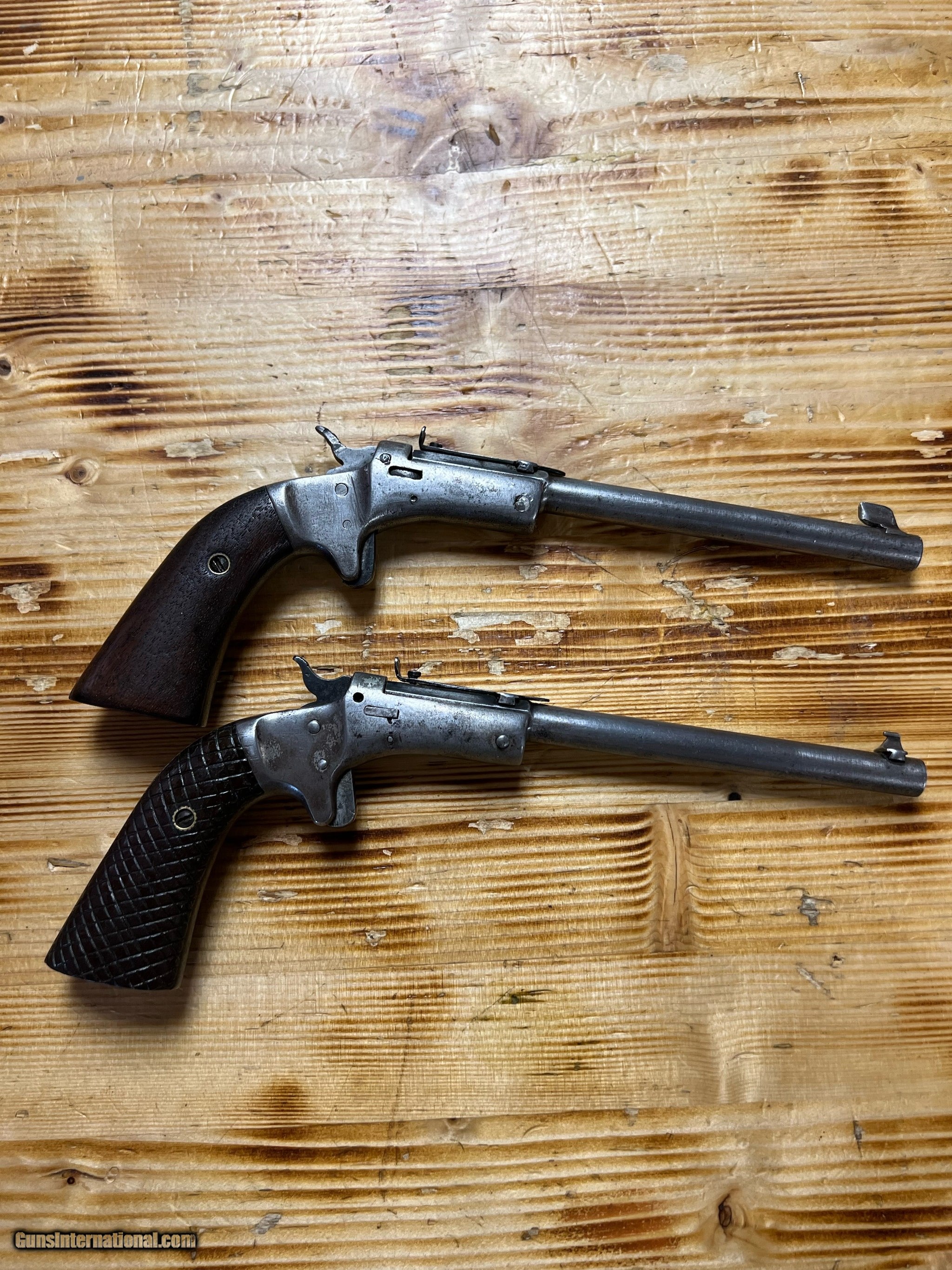 Description: Guns Listing ID: 567105 This is pair of J Stevens A&T Co. Model 41 Pocket Pistols. These firearms are in fair condition and show signs of wear and use such as scratches, scuffs, and other wear marks. One pistol has checkered wood grips the other has smooth wooden grips. Includes a wooden display box. SOLD Manufacturer: J STEVENS A&T CO. Model: Model 41 Caliber Info: 22 SHORT Condition: Used - Non-Certified Barrels: 6 BARREL Finish: STEEL |