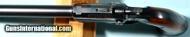 Description: J. STEVENS ARMS CO. OFFHAND NO. 35 SINGLE SHOT.22 LR CAL. 12 ¼” PISTOL CA. 1924. The last of the J. Stevens Arms Company tip-up pistols with scarce longest barrel length and factory original blue frame and extended grip cap of “Lord” type. Factory “Elevator” rear and bead front sights. Brilliant about new original condition with 100% original blue. Walnut two piece grips in mint condition. Looks unfired and has a mint bore. Perfect working order. Nicest one we have had. SOLD Curio/Relic: Yes |