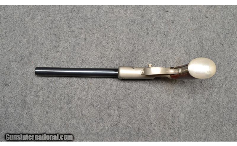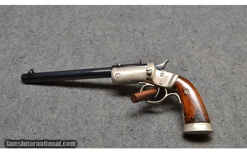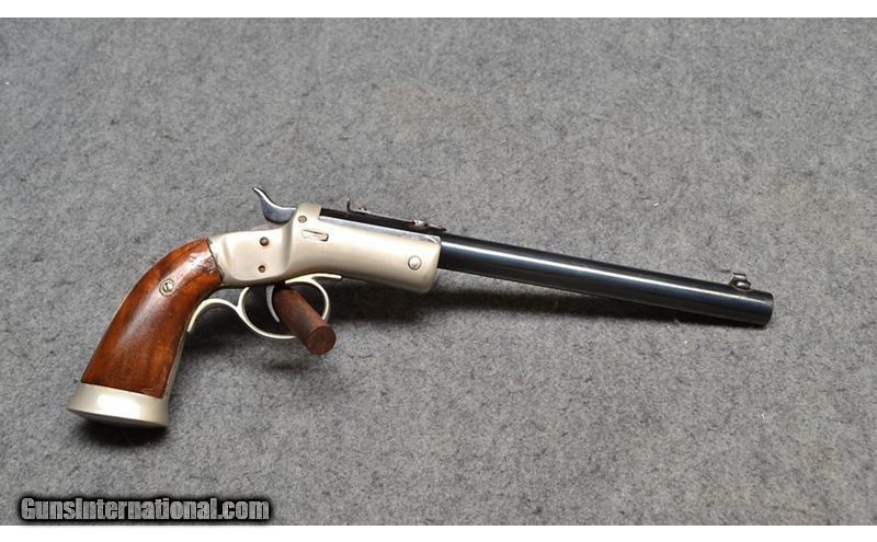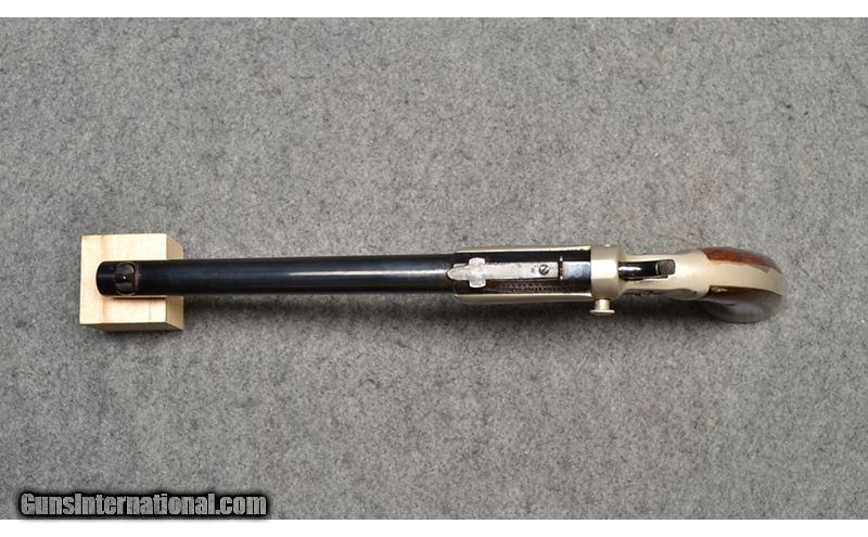 Description: This pistol is a J. Stevens break open single shot. It has a buckhorn rear sight and wooden grips. It is in fair condition overall, with signs of use and age throughout. It comes with a leather holster and belt. None SOLD Metal Condition: "Fair, receiver has several large spots of finish loss and corrosion, barrel has light scratching throughout Wood Condition: "Fair, grips have lots of light scratches, nicks, and scuffs Bore Condition: "Bright, light corrosion throughout, rifling still visible Barrels: 8 Fore End: Wooden grips Weight: 1lb 10oz Sights: "Pin front sight, buckhorn rear sight Item Location: Wichita, KS |