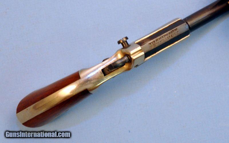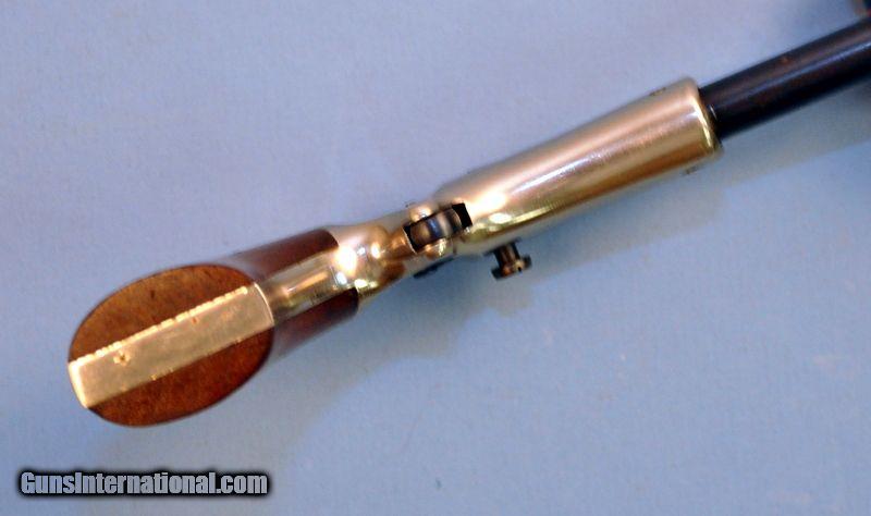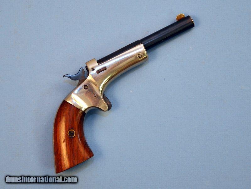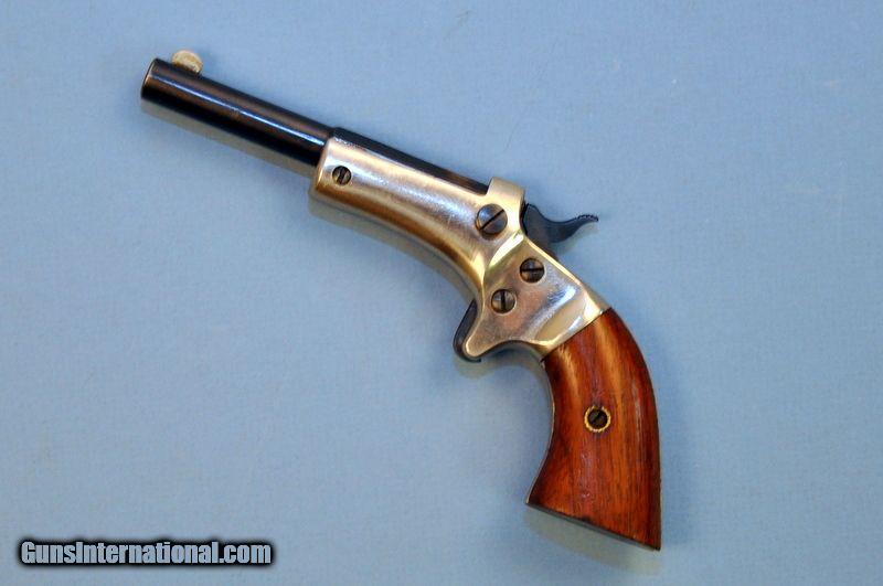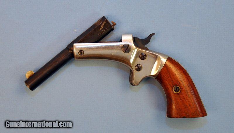 Description: 22 short. S# 850XX. 3-1/2" barrel with blade front sight. Nickel finished spur trigger action. 2 peice walnut grips. 90% dull lightly faded bbl. blue. 95% nickel. Grips show small marks. Bore is brighjt with strong rifling. Shipping to FFL or C&R $15.00. SOLD Curio/Relic: Yes |
