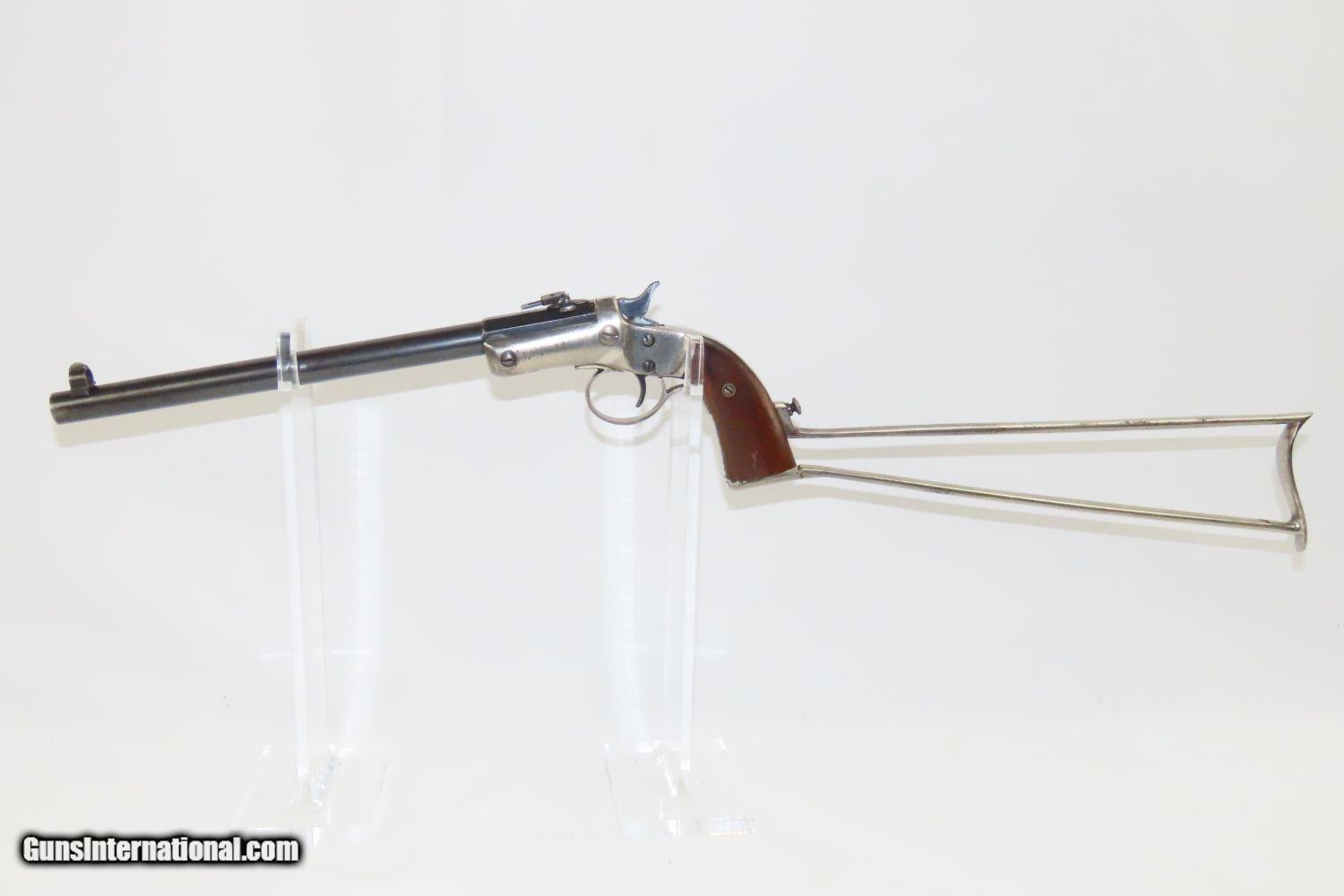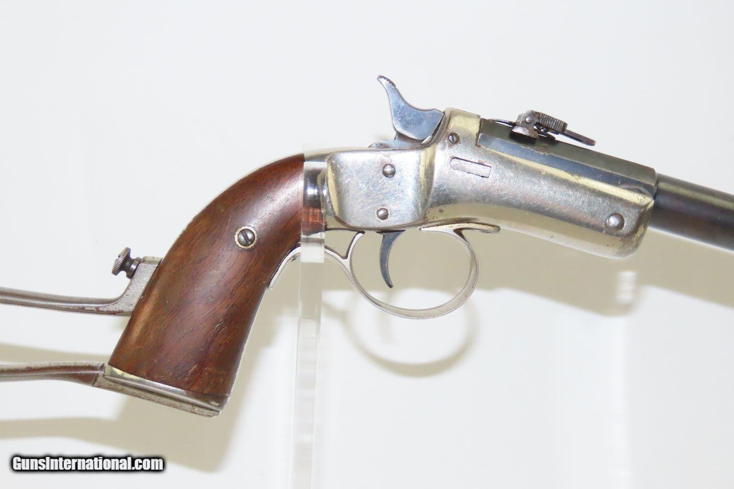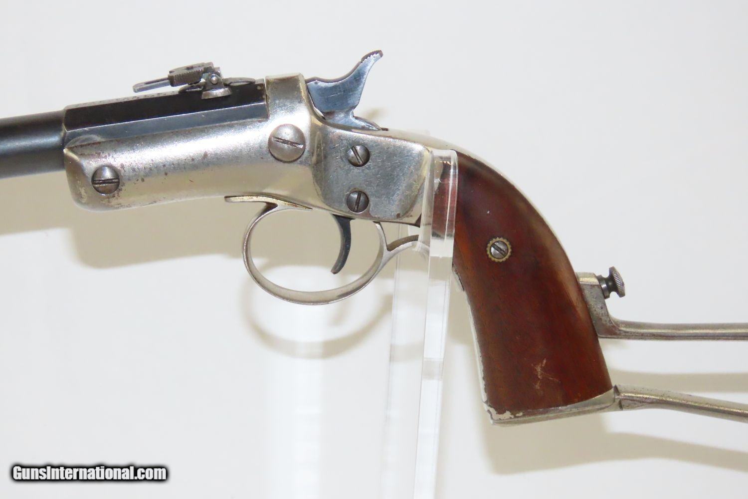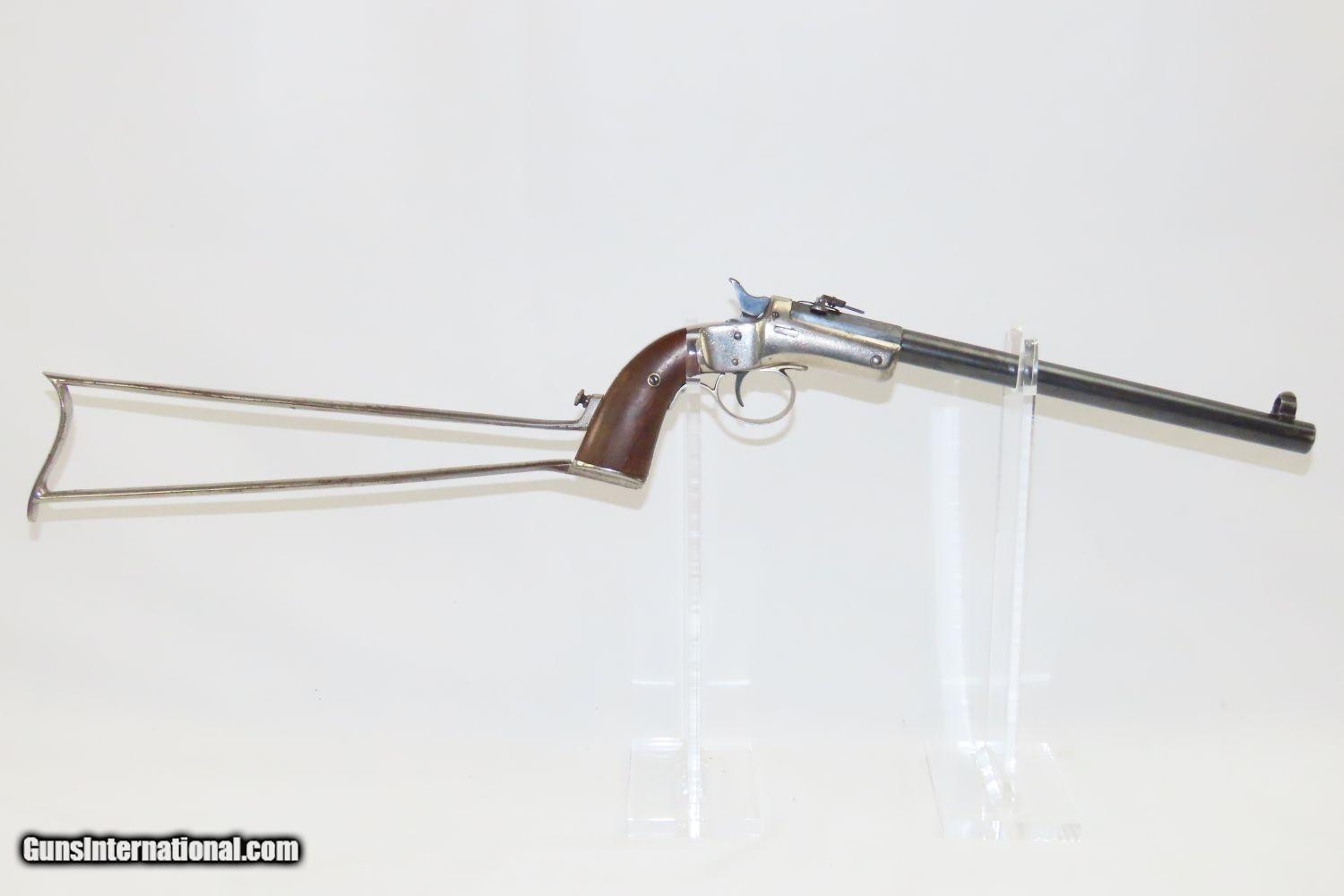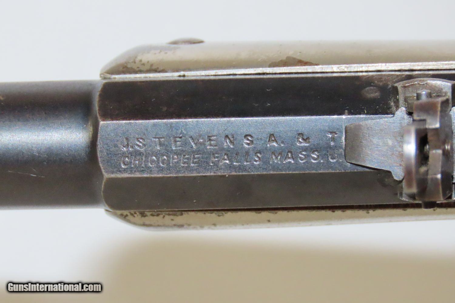 Description: LONG-BARRELED J. STEVENS ARMS Company New Model Number 40 POCKET RIFLE C&R Single Shot with Matching Number Shoulder Stock! Here we present a J. Stevens Arms Company New Model Number 40 Pocket Rifle, manufactured around the turn of the century in Chicopee Falls, Massachusetts. About 15,000 of these pocket rifles were produced between 1896 and 1916. This pistol was considered one of the most accurate target pistols of the day and comes with the original matching numbers attachable wire stock. It features a 10-inch bull barrel and a weighted pommel for balance. The action is single action only with a crisp trigger. The overall condition is fine. The action is strong. The bore is nice and bright with sharp rifling. The numbers on the frame and stock match. Here is a very nice Stevens pocket rifle to collecting or to display. This firearm is classified as a Curio & Relic. Barrel is 10 inches. Caliber: .22 Rimfire Overall condition as seen in photos. Very Fast. Very Safe. FREE SHIPPING. Will need to be sent to your local FFL or C&R licensee. This firearm is classified as a Curio & Relic. Guaranteed AUTHENTIC & Includes CERTIFICATE OF AUTHENTICITY. ancestryguns $1350 #20481 SOLD Curio/Relic: Yes |