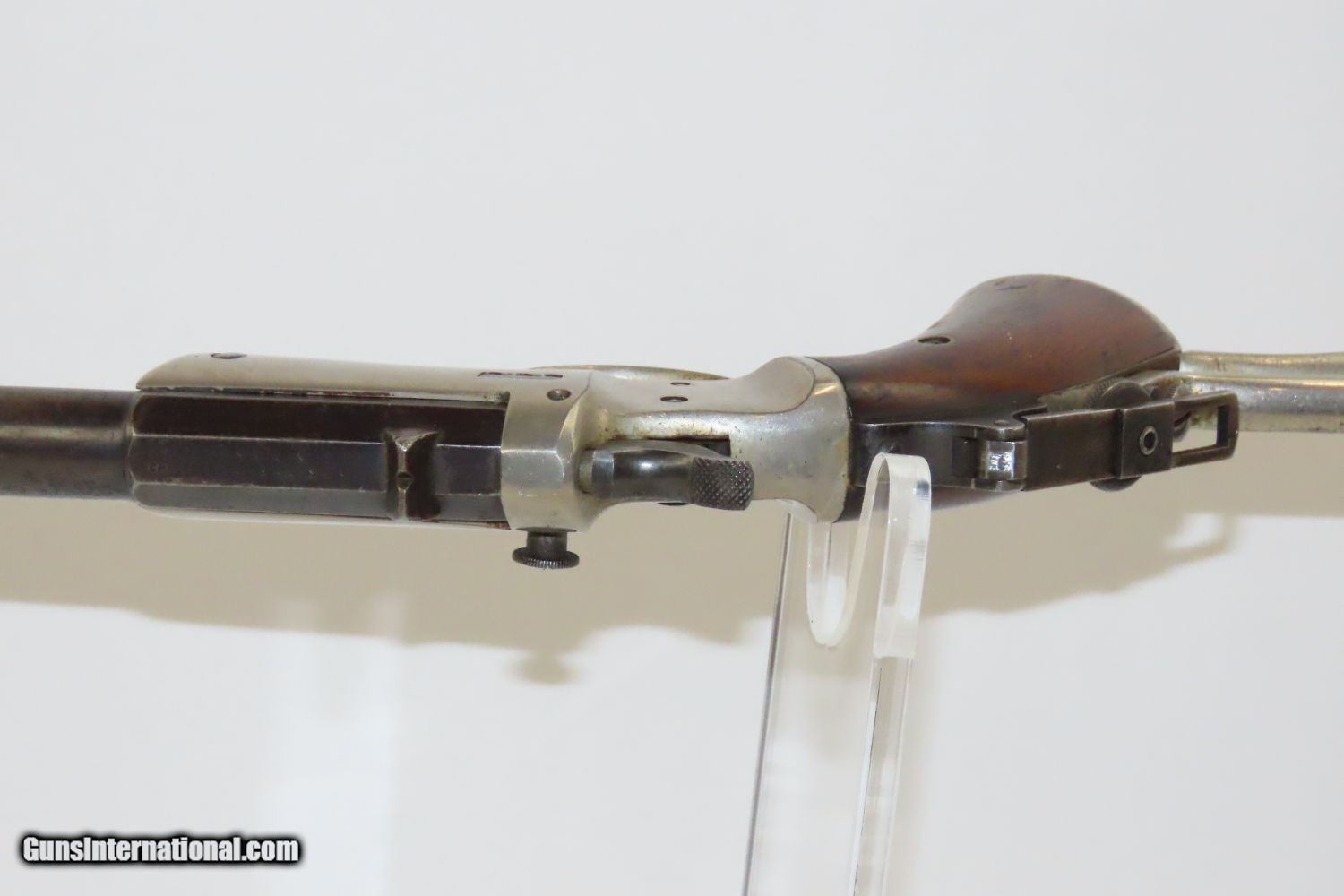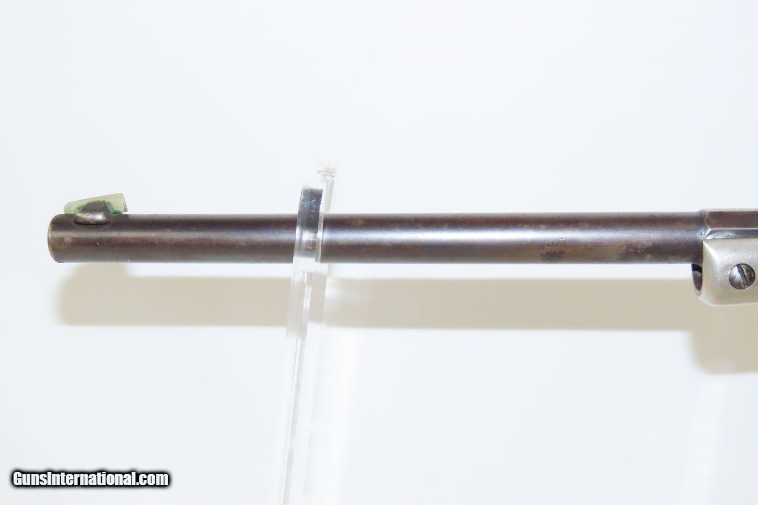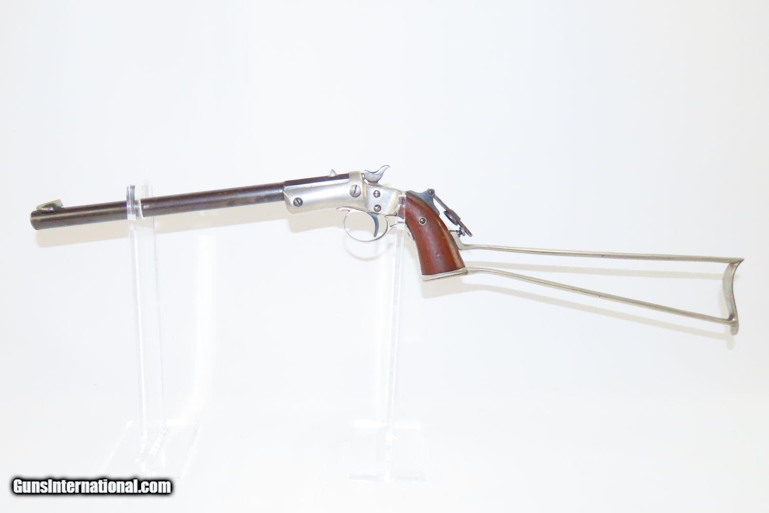 Description: LONG-BARRELED J. STEVENS & Company New Model Number 40-1/2 C&R POCKET RIFLE SCARCE With Matching Number Shoulder Stock and Tang Mounted Sight! Here we present a J. Stevens Arms Company New Model Number 40-1/2 Pocket Rifle, manufactured circa the turn of the century in Chicopee Falls, Massachusetts. It is similar to the Number 40, with a Vernier tang sight mounted on the backstrap. About 2,500 of these pocket rifles were produced between 1896 and 1915. This This pistol was considered one of the most accurate target pistols of the day and comes with the original attachable wire stock. It features am 10-inch bull barrel and a weighted pommel for balance. The action is single action only with a crisp trigger. The overall condition is fine. The action is strong, and the bore is bright with nice rifling. This example features a rear peep sight and matching number shoulder stock! Here we have a neat piece to supplement any collection! This firearm is classified as a Curio & Relic. Barrel is 10 inches. Caliber: .22 Rimfire Overall condition as seen in photos. Very Fast. Very Safe. FREE SHIPPING. Will need to be sent to your local FFL or C&R licensee. This firearm is classified as a Curio & Relic. Guaranteed AUTHENTIC & Includes CERTIFICATE OF AUTHENTICITY. ancestryguns $1650 #20482 SOLD Curio/Relic: Yes |
