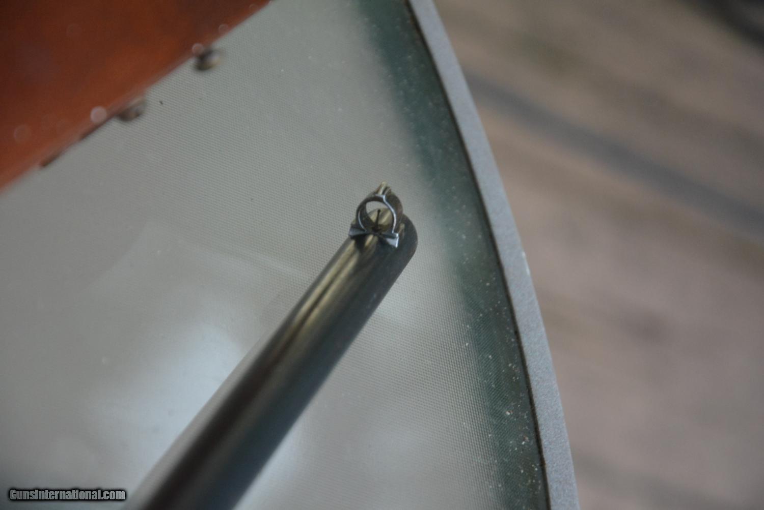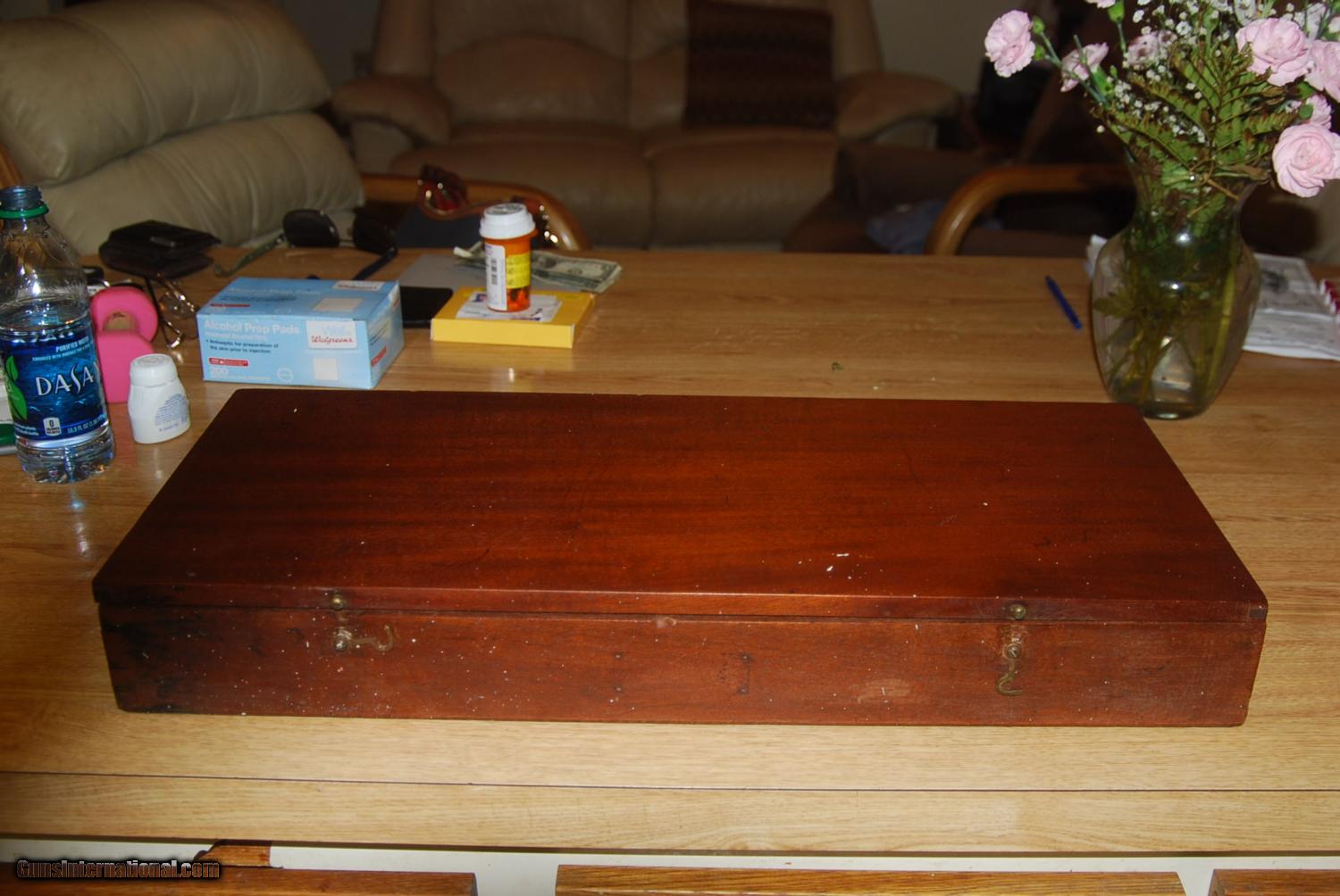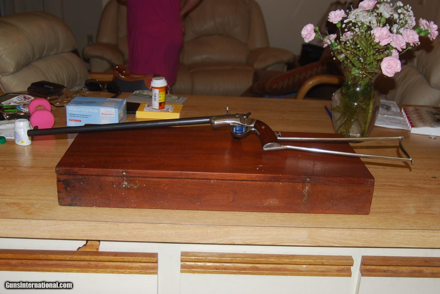Description: The action works just fine with ejector to release shell . the finish is 98% thinning blue on this rare 18inch round barrel.The bore shows some black powder etch with shine and very good rifeling.. there is some nickle flaking on the reciver and trigger guard, the wood is walnut and is very good show 90% original varnish no cracks or chips. The rear sight is an adjustable peep range is adjustable, has that irradesent blue. when you hold it to the sun light. Front sight is a pin point hooded globe type sight.. Serial number is a 5 diget and matches the skelton stock which is nickle plated.. this also come in a 24 inch X 12 cased walnut box with geen felt. the out side of box shows white paint spatters i did nt try to clean.. This also come with Die set for 32 rim fire, bullets, caps, and brass, also has brass cleaning rods with wood handes and extra flate driver,,,,,,,,,,I wanted to note the wood box is dove tailed at the corners and hinges are brass as well screws used to fasten . I would think is circa about 1890. this will shipp as antique........ this is just a lovely set,,,,,,,,I ship to the world...... SOLD Curio/Relic: Yes Antique: Yes |