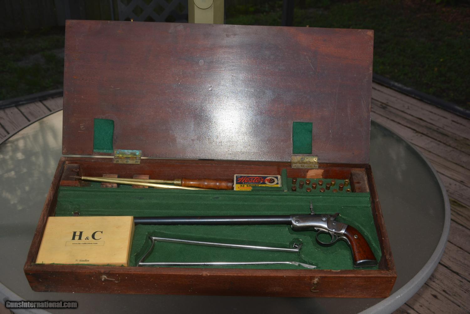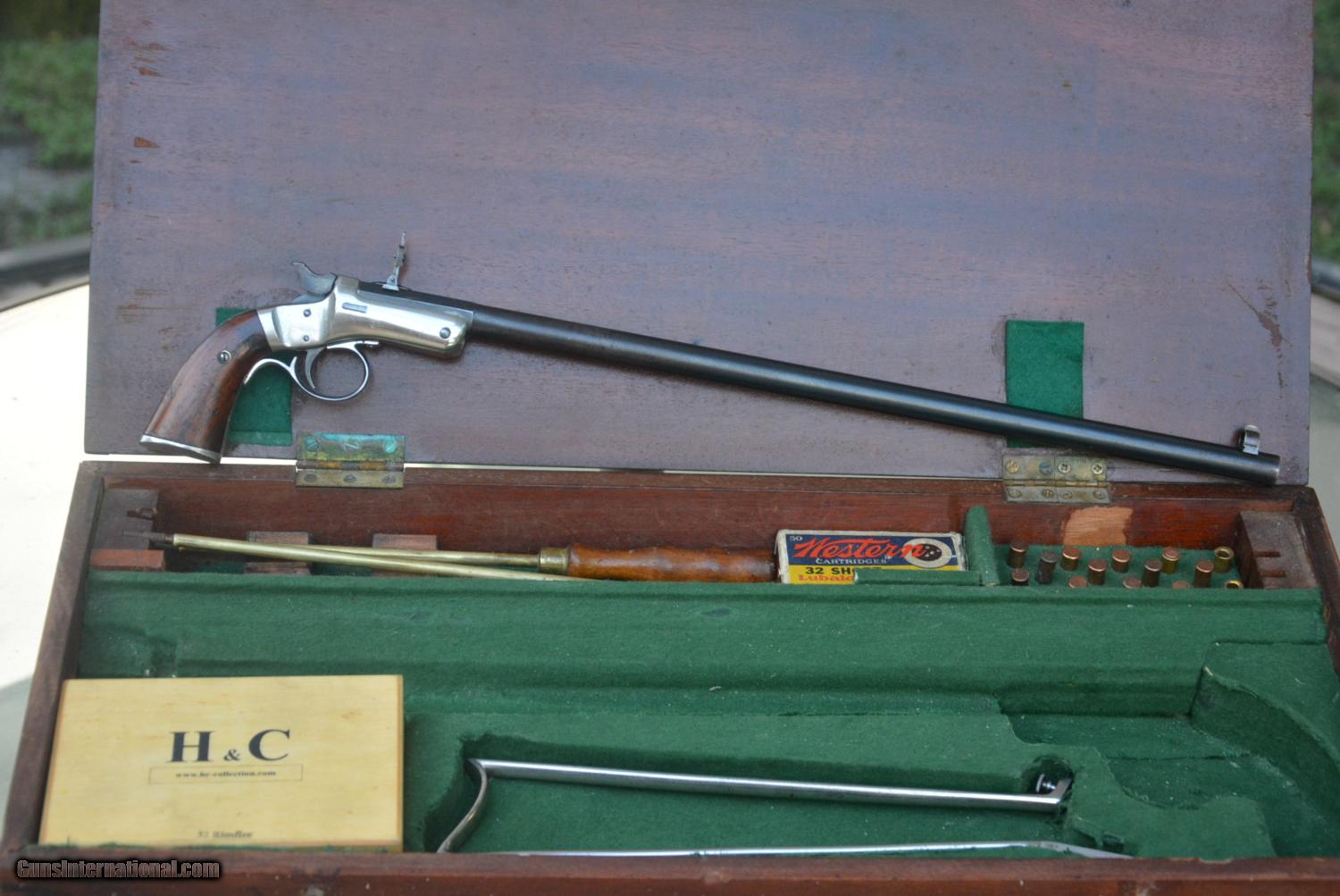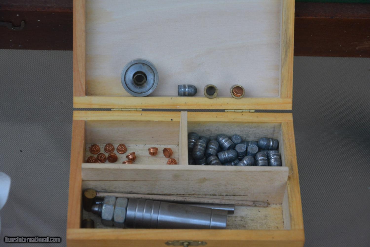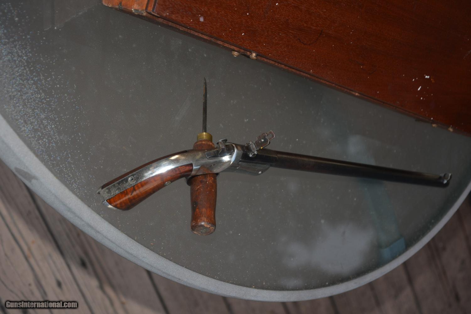 Description: The action works just fine with ejector to release shell . the finish is 98% thinning blue on this rare 18inch round barrel.The bore shows some black powder etch with shine and very good rifeling.. there is some nickle flaking on the reciver and trigger guard, the wood is walnut and is very good show 90% original varnish no cracks or chips. The rear sight is an adjustable peep range is adjustable, has that irradesent blue. when you hold it to the sun light. Front sight is a pin point hooded globe type sight.. Serial number is a 5 diget and matches the skelton stock which is nickle plated.. this also come in a 24 inch X 12 cased walnut box with geen felt. the out side of box shows white paint spatters i did nt try to clean.. This also come with Die set for 32 rim fire, bullets, caps, and brass, also has brass cleaning rods with wood handes and extra flate driver,,,,,,,,,,I wanted to note the wood box is dove tailed at the corners and hinges are brass as well screws used to fasten . I would think is circa about 1890. this will shipp as antique........ this is just a lovely set,,,,,,,,I ship to the world...... SOLD Curio/Relic: Yes Antique: Yes |