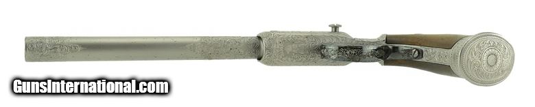 Description: Stevens 35 .22 LR caliber pistol. Beautifully engraved Stevens Tip Up. Bore is excellent. Receiver is engraved with scroll engraving and game scenes. Very elegantly done. Near excellent overall condition with some minor wear.