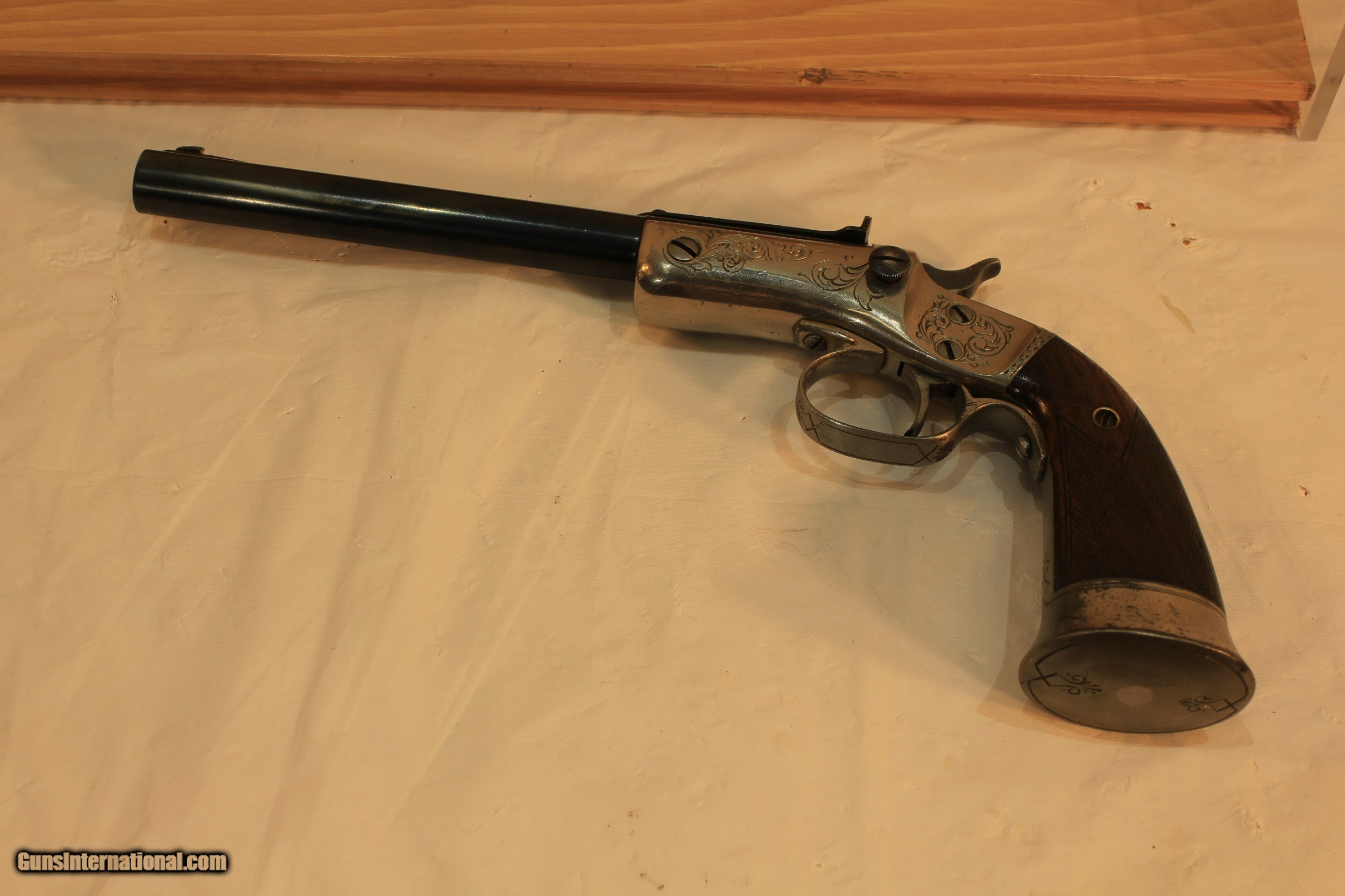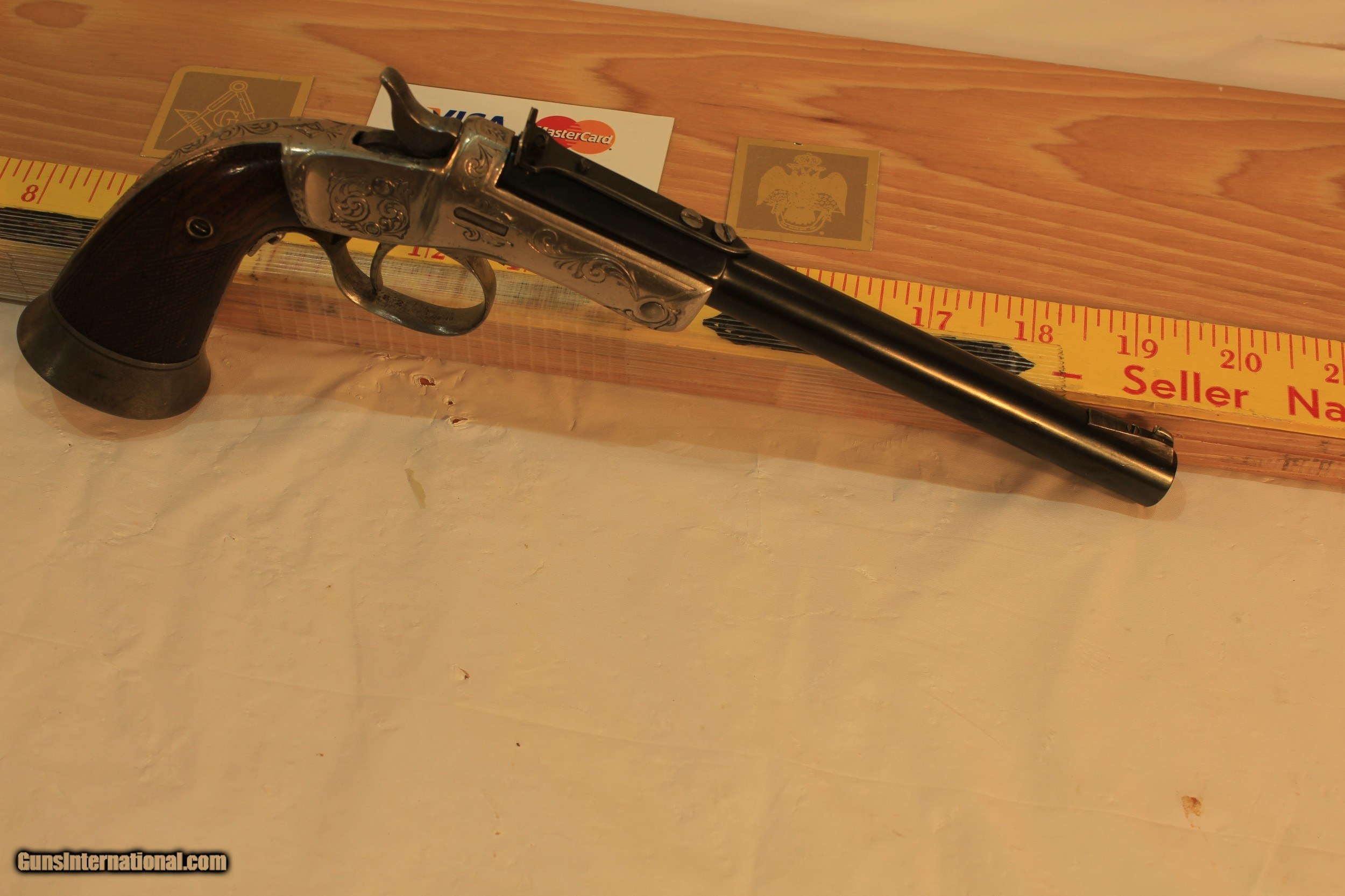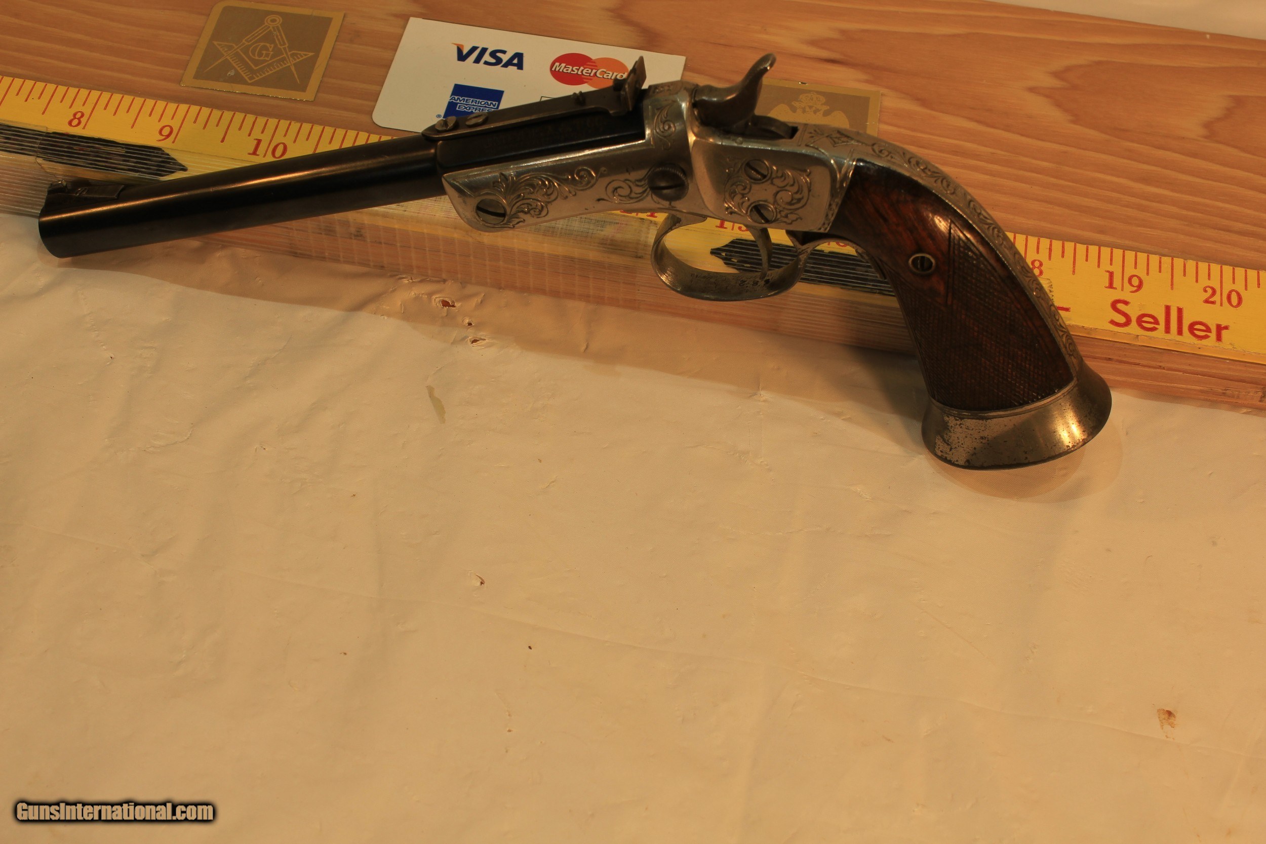 Description: This Stevens pistol is 22 LR and has a 7 inch barrel that has been very nicely relined and has a bright near excellent bore. The barrel of this pistol retains about 95%+ of excellent quality reapplied blue. The frame retains approximately 80% of the original nickel finish with most of the loss along the buttcap, the flaking blending in rather nicely with the gunmetal gray patina. The frame has been embellished with period light foliate scrollwork throughout. It is rather simple, but is of good quality. The hammer retains strong fire blue with overall silvering. The checkered walnut grips are pencil-numbered to the gun and remain in very good condition. What appears to be the original adjustable rear notch sight is intact, it has a couple of replacement screws that show moderate slot wear. The barrel is matching the frame, barrel to frame fit shows a hint of play and the action functions well. This pistol will make a good shooter with the relined bore. C&R OK $15.00 Shipping via Priority Mail. SOLD Curio/Relic: Yes |