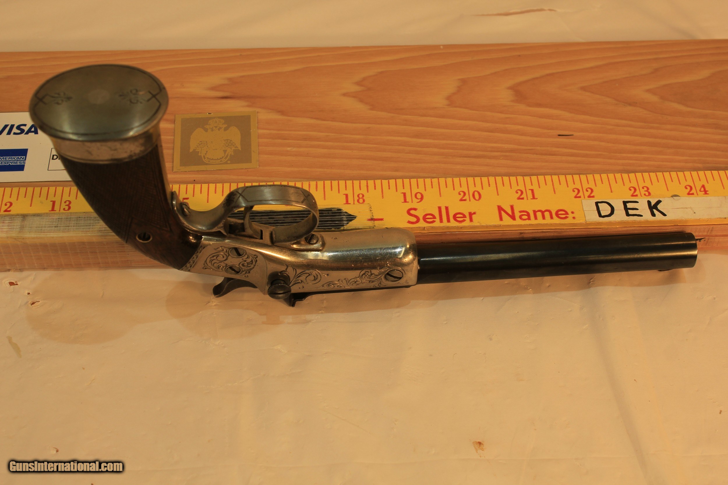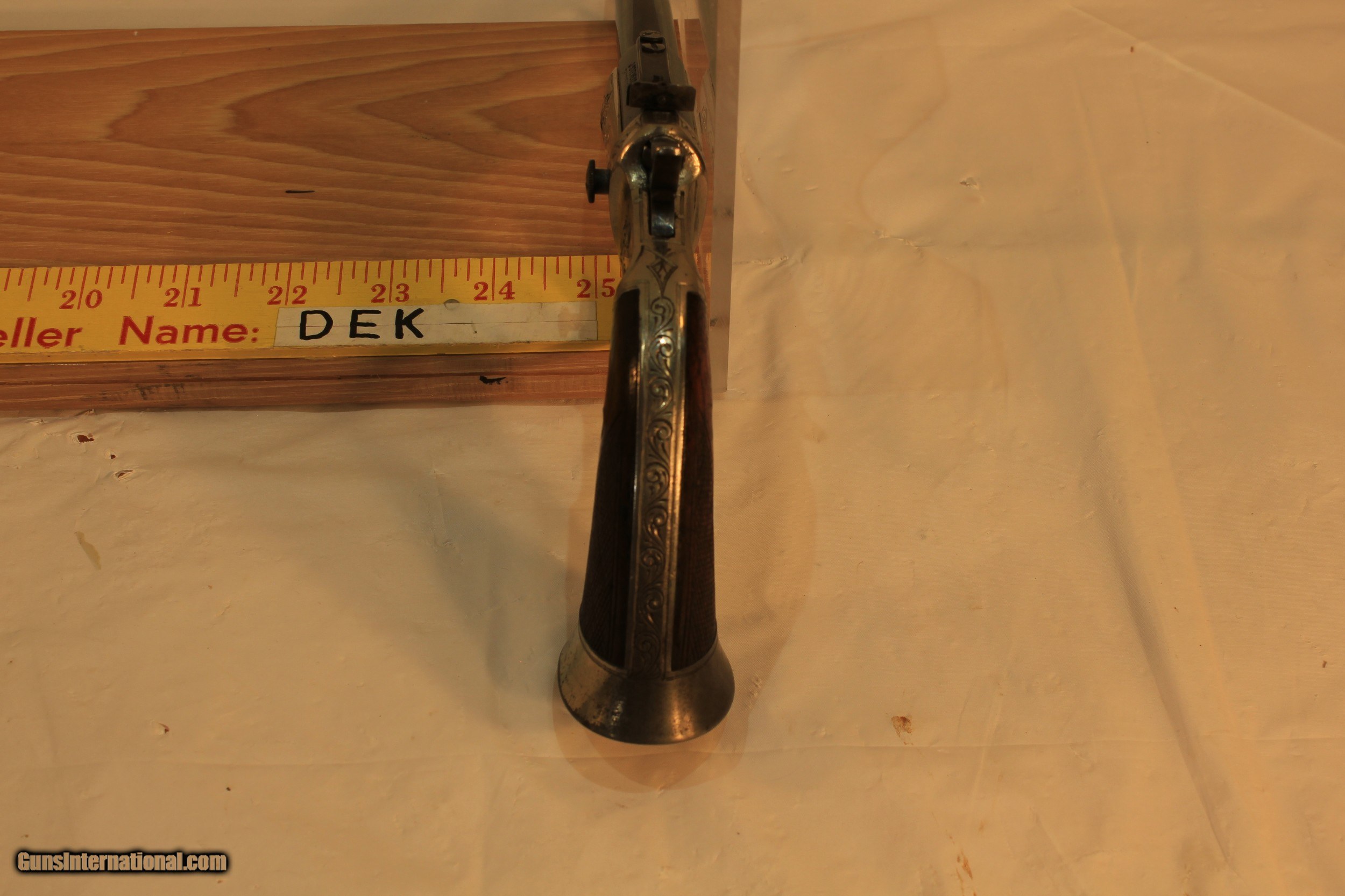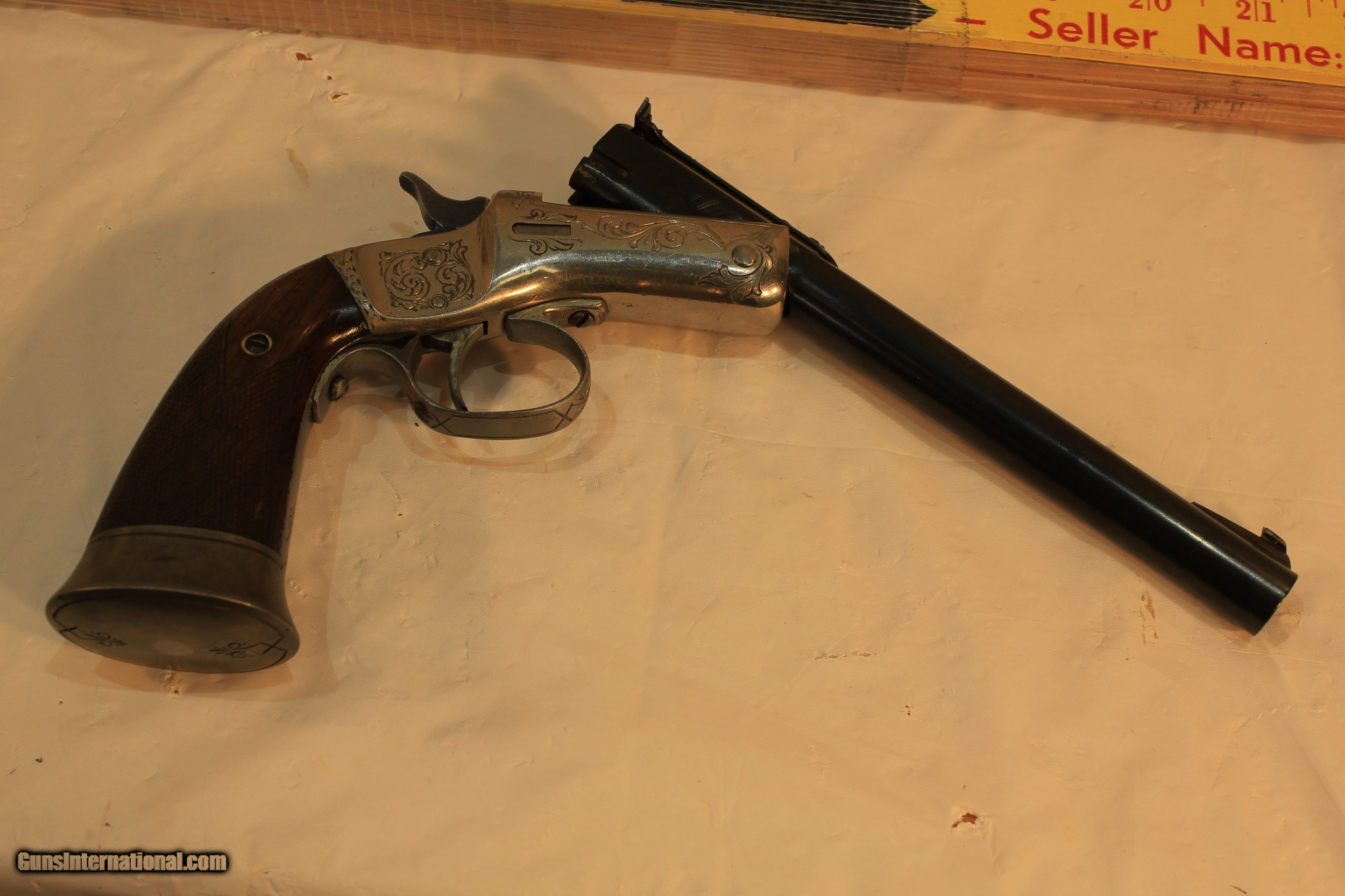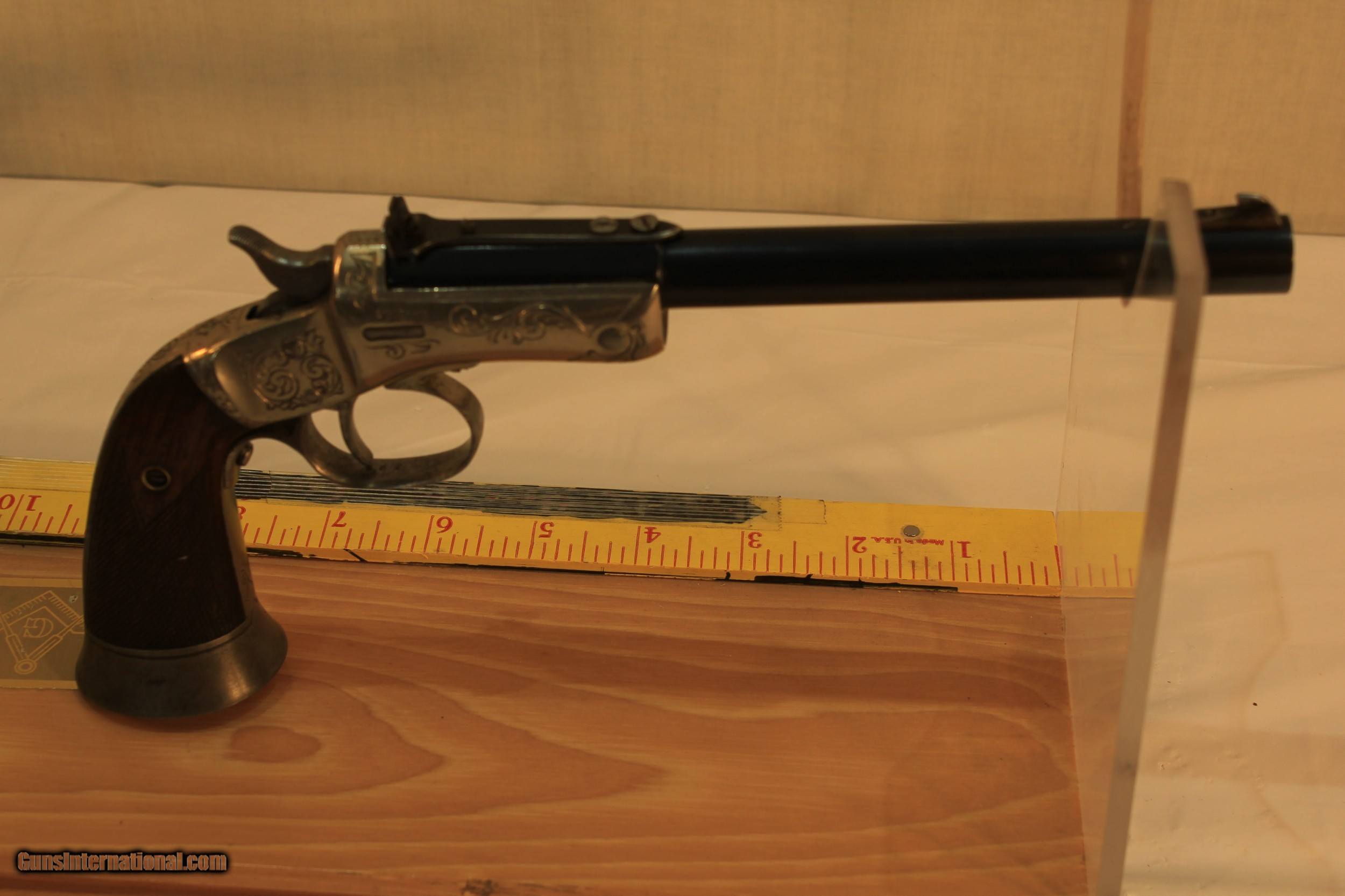 Description: This Stevens pistol is 22 LR and has a 7 inch barrel that has been very nicely relined and has a bright near excellent bore. The barrel of this pistol retains about 95%+ of excellent quality reapplied blue. The frame retains approximately 80% of the original nickel finish with most of the loss along the buttcap, the flaking blending in rather nicely with the gunmetal gray patina. The frame has been embellished with period light foliate scrollwork throughout. It is rather simple, but is of good quality. The hammer retains strong fire blue with overall silvering. The checkered walnut grips are pencil-numbered to the gun and remain in very good condition. What appears to be the original adjustable rear notch sight is intact, it has a couple of replacement screws that show moderate slot wear. The barrel is matching the frame, barrel to frame fit shows a hint of play and the action functions well. This pistol will make a good shooter with the relined bore. C&R OK $15.00 Shipping via Priority Mail. SOLD Curio/Relic: Yes |