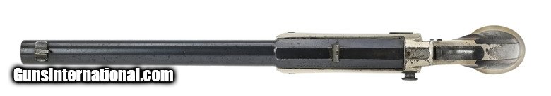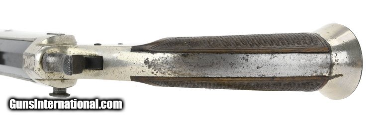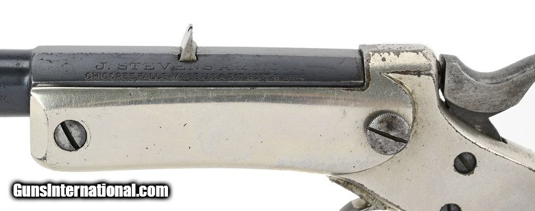 Description: Stevens-Lord No 36 Single Shot Pistol. The 10” part-round/part octagon barrel has approximately 95% blue. The .22 S & LR bore is fine. The nickel plate frame, grip straps, trigger guard, and butt have approximately 90% nickel. The very finely checkered grips have some wear but are in overall very good condition. The barrel marking is very lightly stamped with J. Stevens A&T Co./Chicopee Falls Mass, Pat. Sept. 6, 1864. This gun is circa 1890. The pistol is named for Frank Lord, a prominent shooter of the period. The action functions correctly. This is a nice example of an early .22 caliber target pistol. SOLD Antique: Yes |