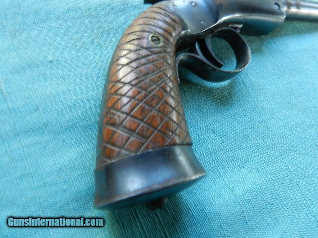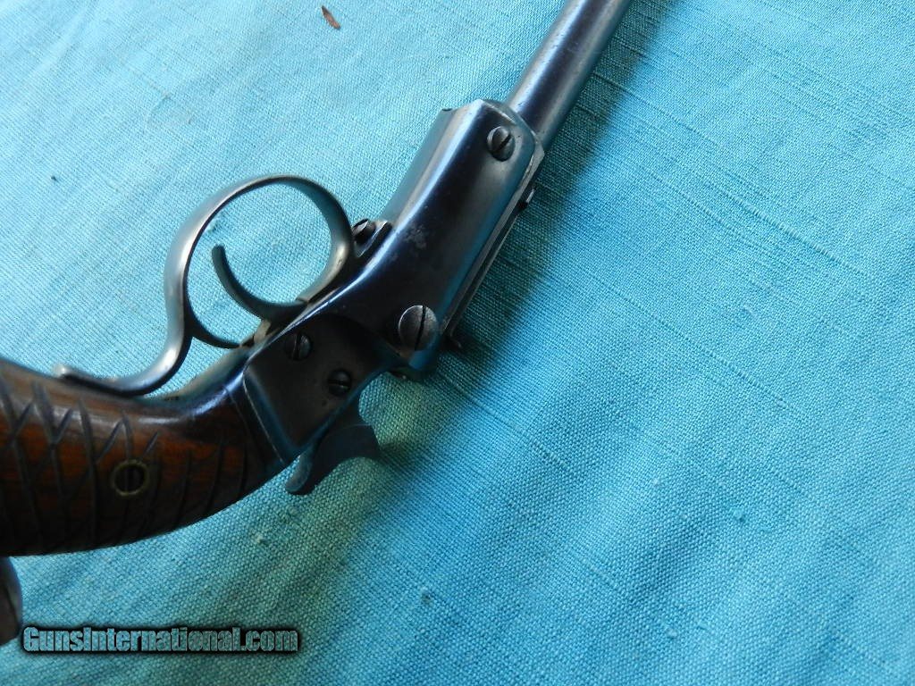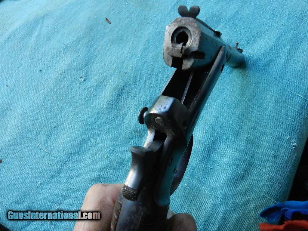 Description: SOLD A very clean No 35 Stevens target .22cal. pistol with a 6" with a mint, clean rifled bore, and the exterior metal is full blue that looks original with slight wear to the muzle and the front of the frame. Lock-up is tight, and the original American walnut grips have been hand checked for a better grip.This model has the fiting pin on the frame, and is a solid shooter.Couple spots of oxidation. The rear sight has the riser missing and I'll try to find one in time to ship.This is a C&R gun. When buying a gun always have it examined by a competent gunsmith before shooting. To buy a gun from me you must get a direct email for me, with details, and shipping cost. We don’t have a web site .I prefer money orders or a check. Item ships when funds come in. I try to keep guns affordable, which means I make less money than most dealers. You won’t get altitude sickness, or nose bleed, with my prices! I consistently have the best selection of older guns If you attempt to buy, you must still contact us for details . Best to email to buy. Sometimes a local person can stop buy and purchase before the gun is removed. Sometimes not home to get calls. Some guns are required shipment to a gun dealer near you for a transfer to you when it arrives. Otherwise many older or black powder guns ship to your door. With the widest selection of older guns at great prices, We don’t have a store, and sell on the internet only. I’m easy to get along with. Thank You SOLD |
